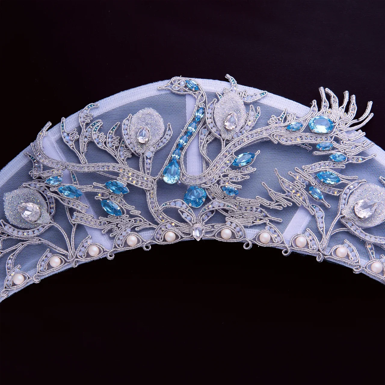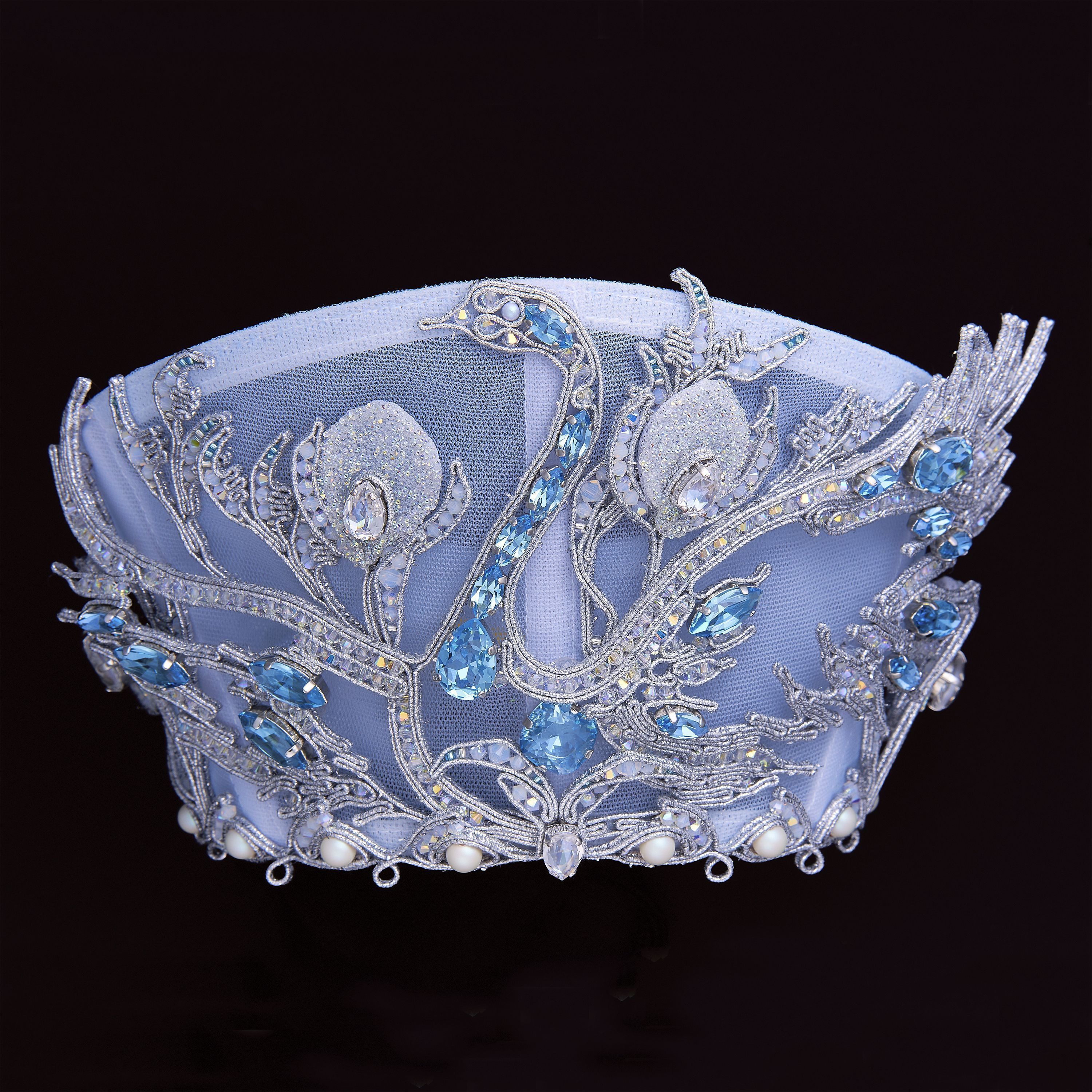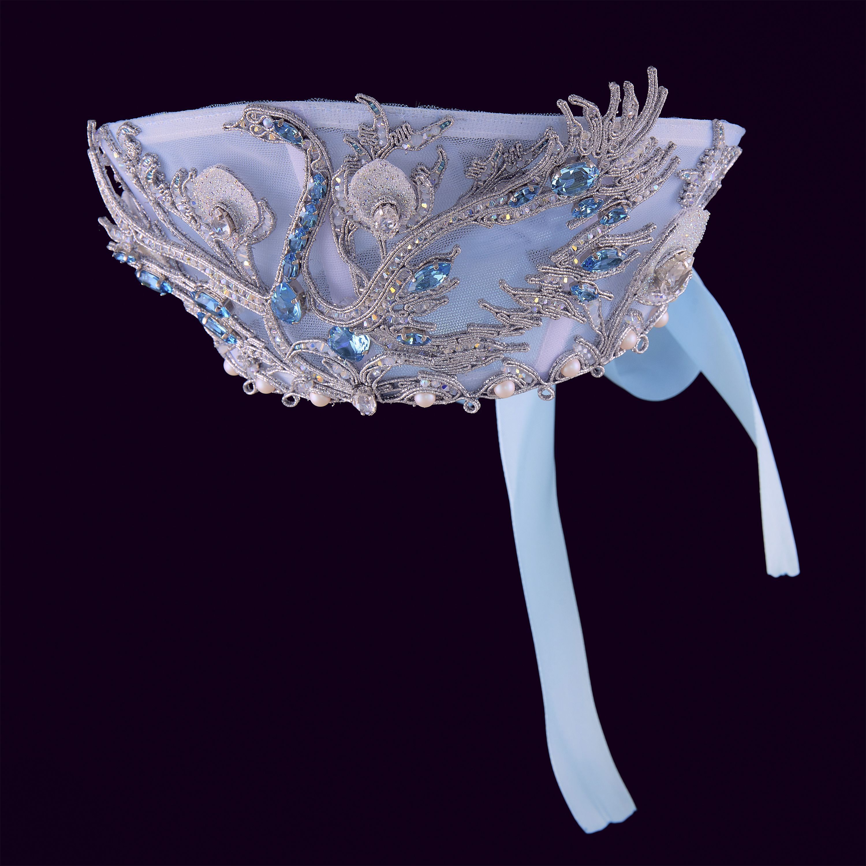 Со времен глубокой древности лебедь служит символом красоты, любви и верности. Недаром эта прекрасная птица является логотипом компании Сваровски, остающейся семейной по сей день. Каждое поколение наследников не только сохраняет традиции, но и открывает новые. Благодаря красоте и доступности кристаллов Сваровски можно было создать настоящие шедевры, за что мы им безмерно благодарны.  К сожалению, компания покидает сегмент рукоделия и спорта, и в честь последнего конкурса при поддержке Сваровски, я решила сделать лебедя, поместив его на исконно русский головной убор – кокошник. Но изготовлен он не в традиционной технике «сажение жемчуга по бели», где плетеный шнур пришивается на ткань и украшается жемчугом, а с использованием современной техники работы с сутажом. Это позволило сделать кокошник более изящным, легким и надежным. На работу ушло более 70 часов. Вся вышивка, от начала до конца, сделана единым рисунком из двух цельных металлизированных сутажных шнуров шириной 2,5 мм, между которыми вшиты бусины, кристаллы и жемчужины. А затем уже закреплена на кокошнике, выполненном в технике изготовления прозрачных корсетов. Благодаря этому, грациозный лебедь как будто создан из воздуха и блеска.