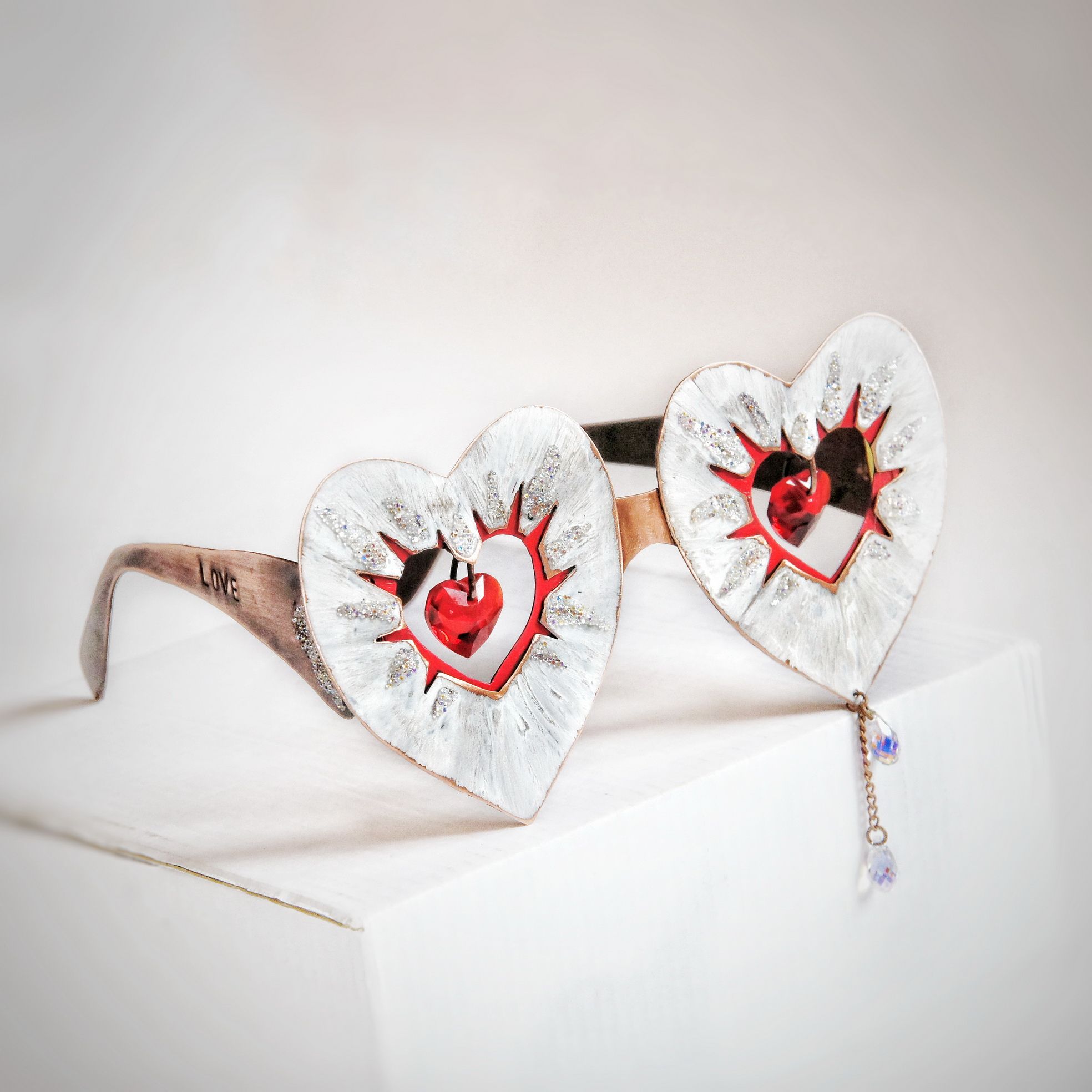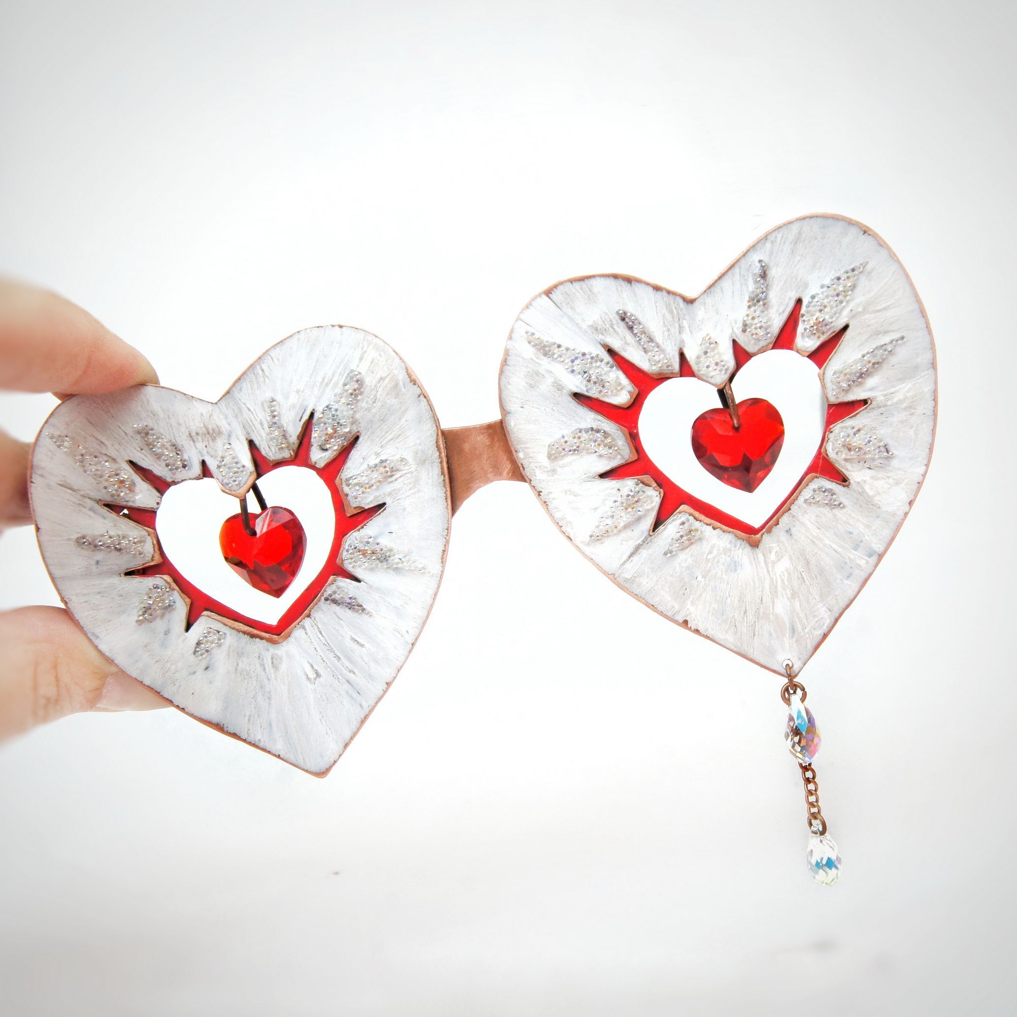 Очки LOVE выполнены из меди, покрыты разными патинами, оригинальны и многофактурны. Внешняя форма и внутреннее отверстие очков в форме сердца подчеркивает форму подвесок Сваровски, которые закреплены по центру. Подвески подвижны. От каждой подвески в стороны расходятся разнообразные «лучи»: белые – фактурная патина по металлу, «потертая временем», с проблескивающей кое-где медной основой; красные – фигурная выпиловка с цветной патиной, сверкающие – кристальная ткань.
