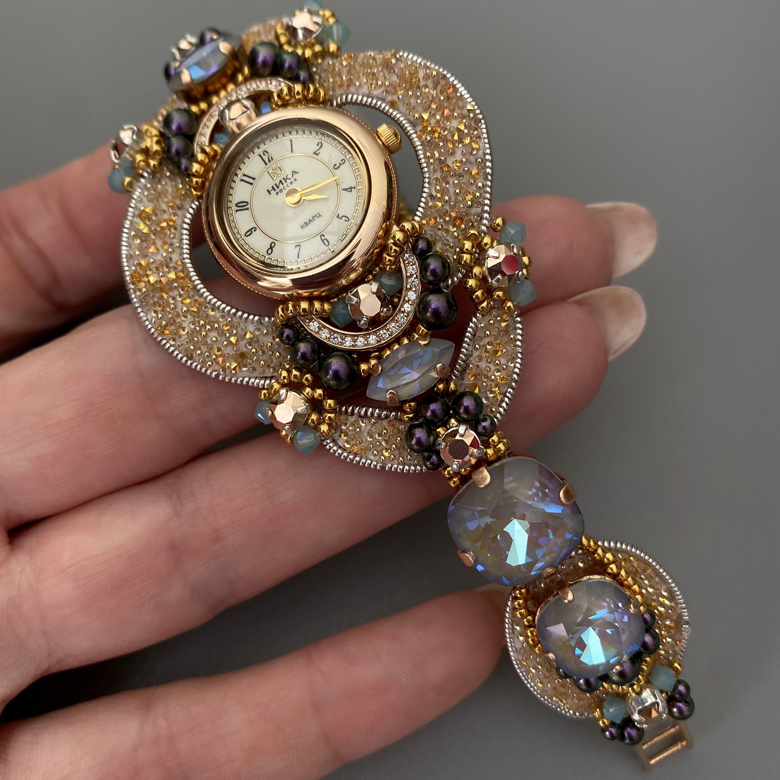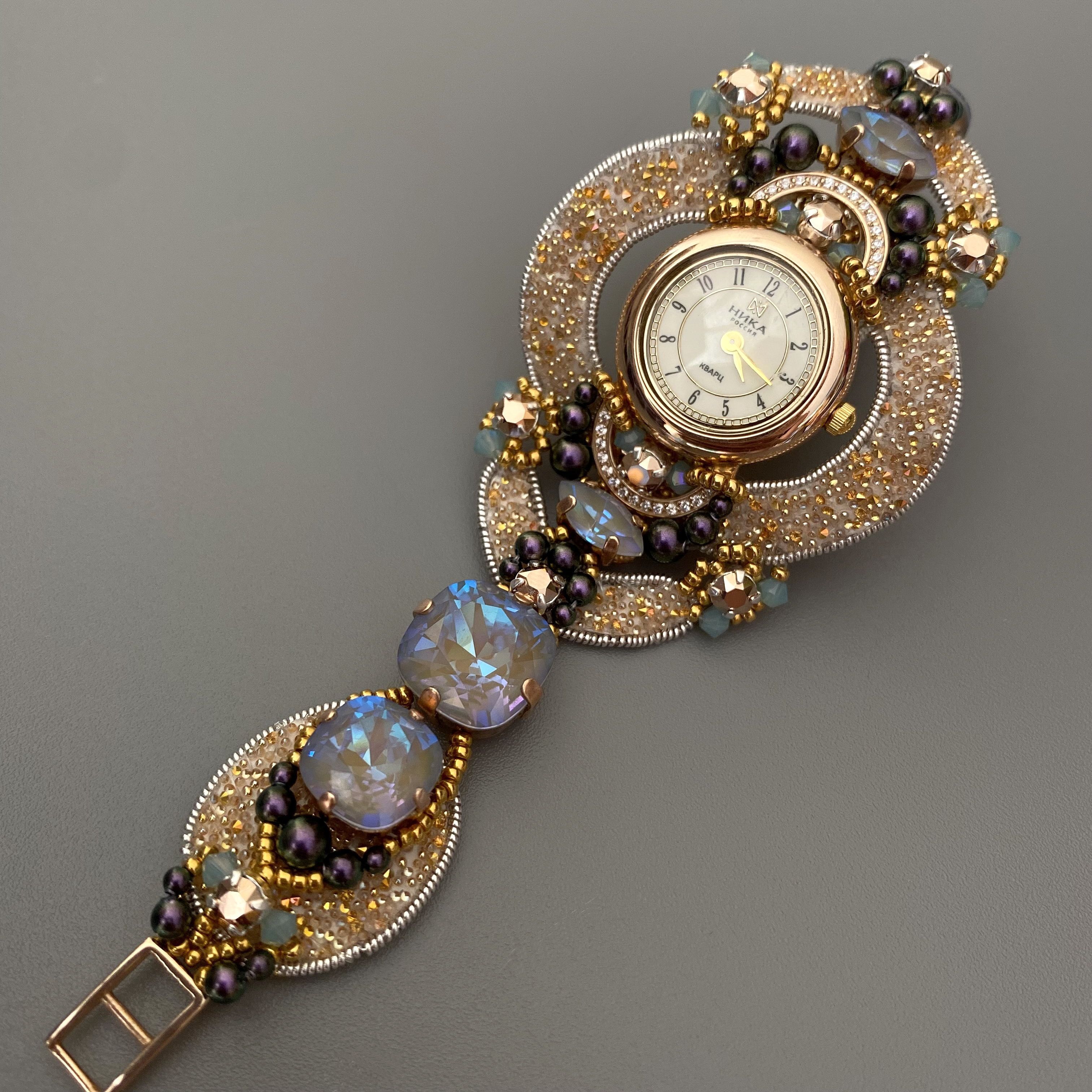 Браслет часов состоит из кристальной ткани и потрясающей красоты кристаллами.