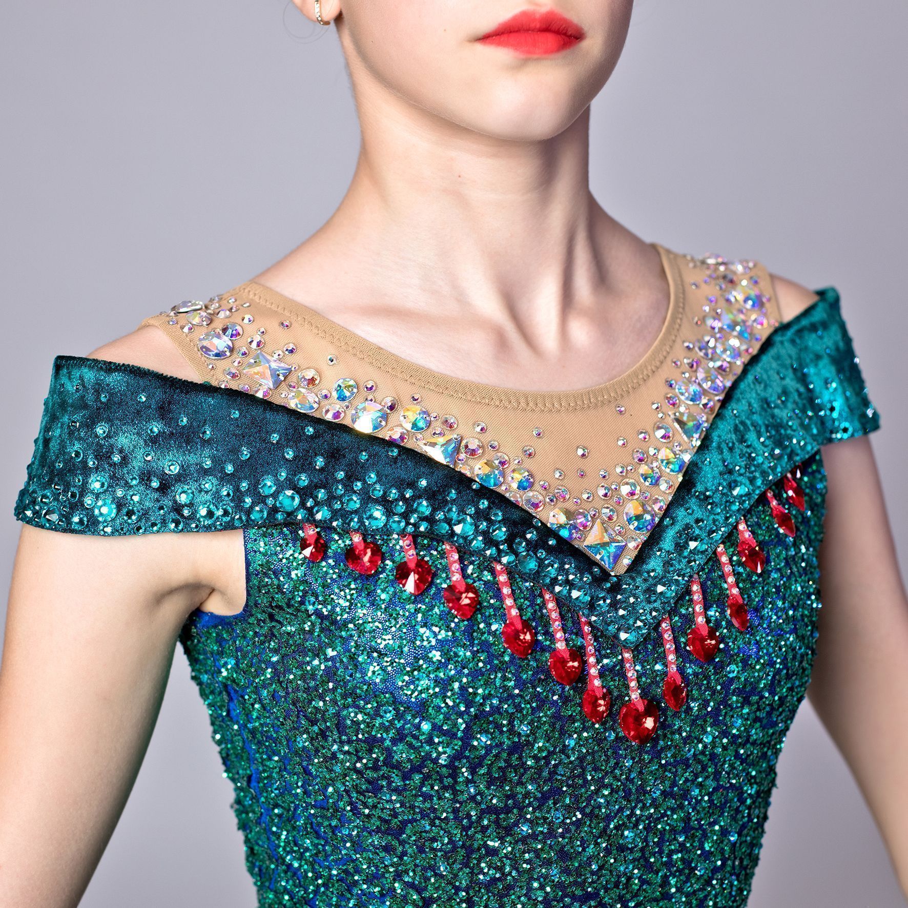 Постепенно стразы Swarovski начинают массово использовать для декора в различных сферах. И гимнастика не исключение. В купальнике, украшенном кристаллами Swarovski, каждая гимнастка может почувствовать себя королевской особой на торжественном мероприятии. И мой купальник не исключение (пусть и не скромно звучит). В данном дизайне хотелось показать чистый и ярчайший блеск кристаллов Cobalt Shimmer и Blue Zircon Shimmer, дополнительно подчеркнутый глиттерной тканью. А красные акценты из камней Light Siam Shimmer добавили образу завершенности. Простой и лаконичный дизайн подчеркивает изящество гимнастки и ее линий, напоминает вечернее платье и не отвлекает внимание от самой гимнастки. А блеск просто завораживает зрителей.