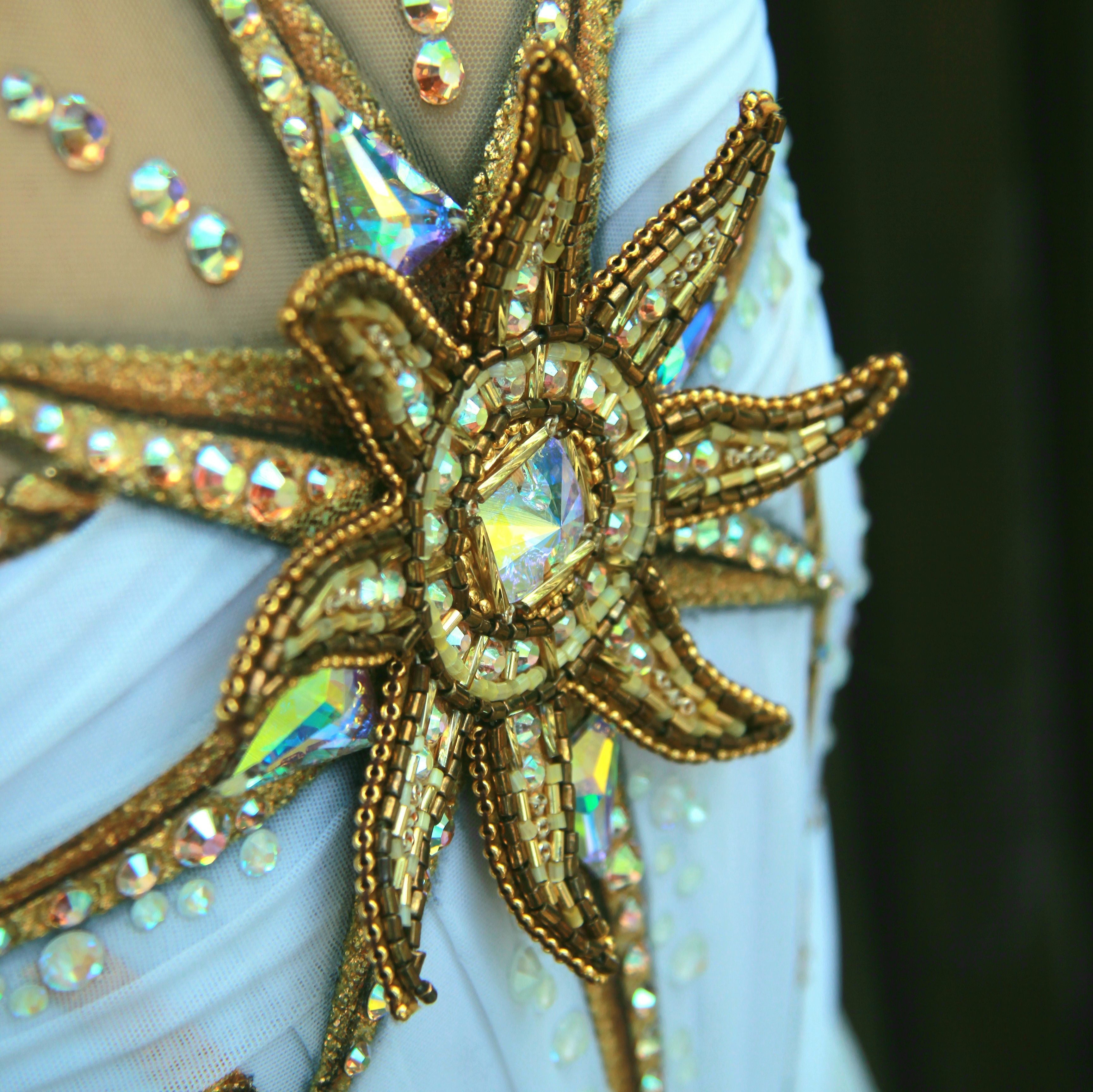 Купальник-трансформер дополнен съёмным рукавами, которые могут быть использованы поочередно для разного вида упражнений. Так, например, купальник-основа в сочетании с Бразильским рукавом подойдёт под латиноамериканскую мелодию, передавая шик и блеск Карнавала. А рукав с восточными мотивами приоткроет для судей таинство восточных единоборств в упражнении с булавами под ритмичные интригующие звуки китайских барабанов. Купальник-основа белого цвета универсален и может использоваться самостоятельно без рукавов.