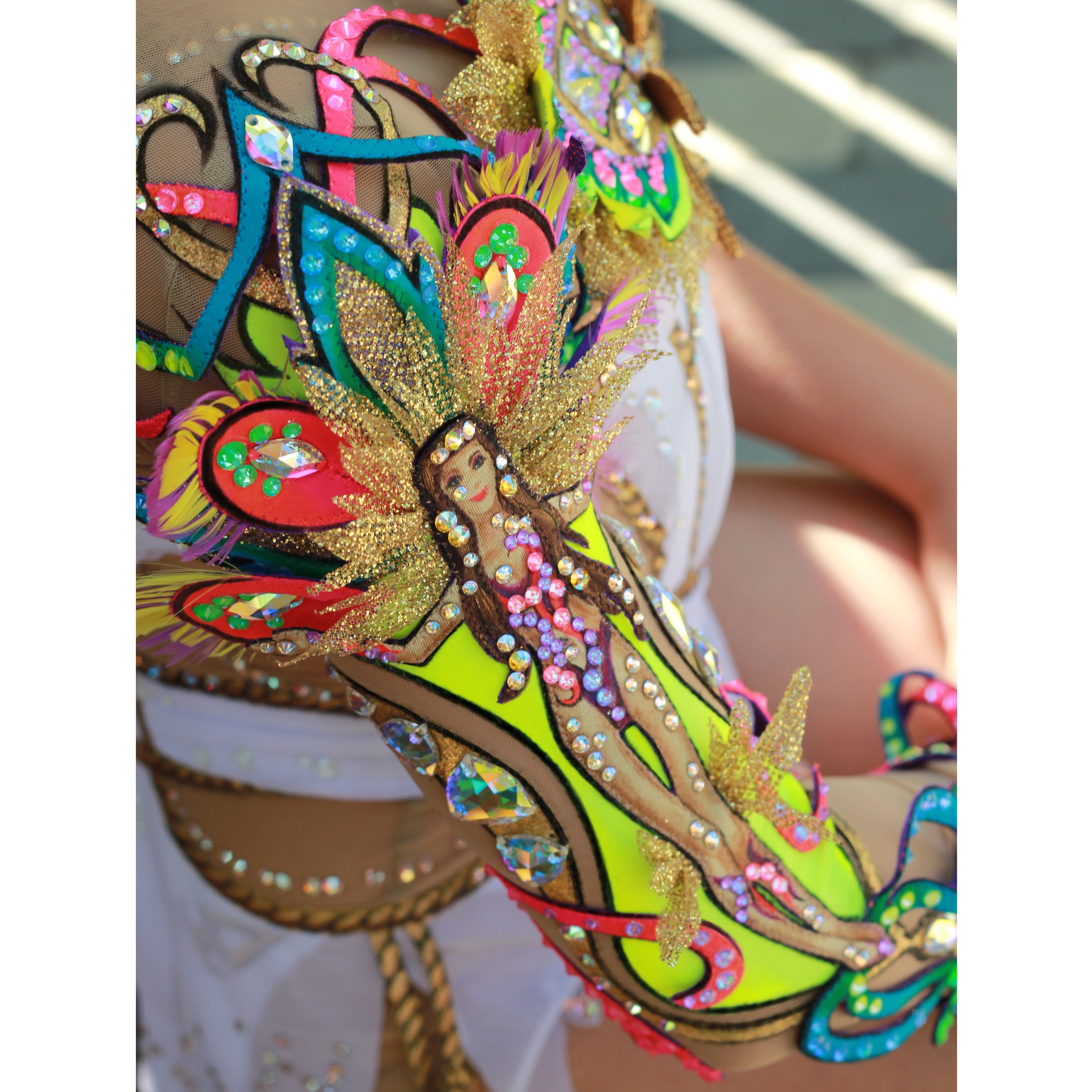 В основе композиции конкурсной работы лежит символ Розы ветров, указывающей на стороны света: Запад и Восток; красочную Бразилию и мистический Китай; зажигательную красавицу-участницу Карнавала в Рио-де-Жанейро и бесстрашного несгибаемого монаха Шаолинь. На юбке располагается люневильская вышивка, повторяющая очертания Африканского и Азиатского континентов.