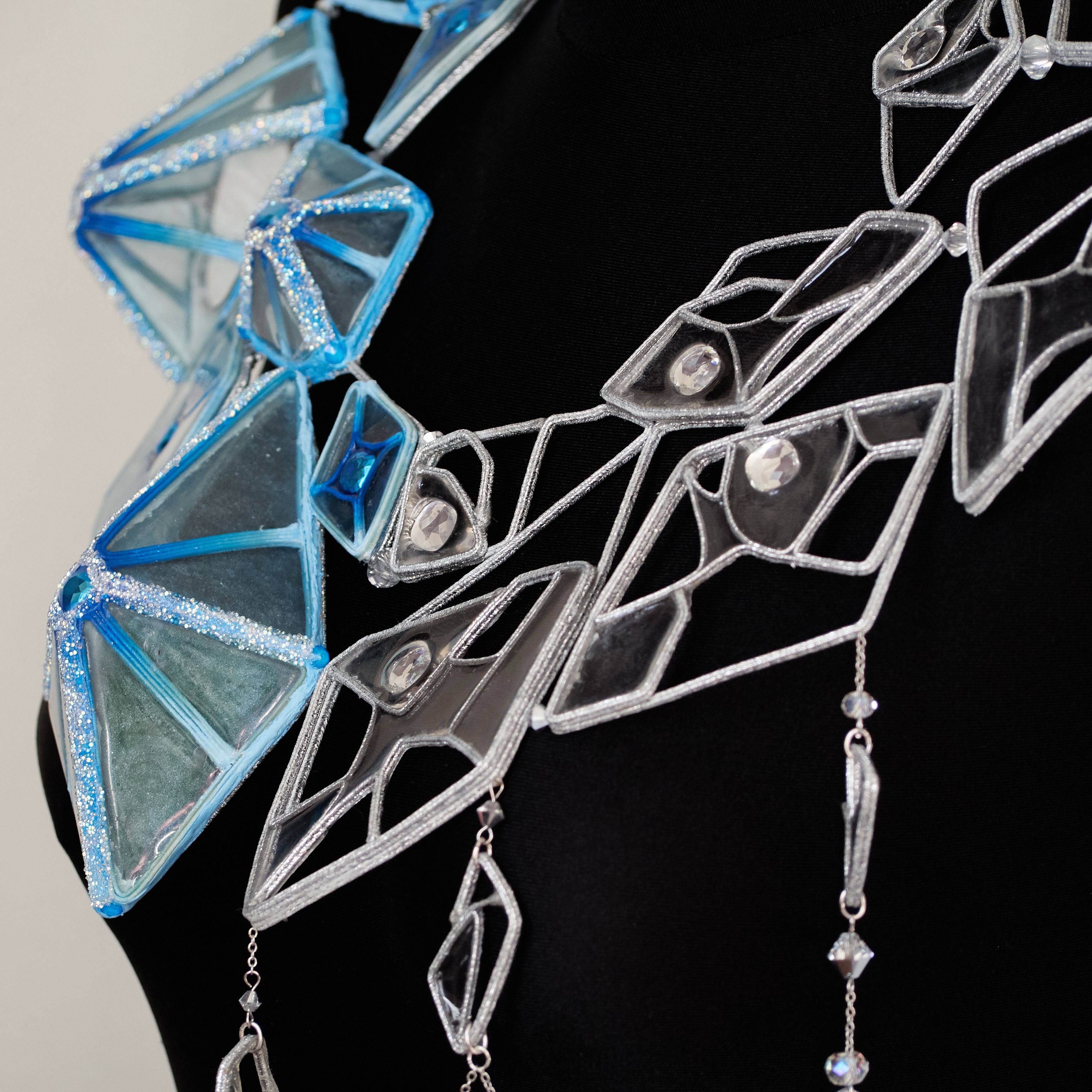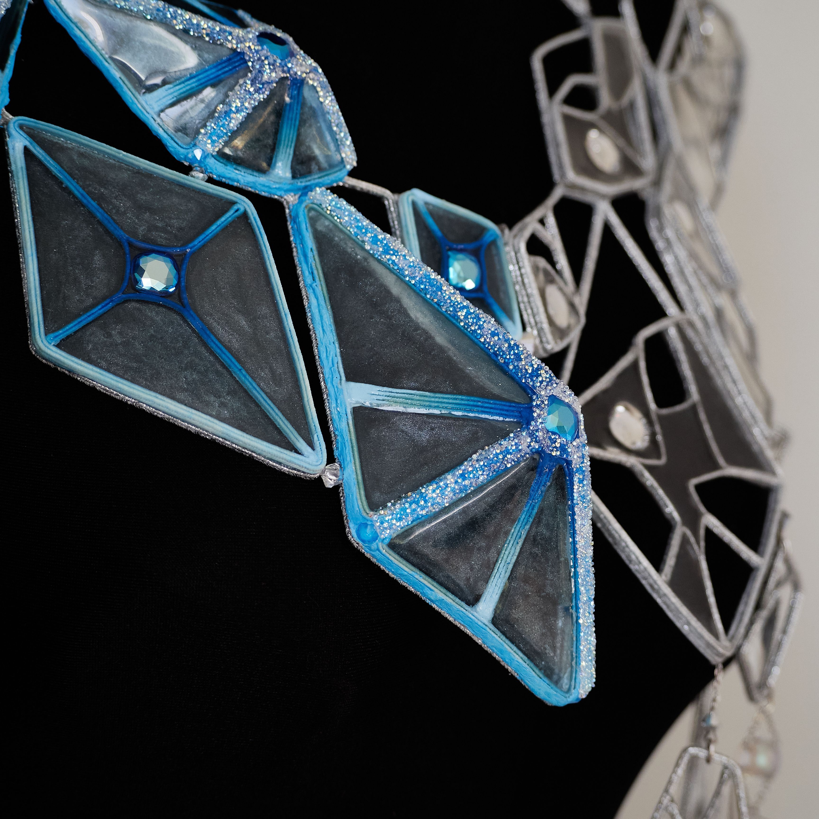 Левая же сторона выполнена в виде разбитых кристаллов с разлетающимися осколками. Каждый осколок на бахроме соответствует недостающему кусочку разбитого кристалла на колье, их можно собирать как мозаику.