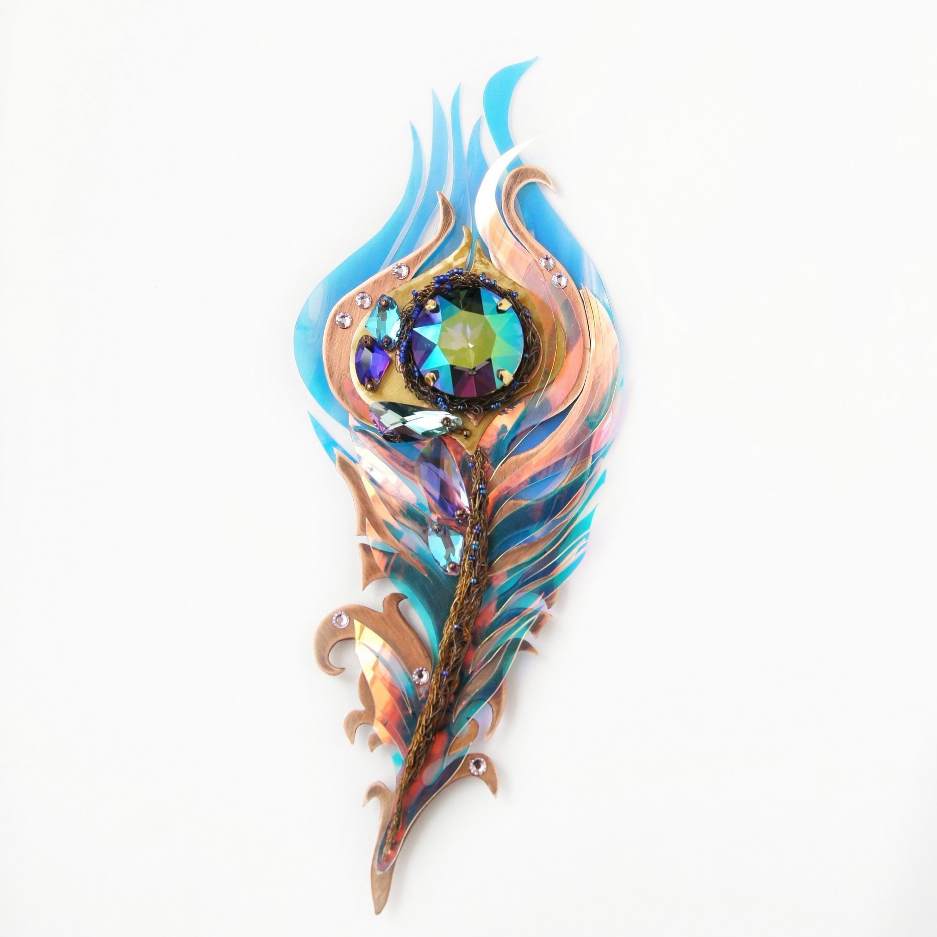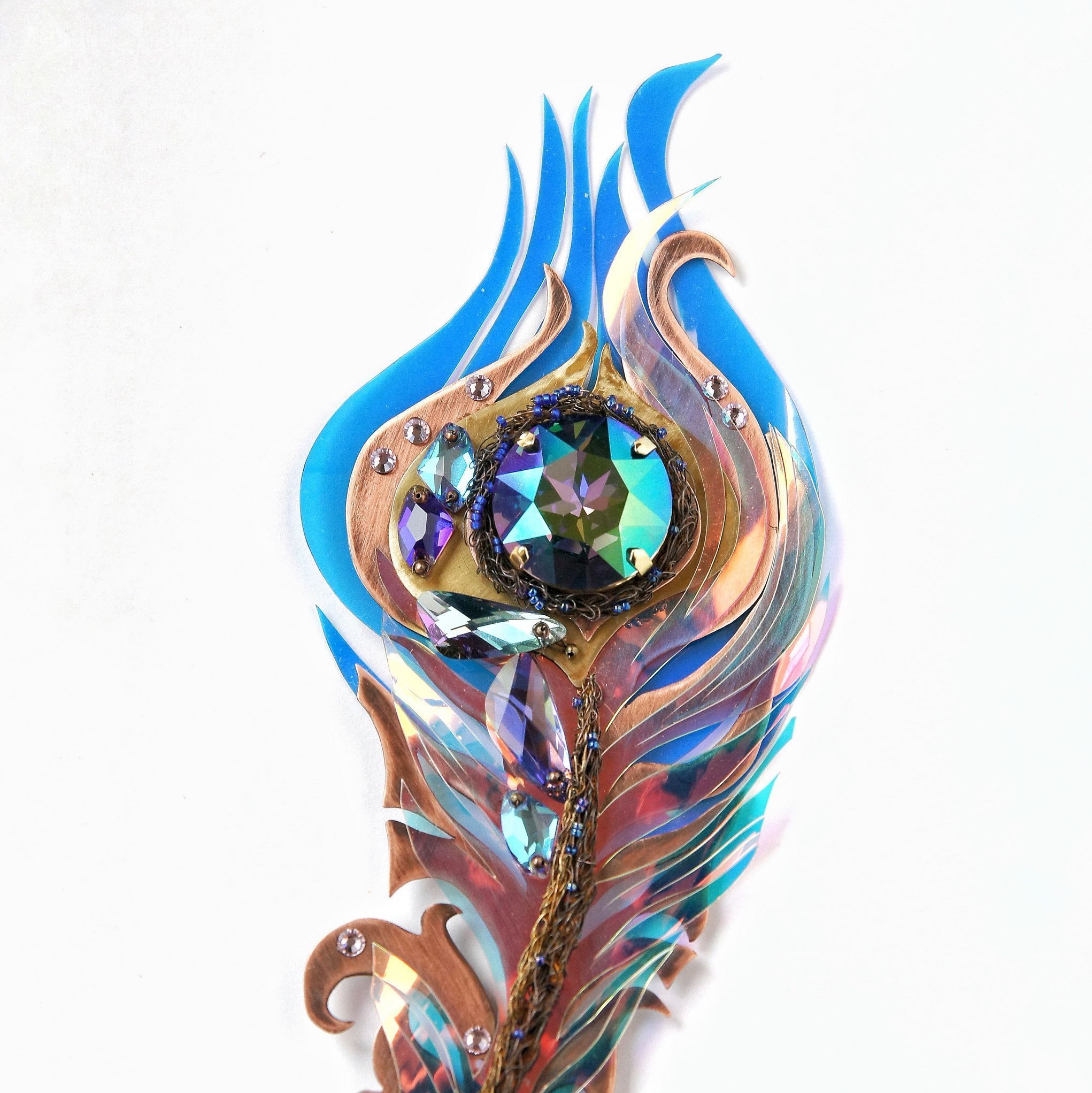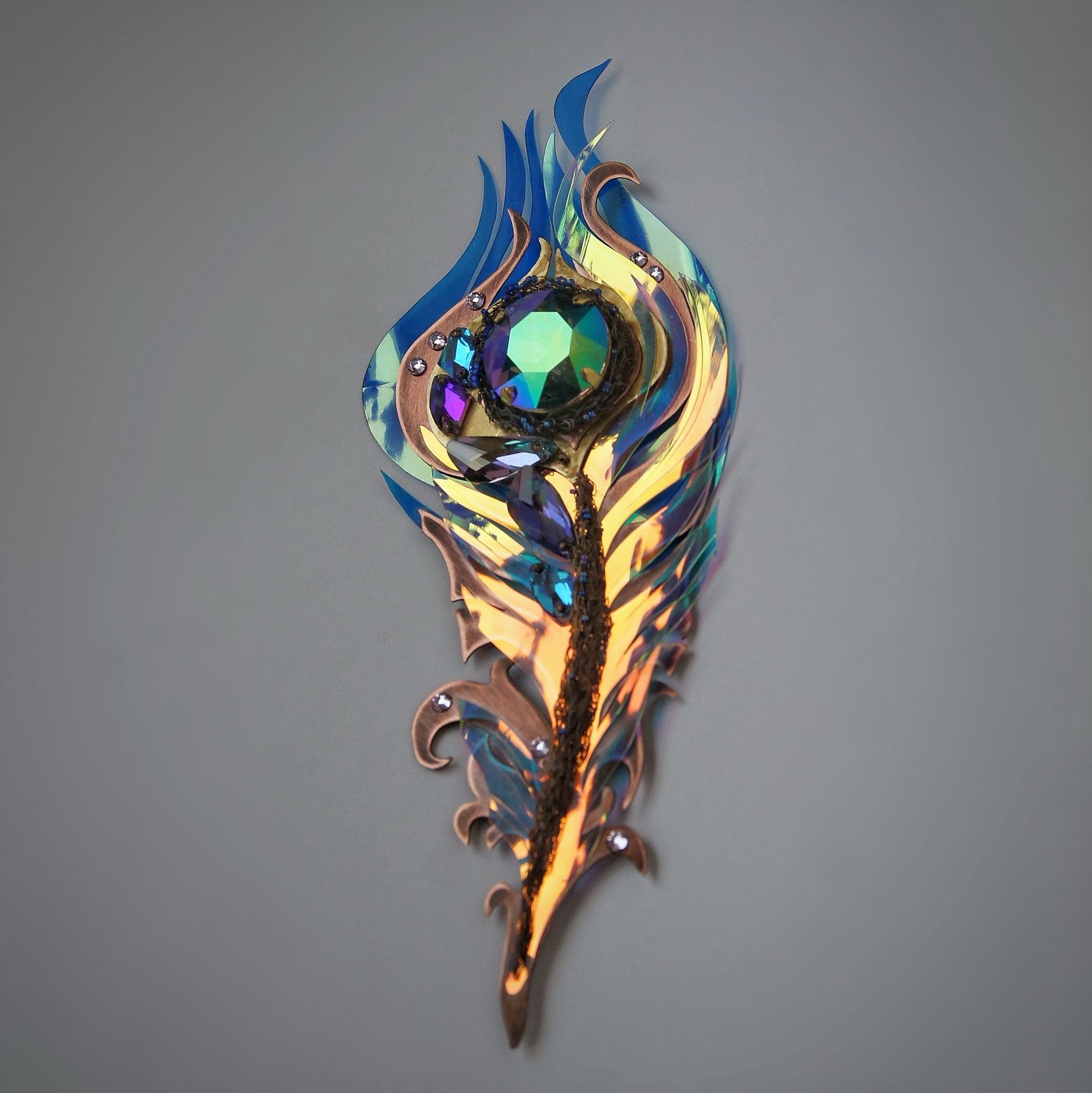 Крупная, необычная брошь выполнена в виде пера. Яркое, сверкающее, переливающееся. Меняет цвет в зависимости от освещенности и окружающих предметов и цветов. Никогда не остается одинаковым. Притягивает взгляд. Настоящее перо волшебной птицы!