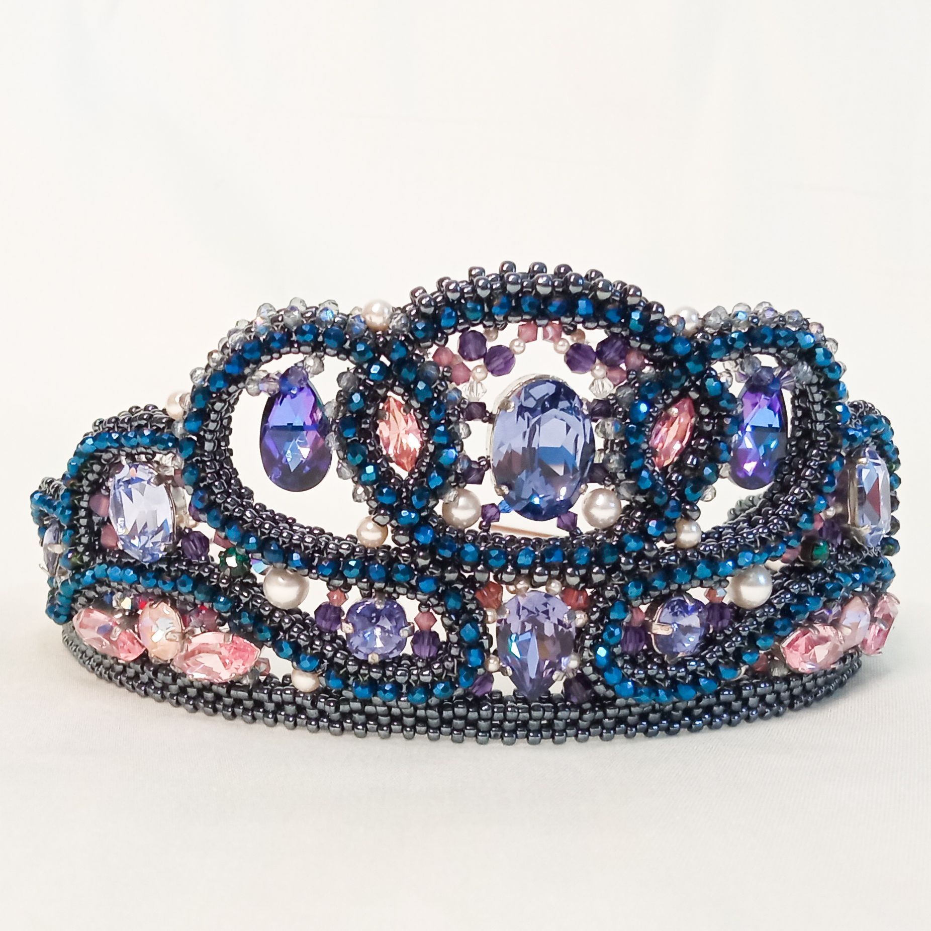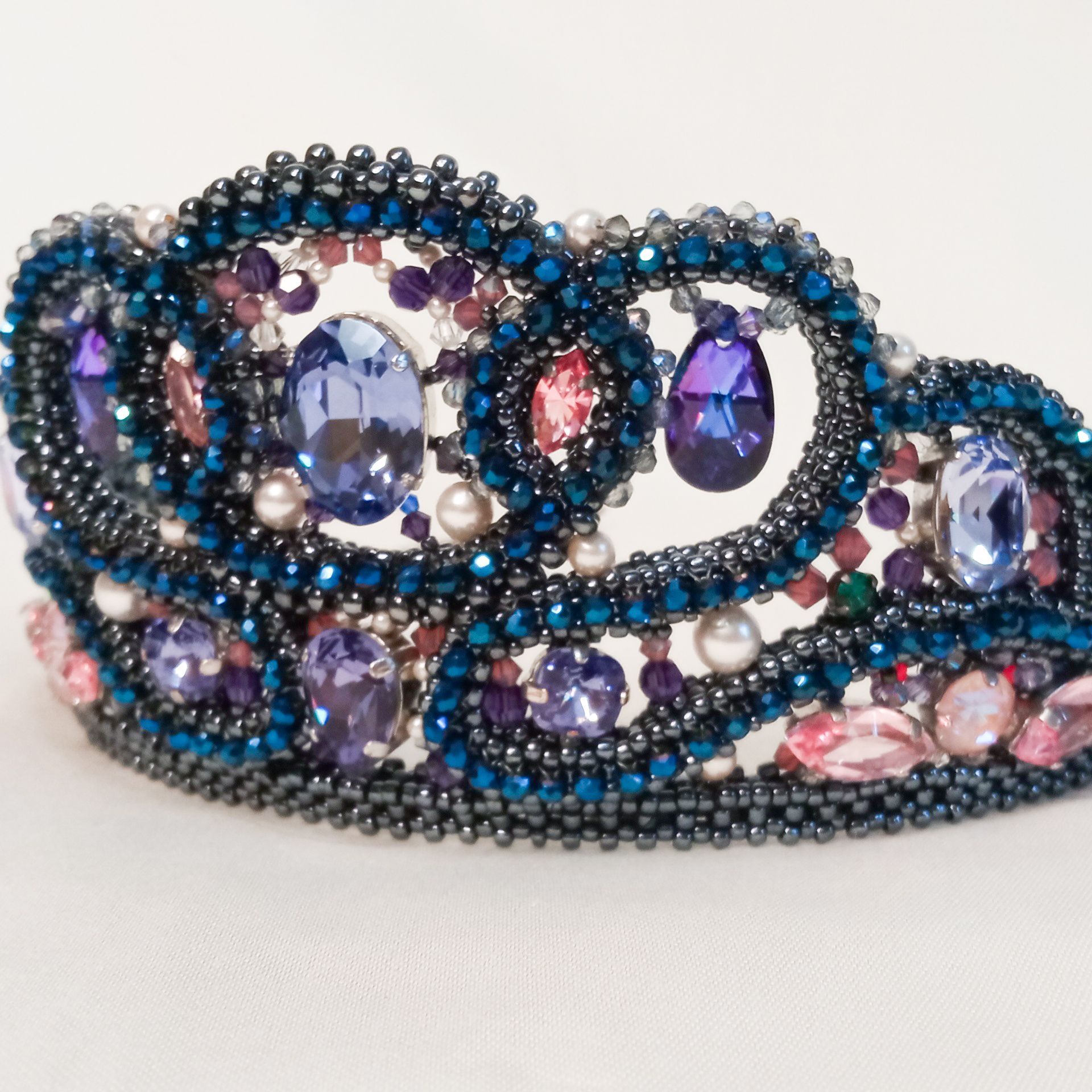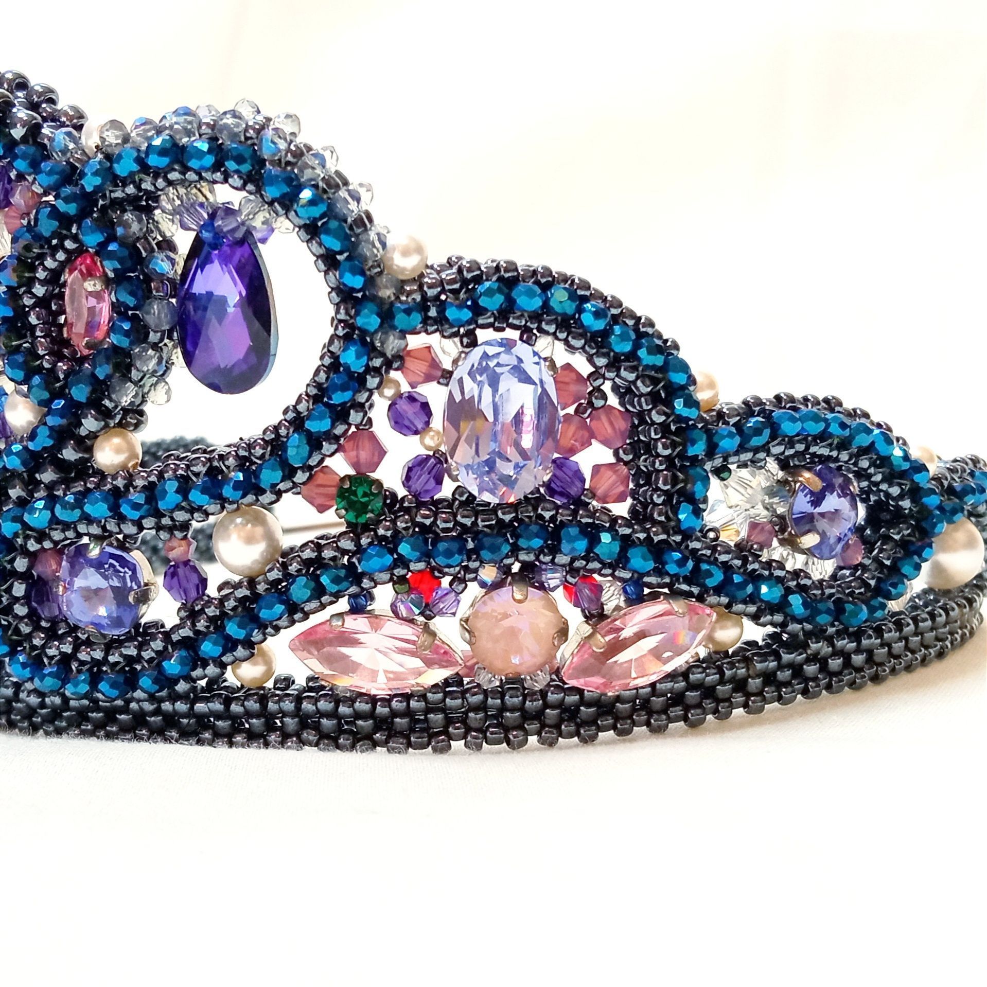 Данная работа выполнена в технике бисероплетения без использования металлического каркаса. Для фиксации на голове, в нижней части диадемы использована основа для ободка. Вес диадемы менее 100 грамм.