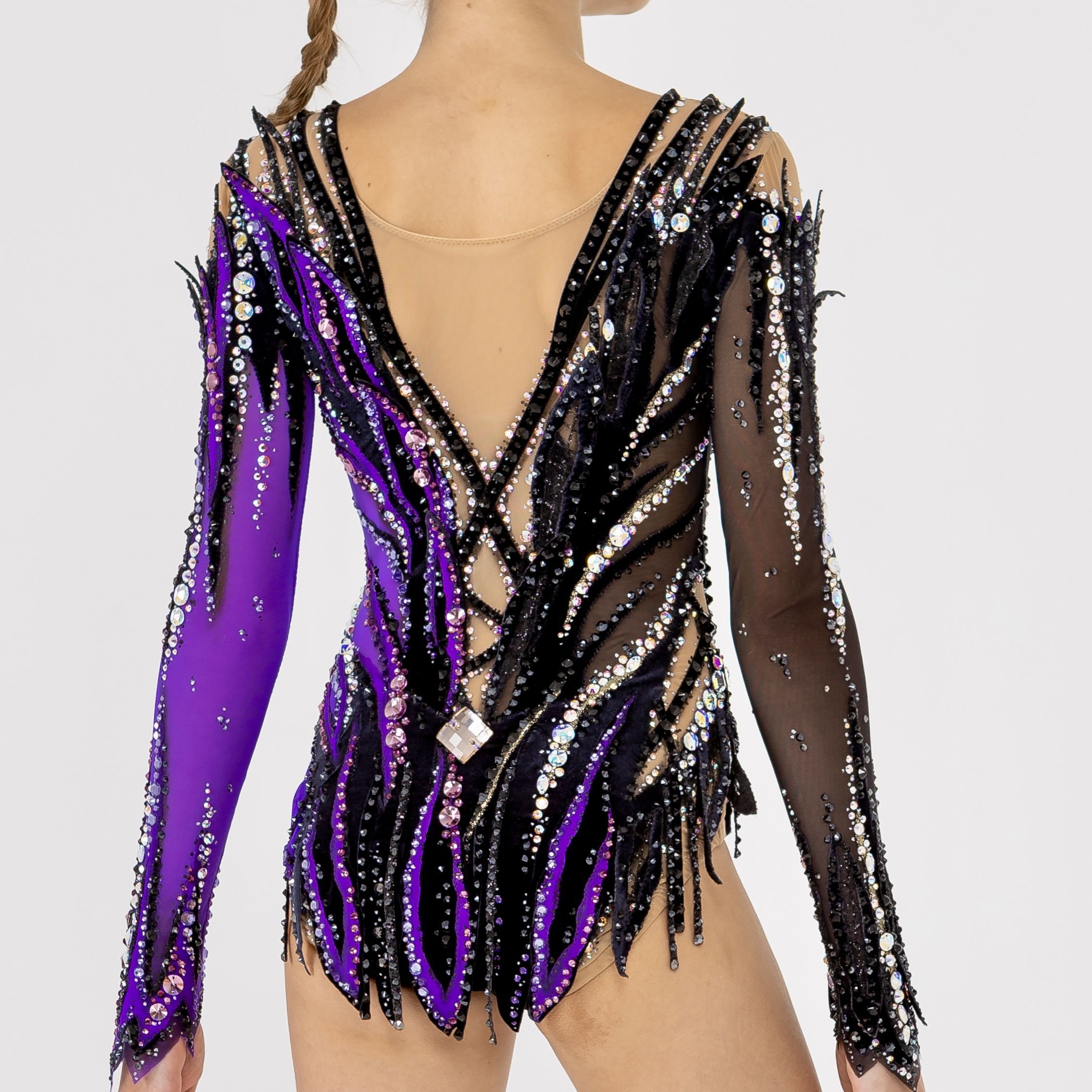 Костюм «Стремление», своим дерзким дизайном, дополняет образ сильной, смелой, решительной спортсменки, подчёркивает силу духа, упорство, стойкость, и в то же время, своим насыщенным, завораживающим, сиреневым оттенком Evoli, показывает мягкость, чувственность, изящество и грацию юной гимнастки.