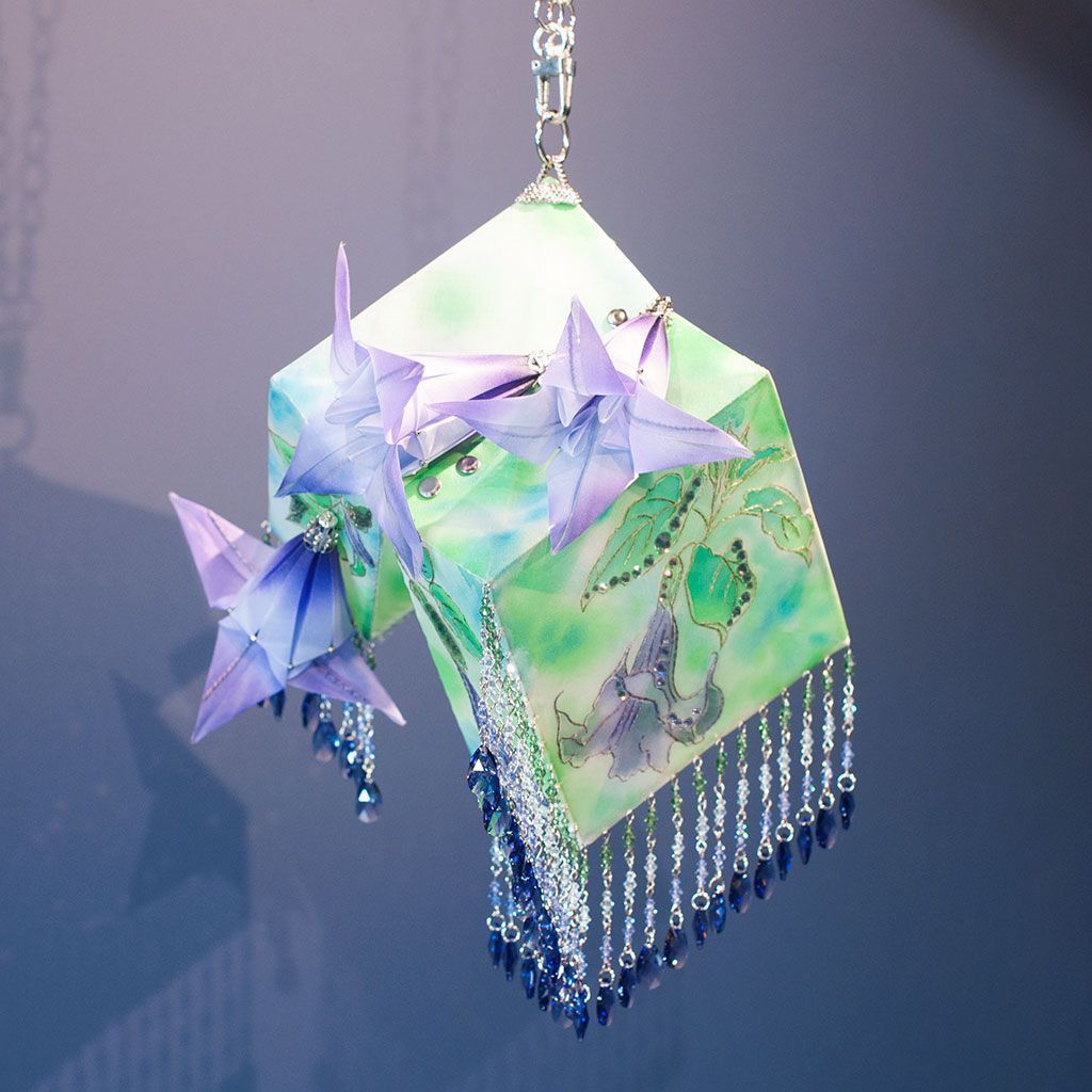 В моей вселенной .evoli я рассуждаю о связи конструкции и свободной формы. Есть два типа творцов - люди потока и люди расчета. Я принадлежу второму лагерю, все строится, конструируется и вымеряется. Однако первый подход имеет очевидные преимущества, поэтому в каждой работе я стремлюсь к балансу хотя бы на уровне идеи. Например здесь грани .evoli воплощены в максимально точном искусстве - оригами и в минимально подходящем для жесткой формы материале - ткани. К космическим мотивам отсылает фон росписи в технике холодного батика, а также образ цветка-дурмана. Ну и разумеется декор кристаллами .evoli в лавандовом оттенке.