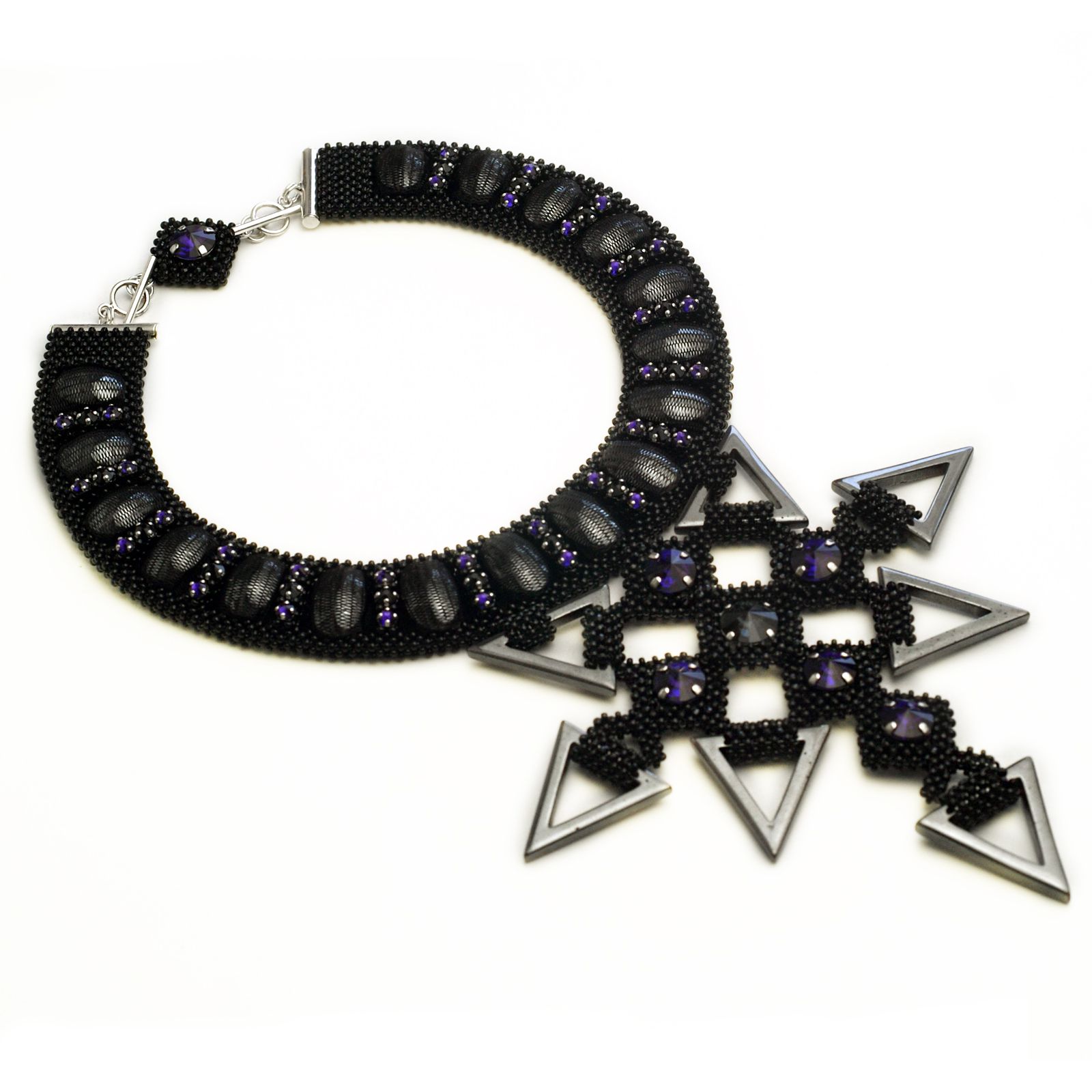 Колье выполнено из бисера с добавлением натуральных камней – подвесок и кабошонов из гематита, бусин шпинели. Колье выполнено в классической черной гамме с добавлением акцентов из кристаллов редкого цвета Purple Velvet.