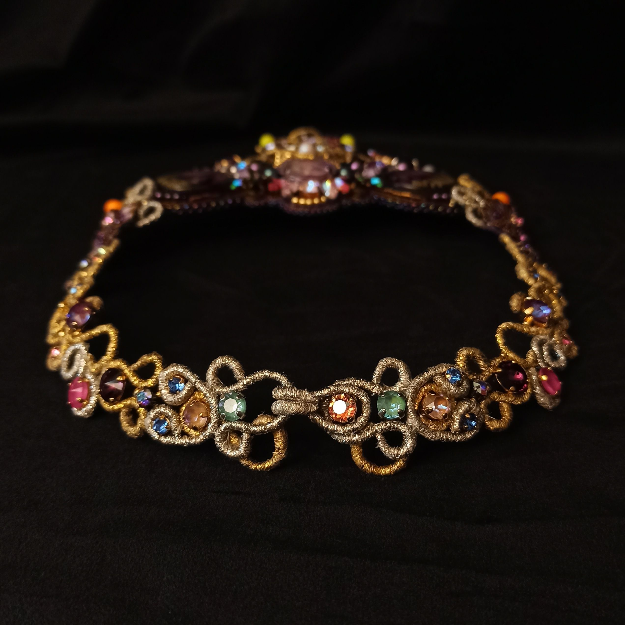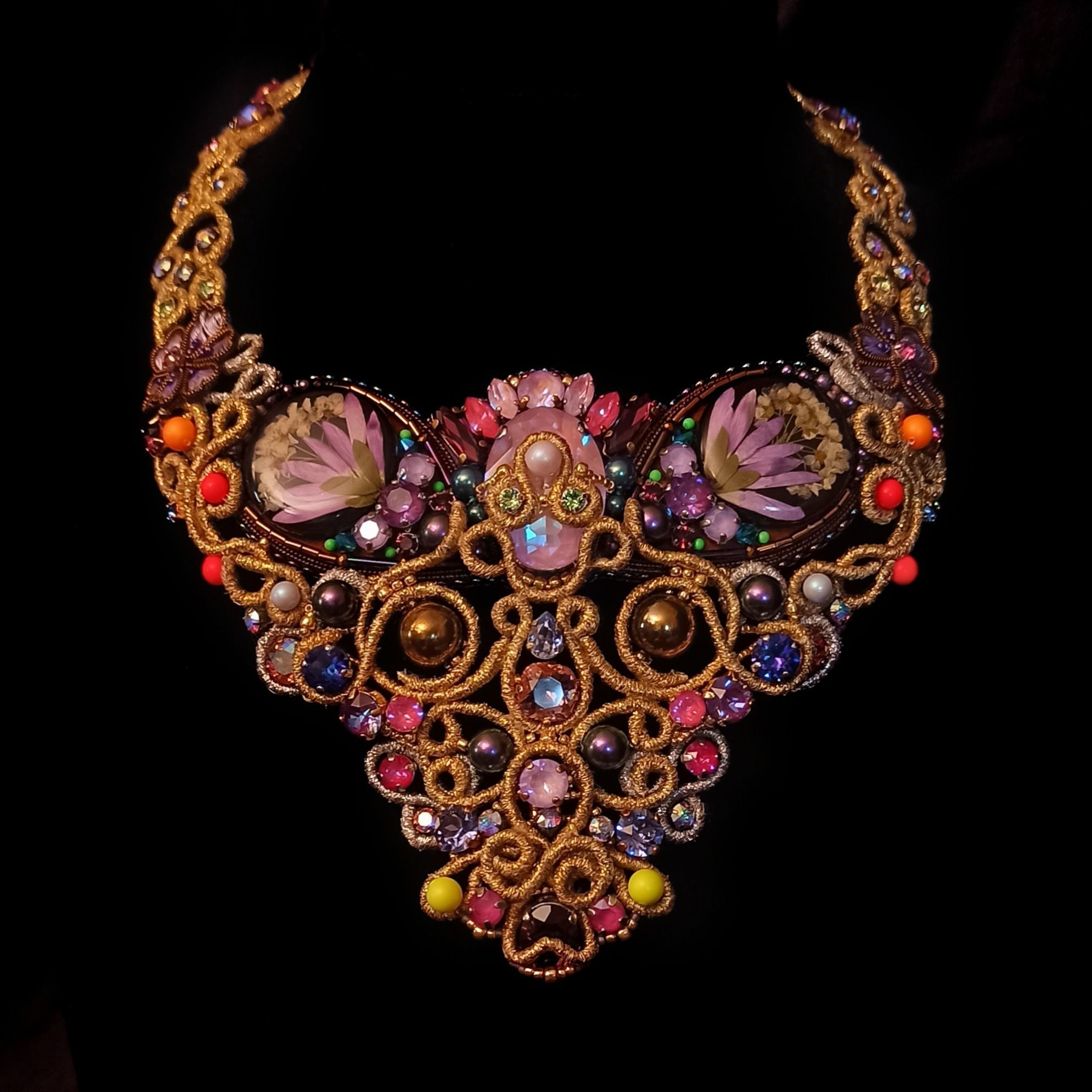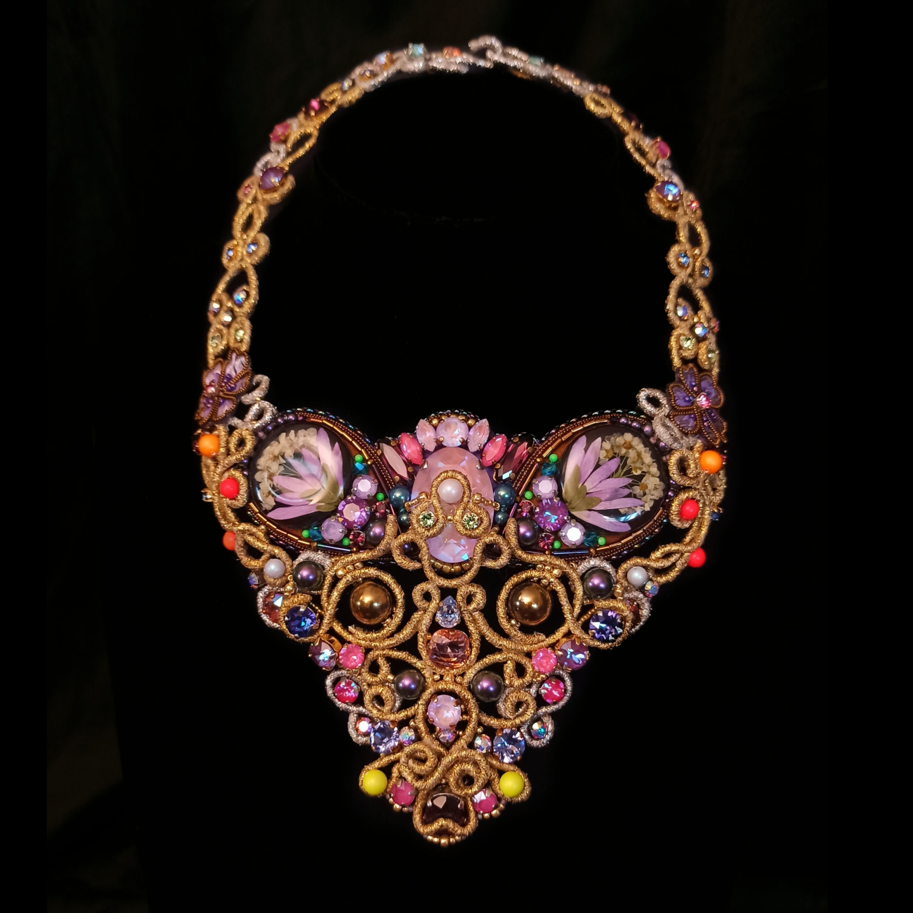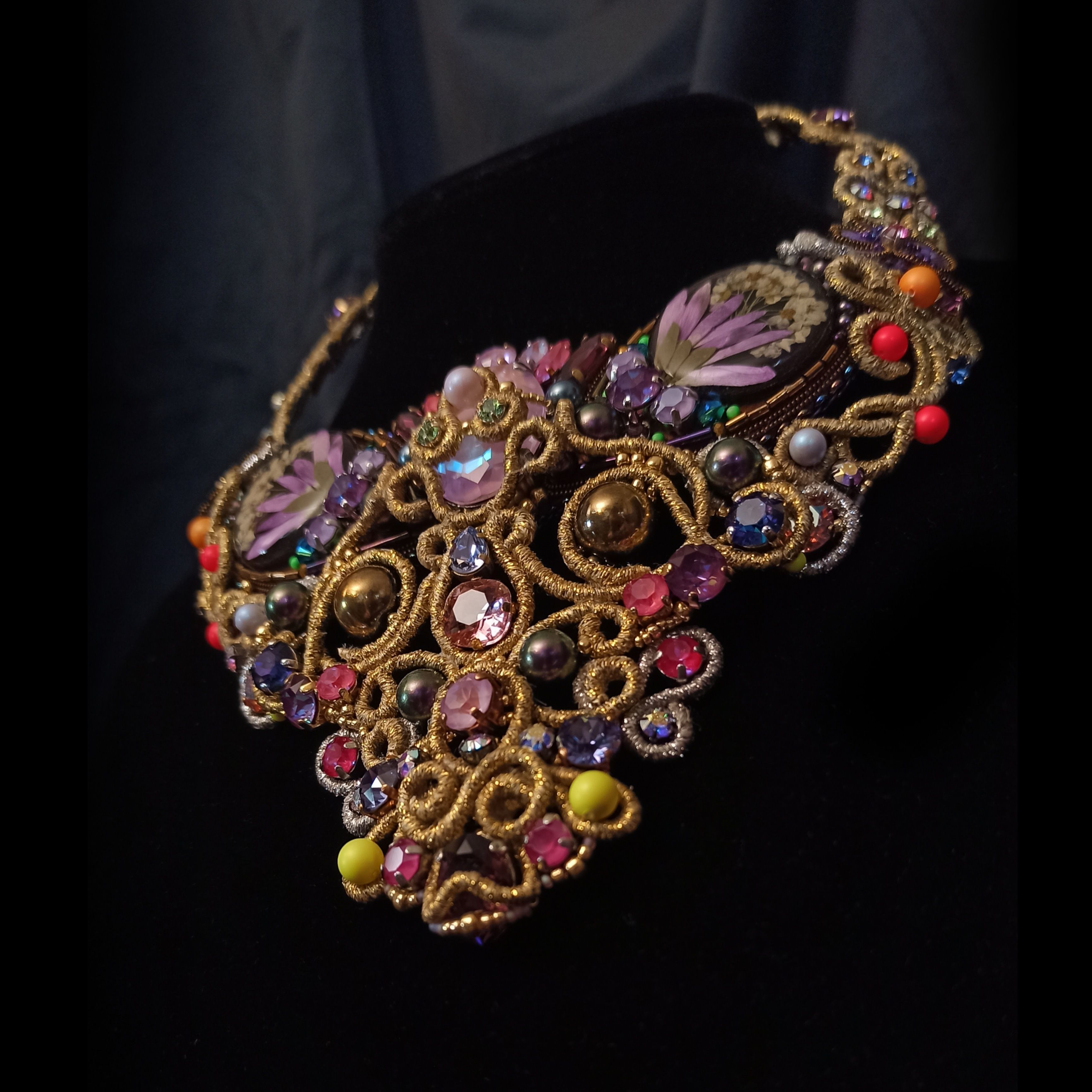 Когда была начата работа над этим колье, я не знала что получу в итоге. Конечно была задумка, эскизы, подбор кристаллов и жемчуга, но перечитывая название темы "Грани Вселенной .evoli" Раз за разом, я всё больше понимала, что хочу чтобы материалы мной "управляли". Глядя на основные цвета я задумалась, что же они означают. Сиреневый олицетворяет творчество, воображение, таинственность. Творческие поиски, открытость к переменам и стремление к развитию. Золотой символизирует солнце, несёт в себе решительность к действиям, бесстрашие, желание выделиться. И я поняла что всё сходится! Именно в таком настроении я и пребывала, в поиске новой грани в себе, в решительности создать что-то необычное. Шаг за шагом, завиток за завитком, мысль за мыслью.. Так и появилось колье "Моя Вселенная". Его создание напомнило мне о том что граней великое множество не только в кристаллах, а в нас самих.. Каждый из нас и есть целая многогранная Вселенная. Такая разная, неповторимая, глубокая.. Это колье о том, что внутренний мир огромен и прекрасен, о любви, о вдохновении, о мечтах, о возможностях...