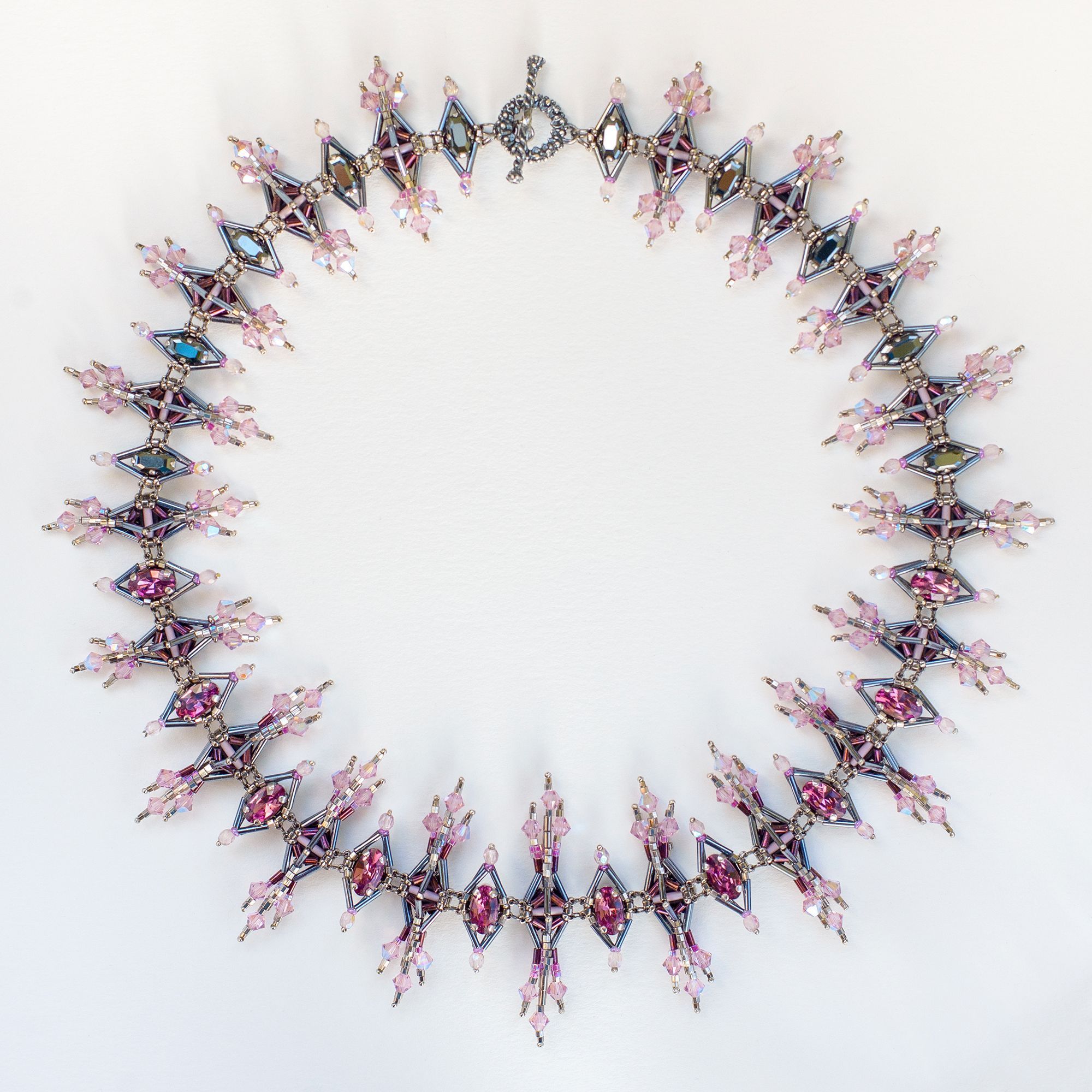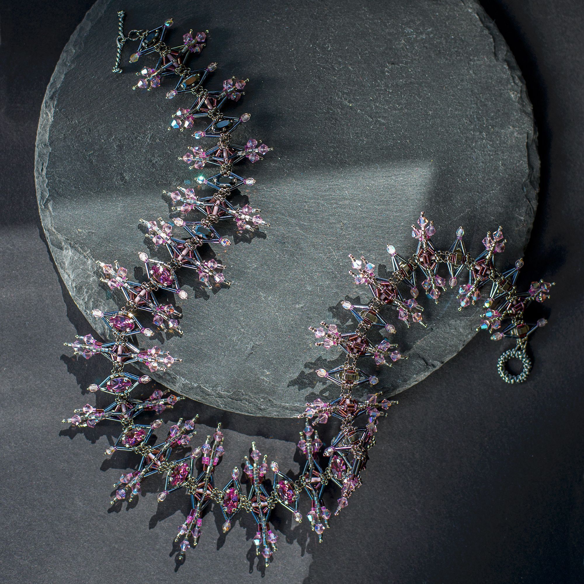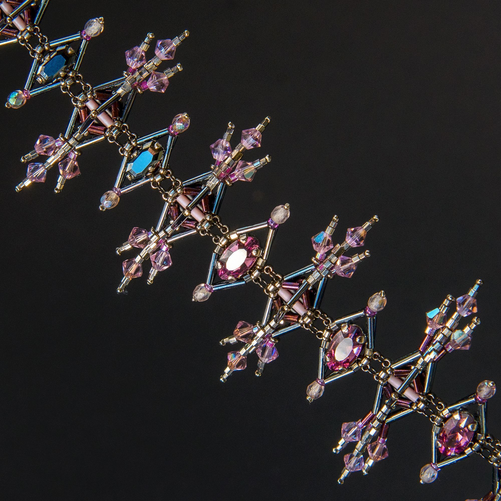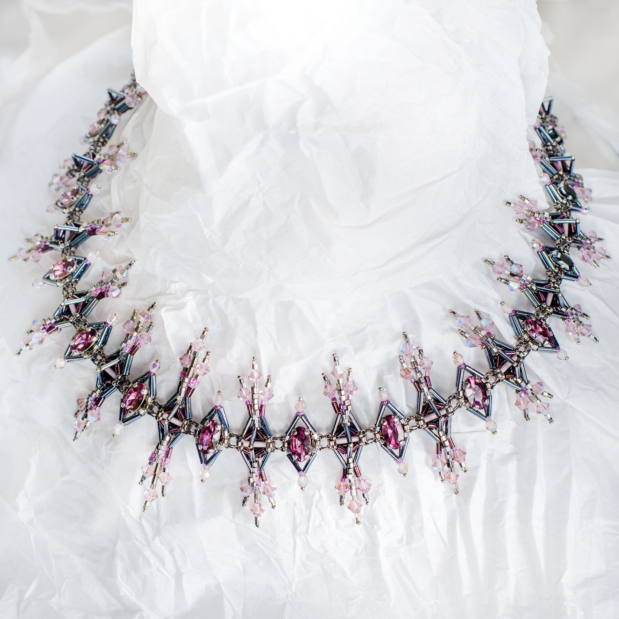 Pinnacles (Пинакли) — это мое размышление на тему величественной готической архитектуры и скромная попытка передать этот стиль в украшении. Меня вдохновили остроконечные башенки-пинакли готических соборов, украшенные изящными завитками-краббами, стрельчатые окна, сложная геометрия сводов и в целом то ощущение стремления ввысь, которое характеризует архитектуру готики. В своей работе я старалась воплотить эти образы, и кристаллы .evoli, благодаря их сложной форме и четким граням, мне особенно в этом помогли. В результате получилось колье в виде череды остроконечных шпилей, плавно увеличивающихся в высоту к центру украшения. Сочетание строгих стальных оттенков бисера и нежной сирени кристаллов — словно вид на крыши готического собора в лучах рассвета.
