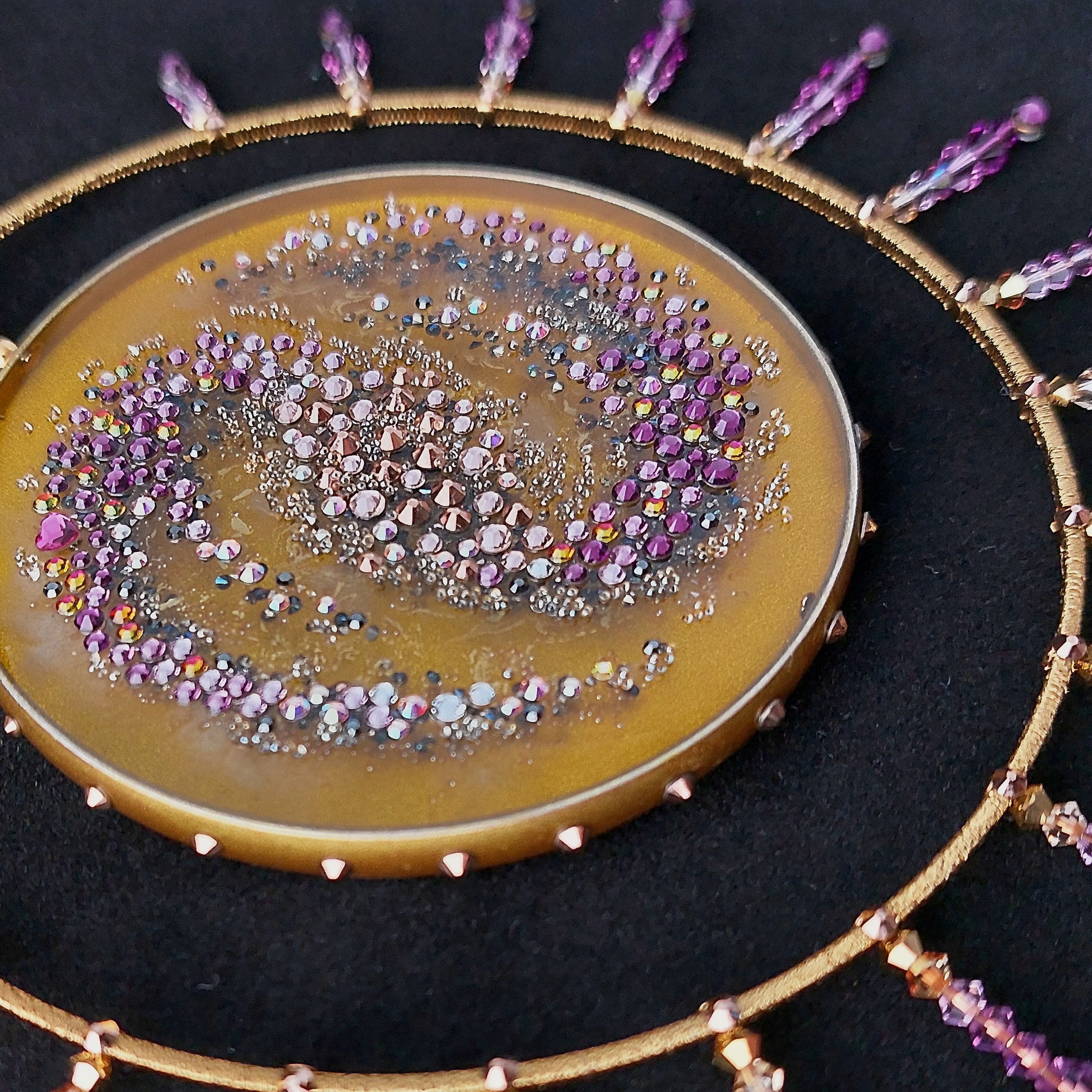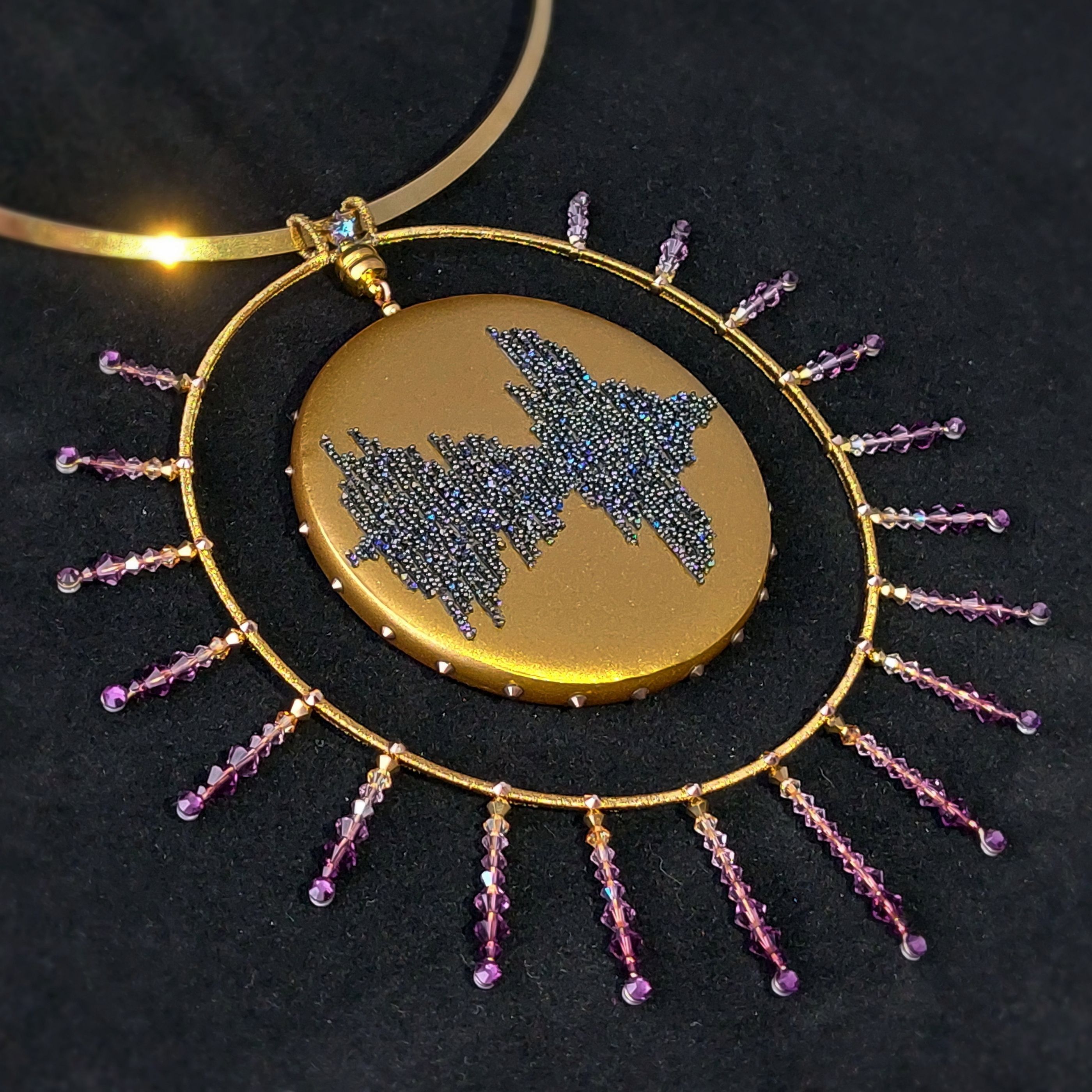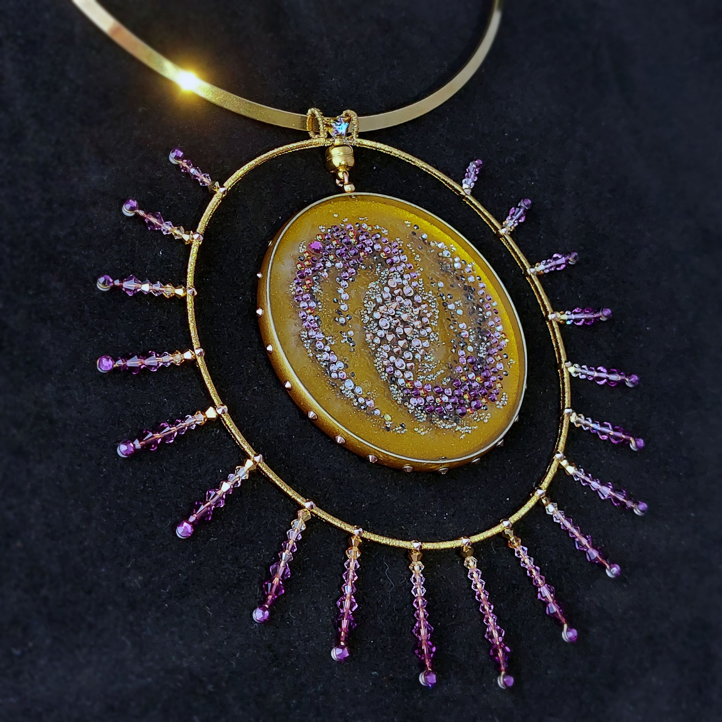 В конкурсном колье главным элементом является своеобразная золотая пластинка с фразой «Я тебя люблю», изображенной в виде графической звуковой дорожки. Мое «Письмо во Вселенную» не улетит к внеземным цивилизациям. Оно адресовано другой Вселенной – Вселенной мастеров Evoli, где каждый Мастер является яркой звездой, способной своим творчеством сказать «Я тебя люблю!» всему миру. Изображение этой Вселенной можно увидеть, перевернув центральный элемент колье.