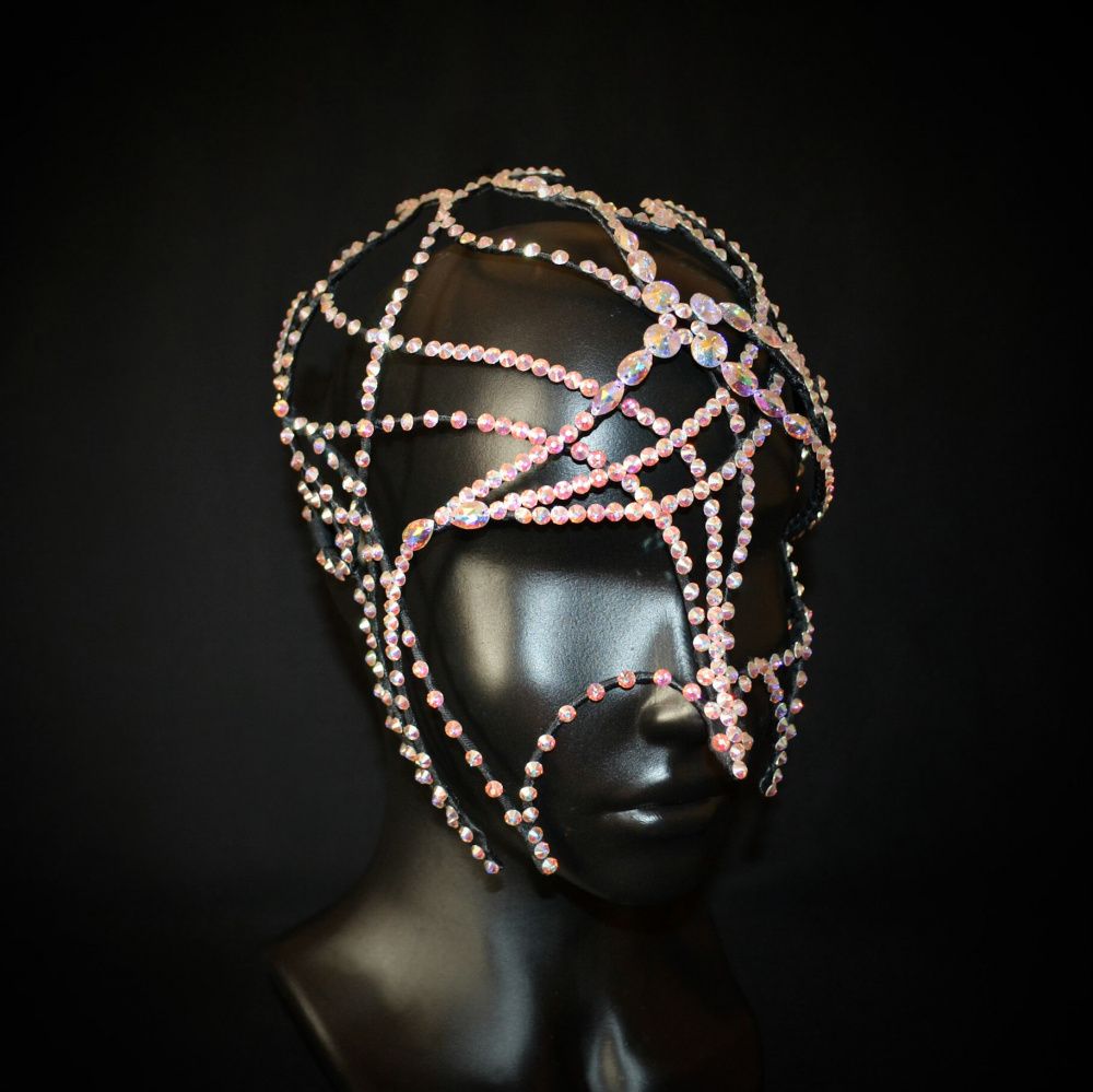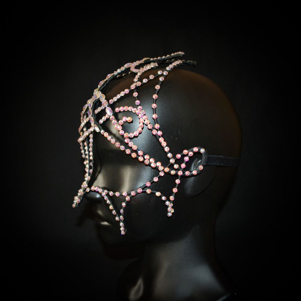 Эта маска олицетворение северного сияния, многогранности цветов, переливов, зависящих целиком и полностью от света, падающего на изделие. Отсутствие симметрии, смещенный центр композиции, точный подбор конкретных камней – кристаллов Swarovski, делает изделие уникальным и неповторимым.