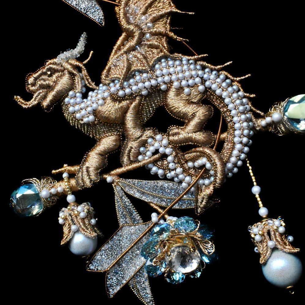 В рамках темы конкурса «Новые грани сияния» слово «сияние» я рассматривала, как творческое начало в человеке, тягу к прекрасному, талант, который каждый человек может в себе развить и приумножить. Созданная мною брошь наполнена символами. Дракон в различных культурах и учениях толкуется по-разному, в данном случае для меня он- символ мудрости, силы и хранитель доступа к тайным знаниям.