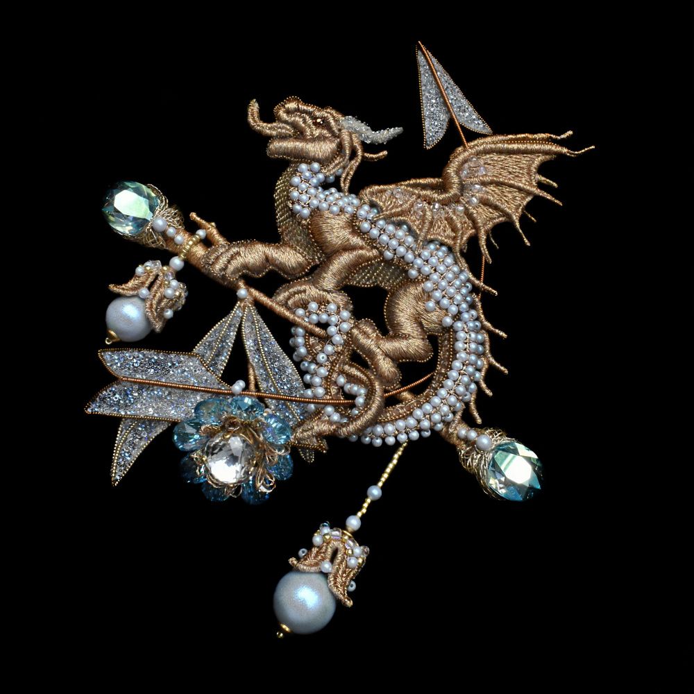 Дракон охраняет сияющий цветок, сплетенный из хрустальных капель цвета неба. Этот цветок и есть творческая частица души человека, его талант. Тело дракона обвивает стрела, олицетворяющая собой заданный вектор в творчестве, путь, который каждый из людей выбирает для своей жизненной реализации. Таким образом, объединив все вышеизложенное, смысл , заложенный в броши можно выразить так - выбрав свой путь, сохрани и сбереги свое внутреннее творческое сияние, стремись к его развитию и обогащай его новыми знаниями и гранями .