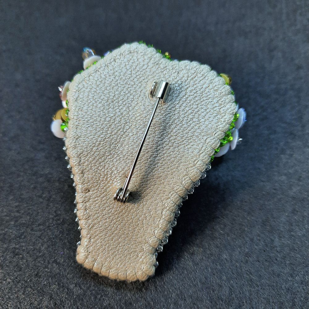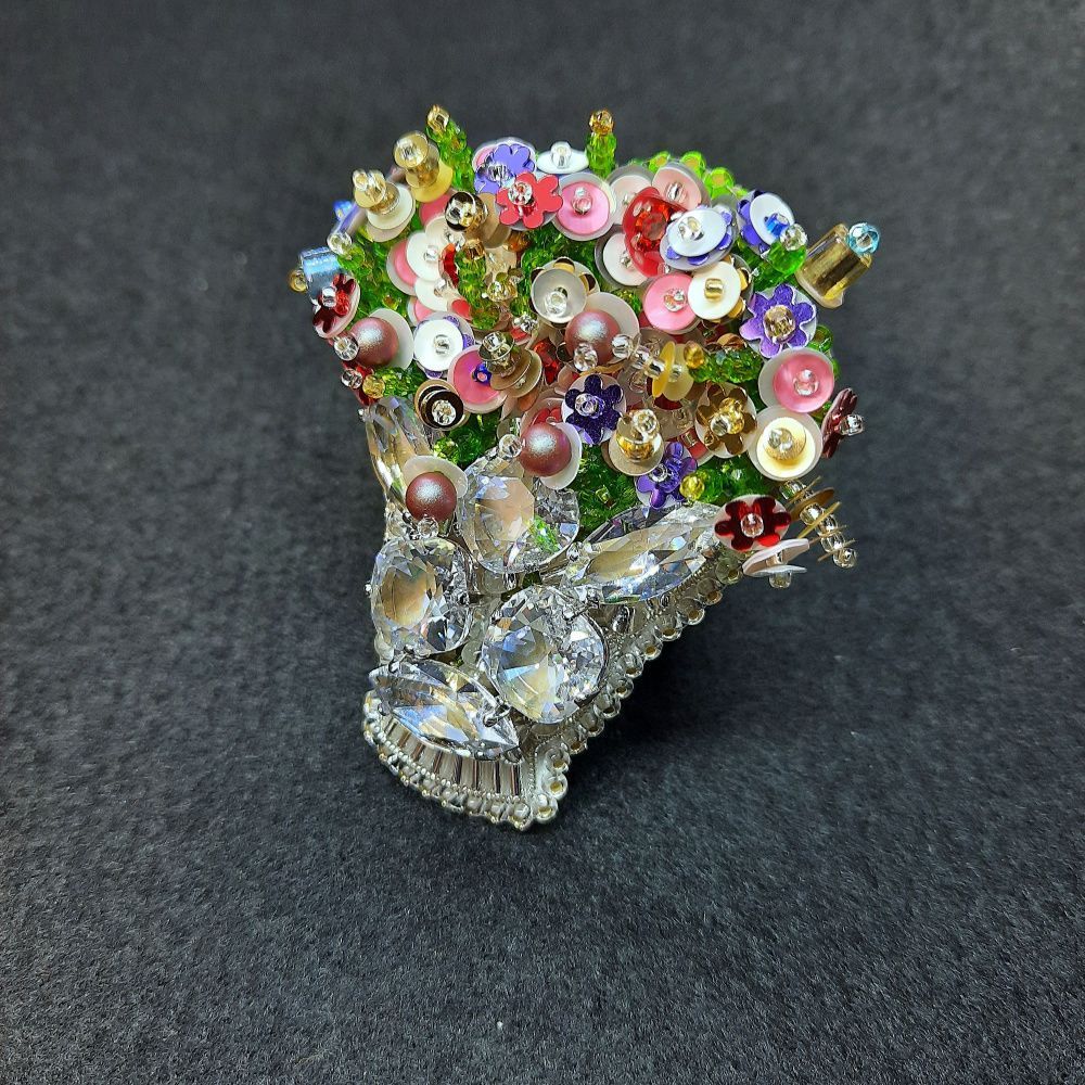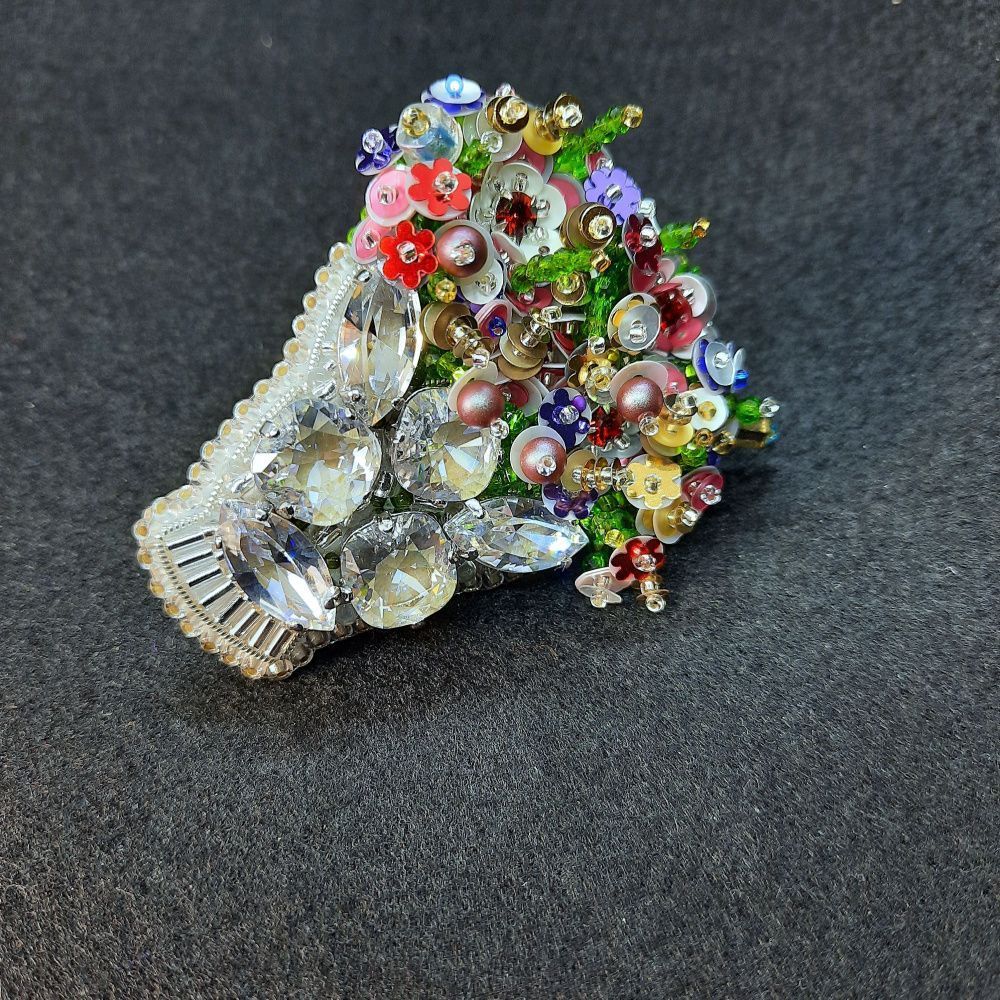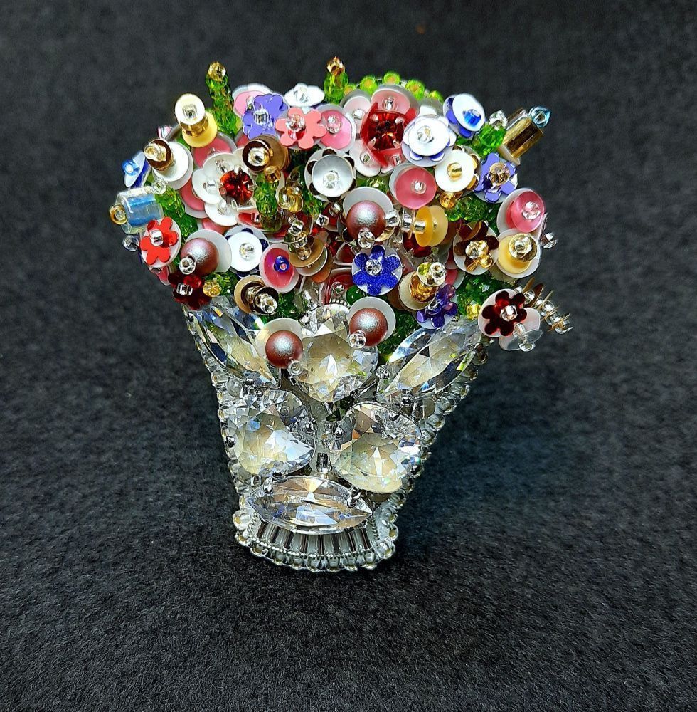 Работа представлена в виде броши – прозрачной вазы с полевыми цветами. Сверкающие грани