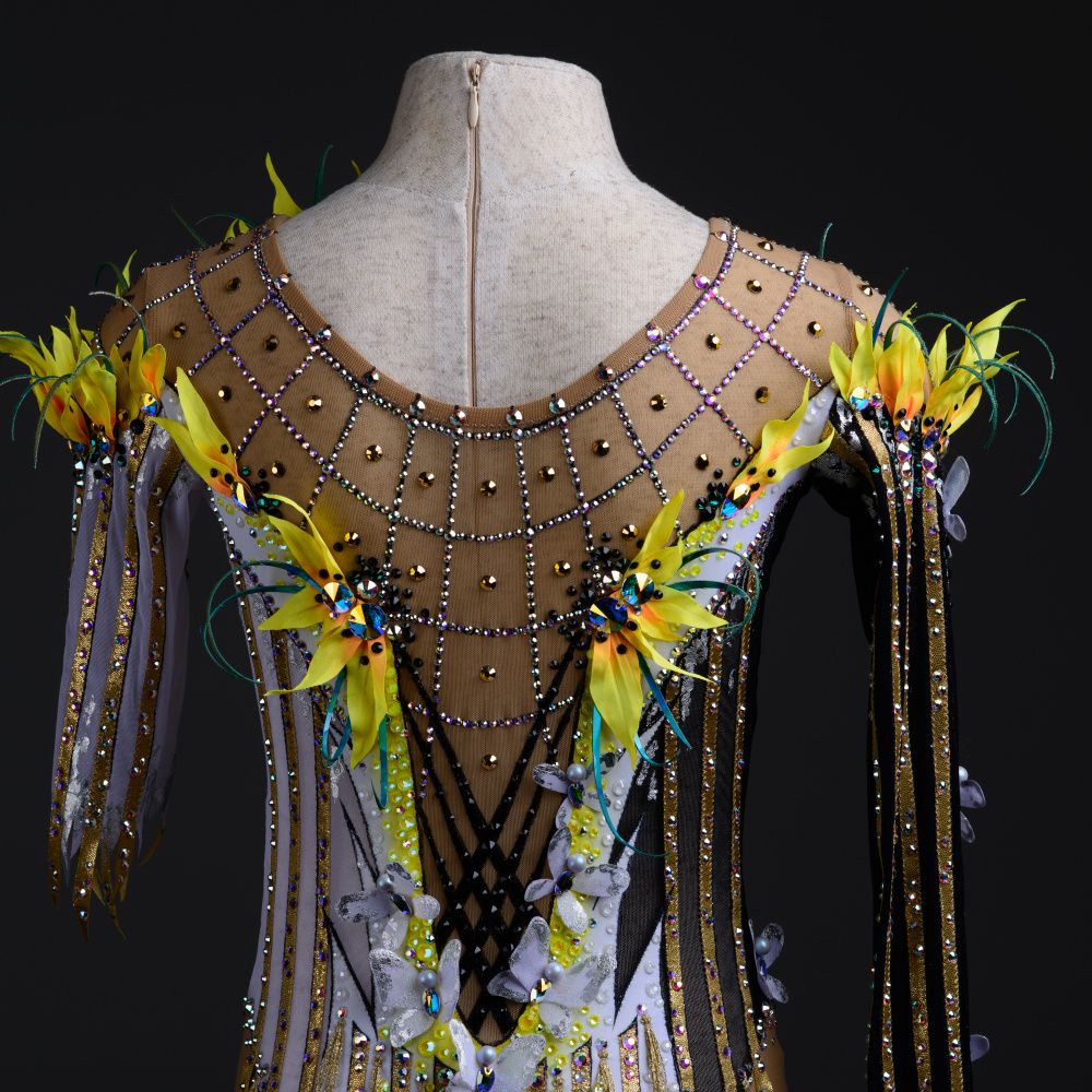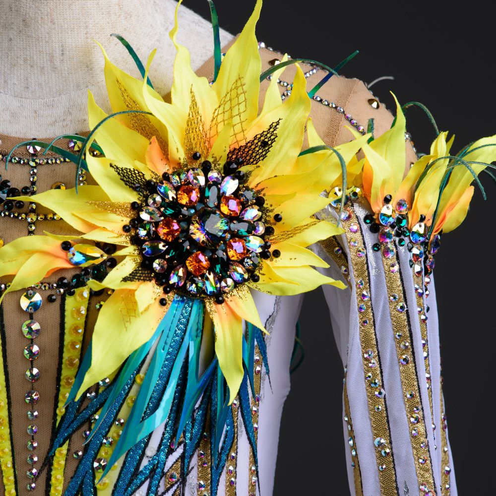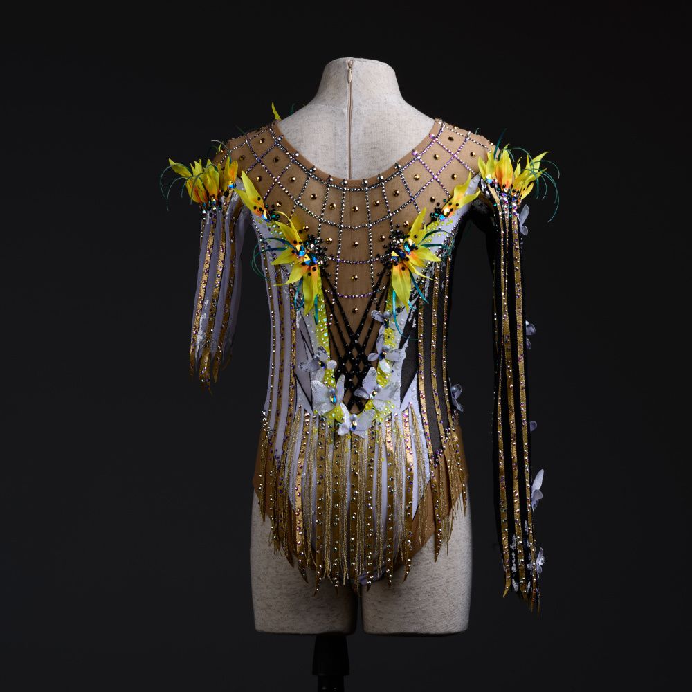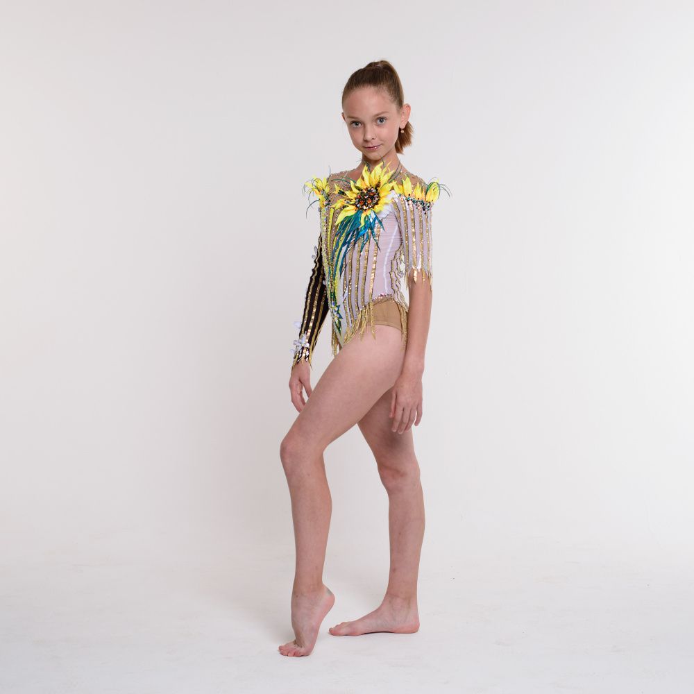 Центральным символом в нашей работе является подсолнух - это символ тепла, радости, стремительности и благодарности. Именно солнцу он обязан своей красотой, ведь каждый раз он раскрывается при его появлении, непрерывно поворачиваясь в направлении солнечных лучей. На наш взгляд, эта работа является наглядным подтверждением фантастической истории происхождения этого чудесного цветка. В одном из древнегреческих мифов    повествуется о том, как водяная нимфа по имени Клития была выброшена из прохладных глубин на берег песчаного острова.   Очарованная ярким светом, она отдыхала на берегу и удивленно наблюдала за невидимым ею дотоле золотым солнечным шаром, который передвигался по небу. Это зрелище так завлекло ее, что она пожелала всегда любоваться этим небесным светилом. Мольбы Клитии были услышаны. Ее русалочий хвост ушел в песок, приковав ее к месту, ее серебряные волосы свернулись в лепестки вокруг ее лица, а из ее пальцев выросли зеленые листья. Нимфа превратилась в подсолнух - цветок солнца, чей цвет отражает золото солнечного диска и каждый день следует за его движением. Костюм гимнастки символизирует волю к победе, самосовершенствованию, умение преодолевать препятствия на пути, осознавая, что жизнь состоит не только из светлых полос (черные и белые вставки по бокам) Бабочки - это символ быстротечности жизни, напоминание о том, что жизнь должна быть окрыленной счастьем, прожита достойно, легко!