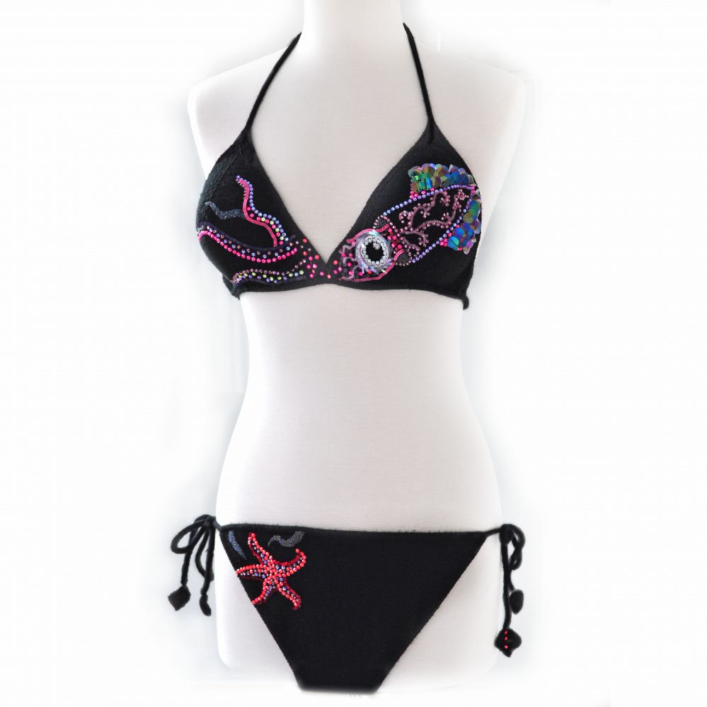 Где как не в темных глубинах океана открываются новые грани сияния? Глубоководные обитатели еще далеко не все изучены, а сколько еще их предстоит открыть? Сколько завораживающе мерцающих неоновых чудищ сейчас охотится и таится в глубинах мирового океана... Именно такими образами вдохновлялась я, когда нащупывала идеи для конкурсной работы: черная глубина океана и игра неоновых огней ее обитателей. Так пришёл образ кальмара, а в качестве носителя изображения решила использовать раздельный черный купальный костюм. Его для меня связала моя мама.