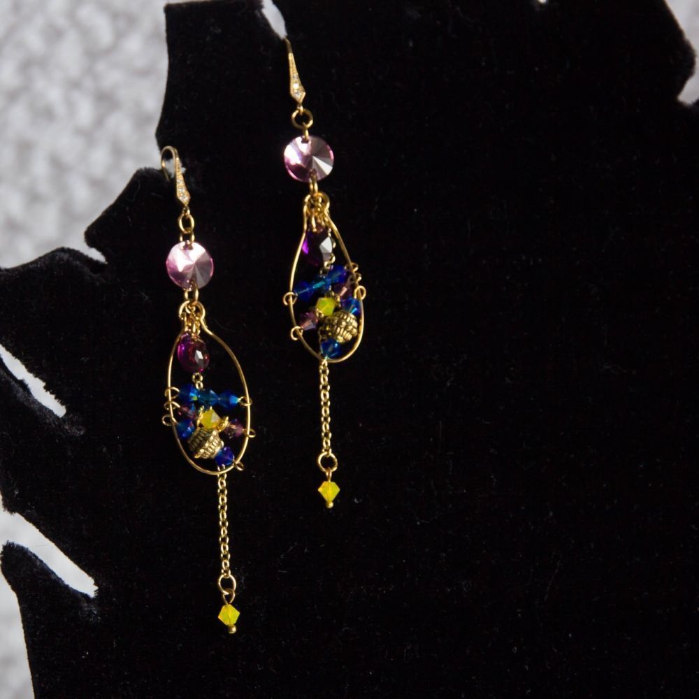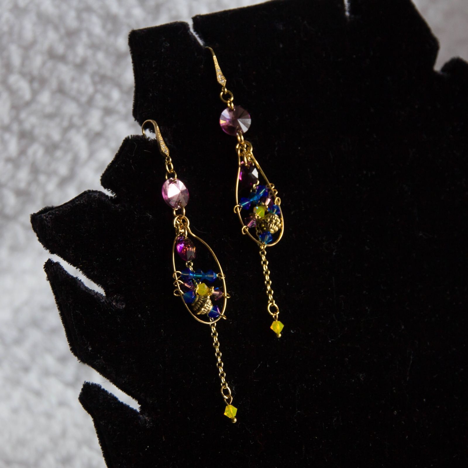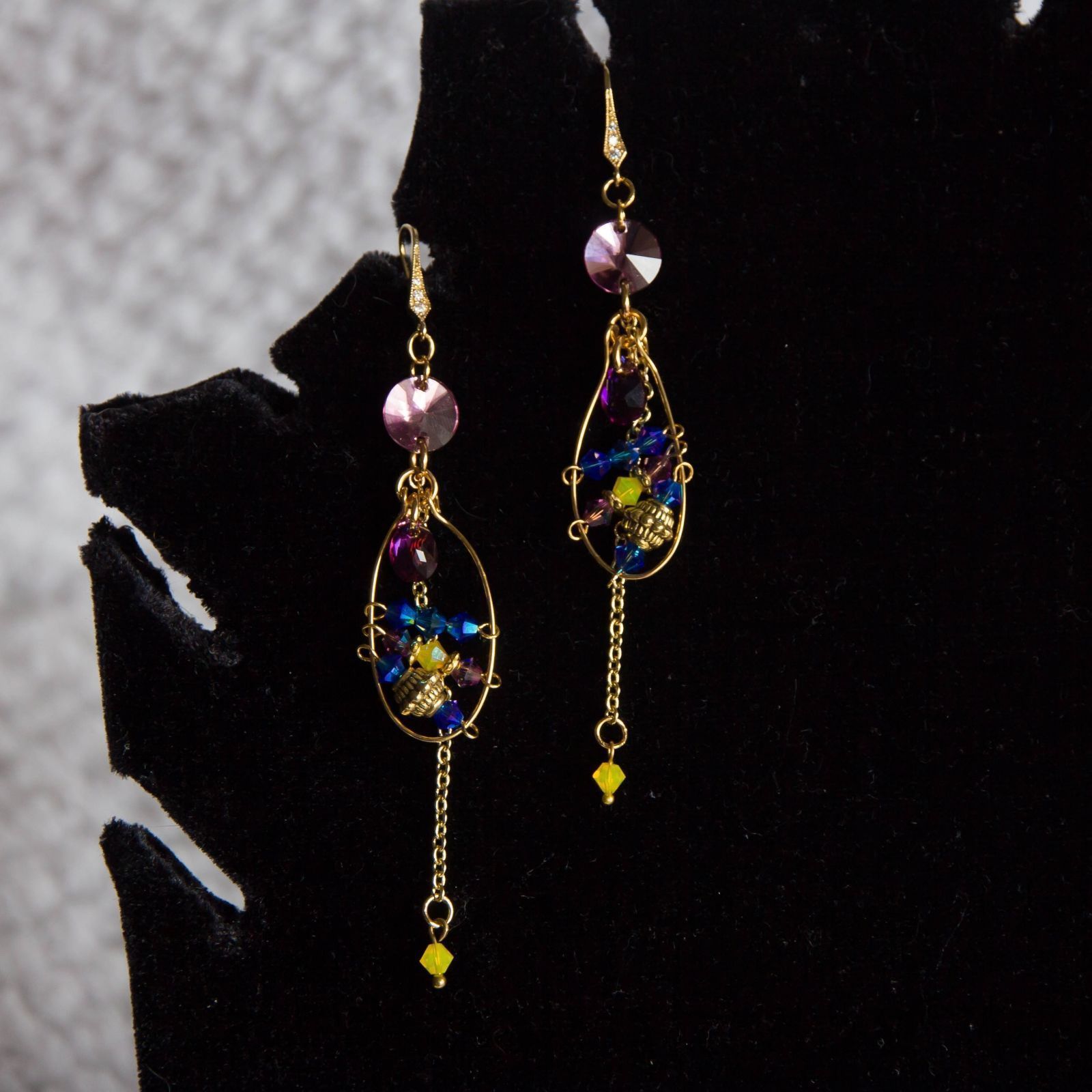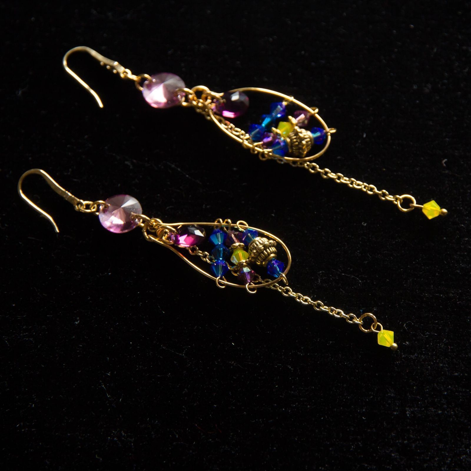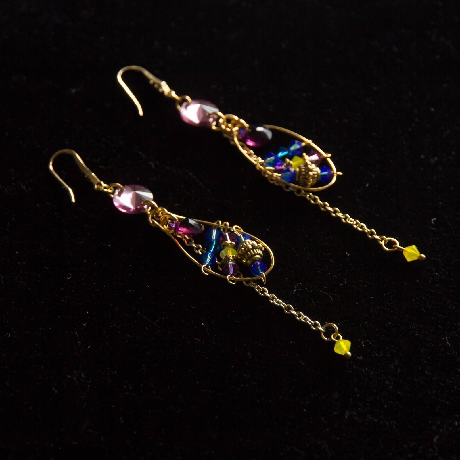 Яркие насыщенные цвета Сваровски - это всегда красиво, но на создание этих сережек меня вдохновили новые волшебные оттенки конкурсных кристаллов и подвесок Shimmer так похожие на переливы шелковой ткани. Яркие и в то же время нежные оттенки. Они чудесно сочетаются между собой, искрятся и переходят один в другой.