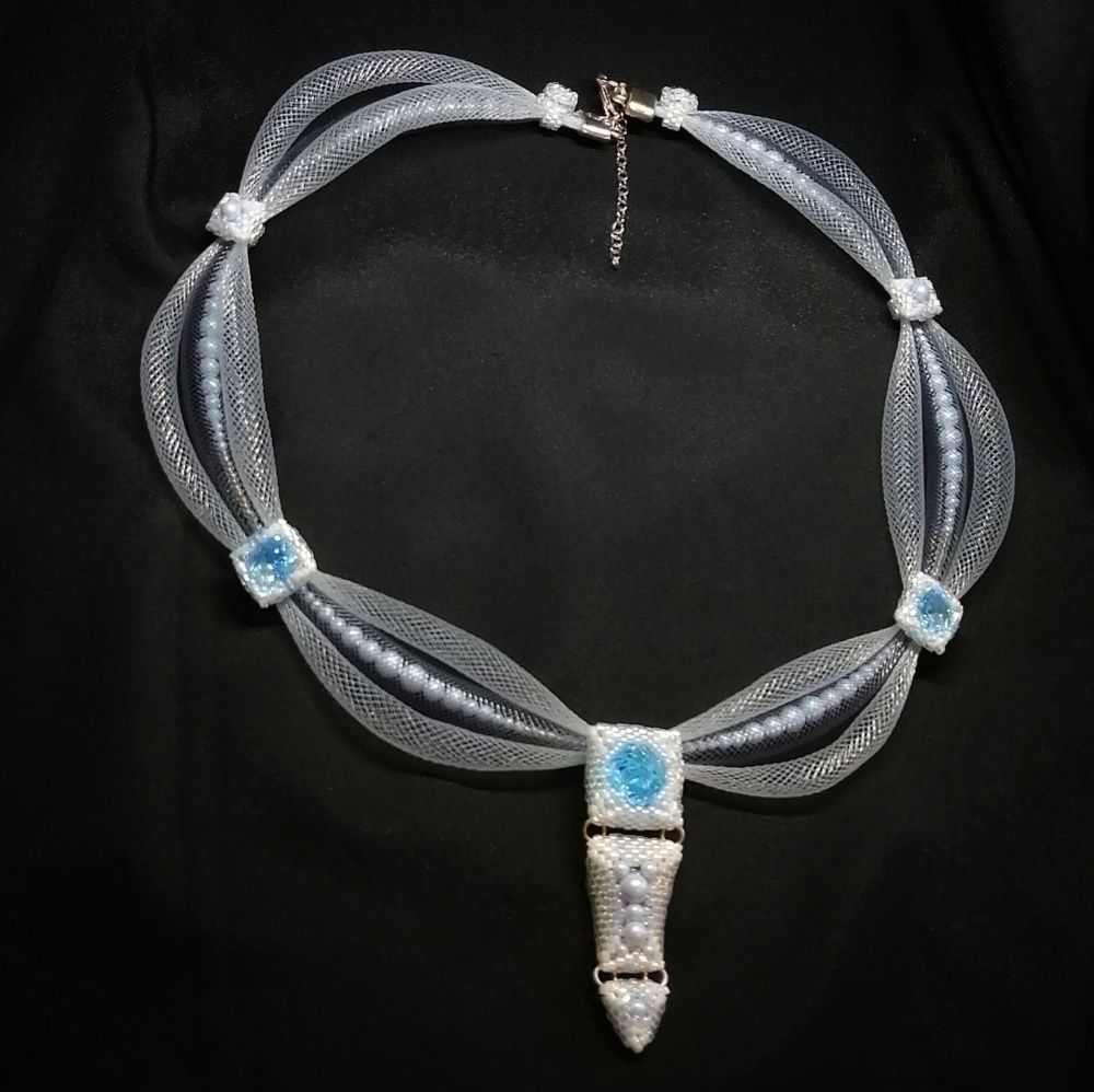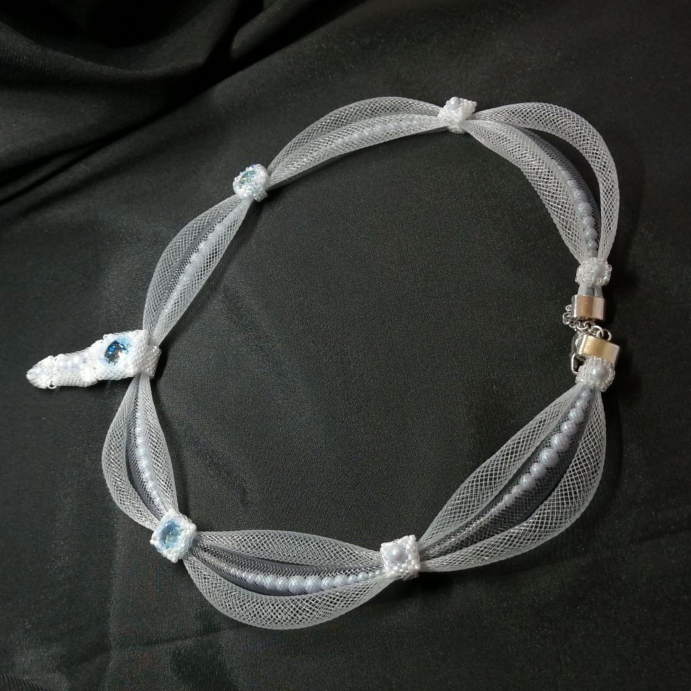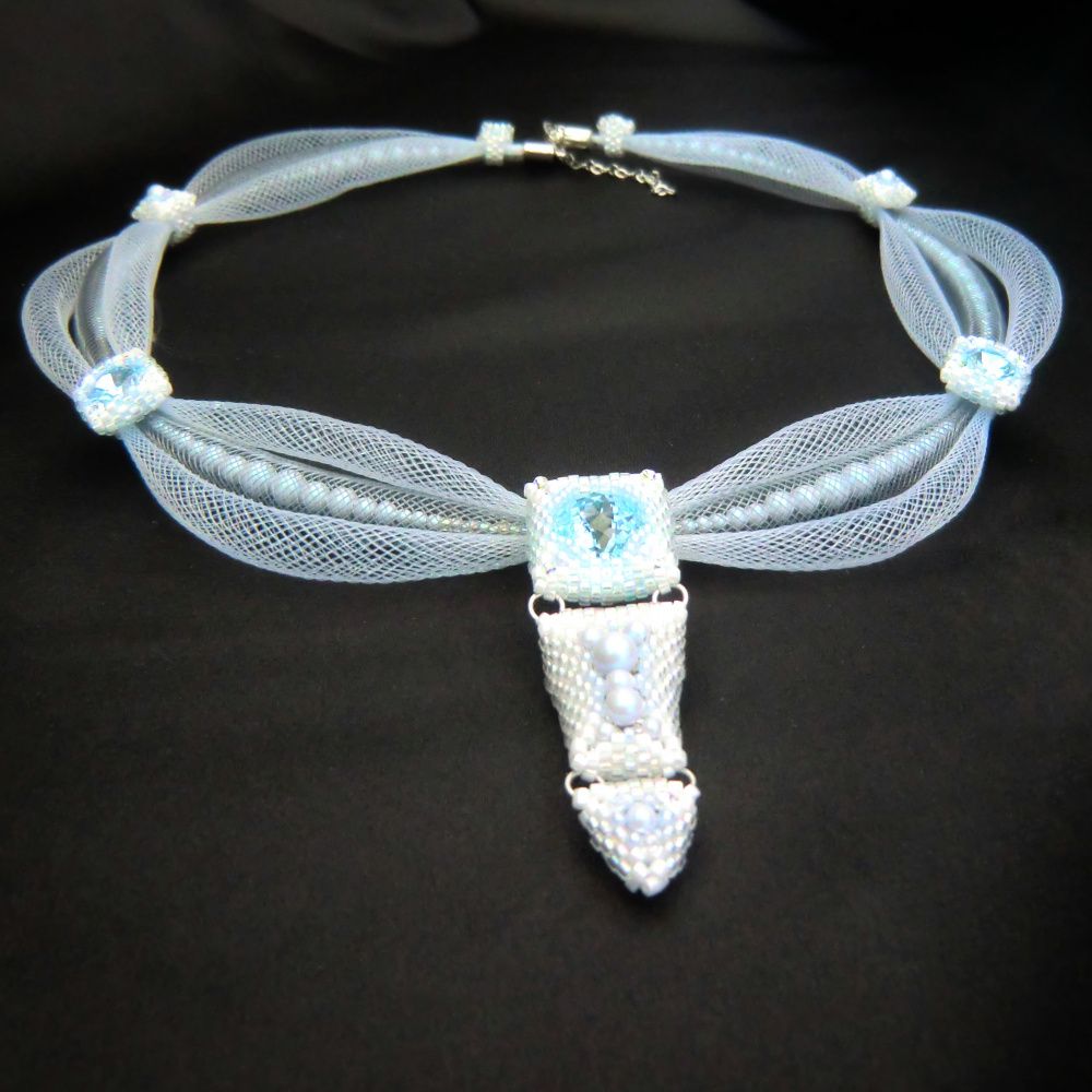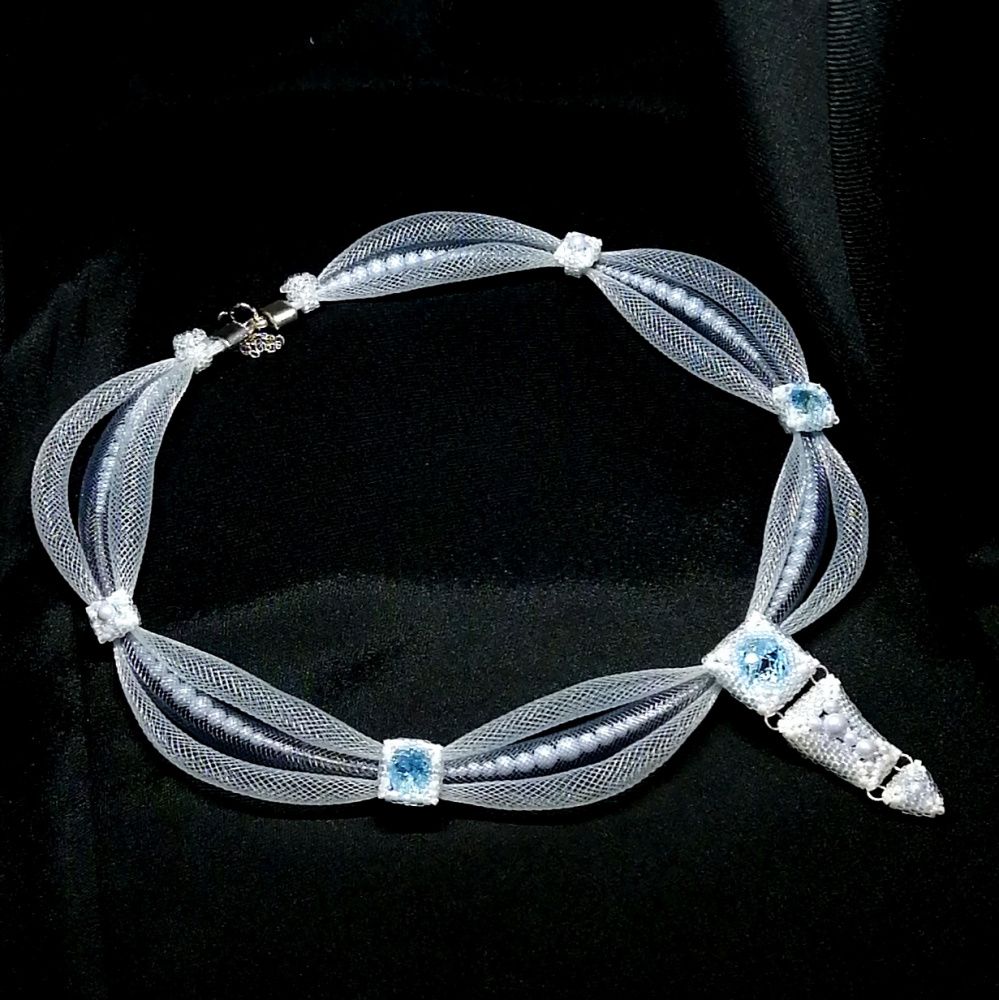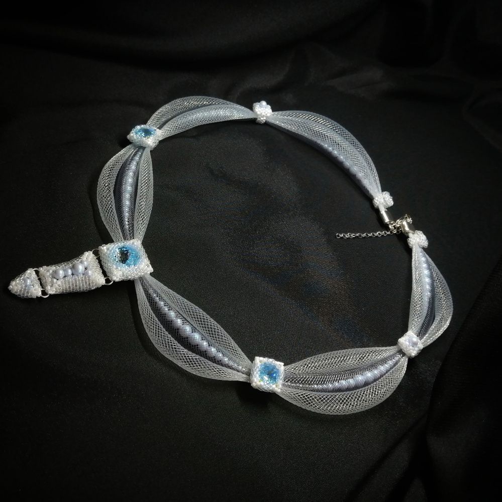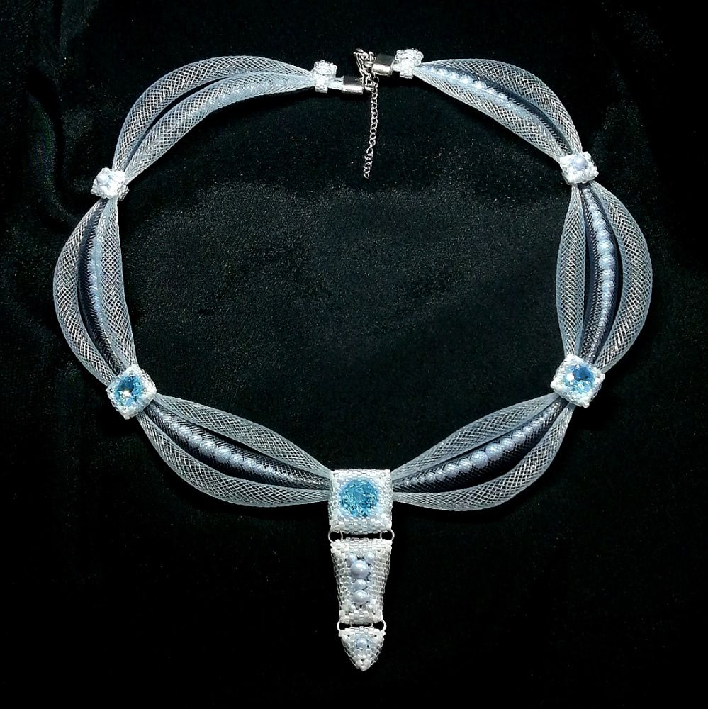 Колье «Грани» являет собой дань уважения к Даниэлю и Манфреду Сваровски. За 125 лет существования компании огранка кристаллов стала интересней и это показывают использованные в работе Dome Round Stone и Cushion Square. Эффект АВ не утратил своей популярности с 1956 года. Бисер и бусины Swarovski с эффектом АВ, использованные при создании украшения, подчеркивает цвет кристаллов и хрустального жемчуга.