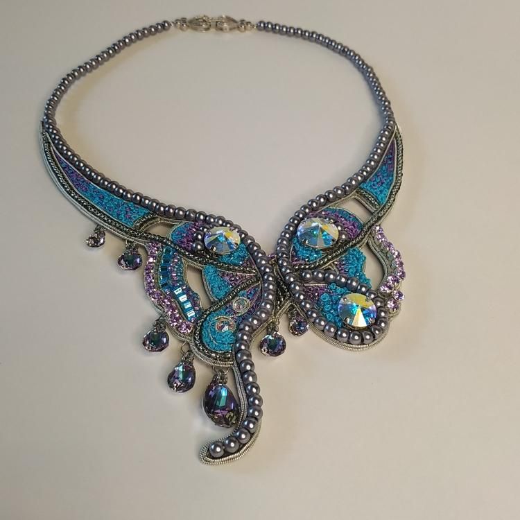 Идея создать именно ее родилась спонтанно, когда сидя на берегу озера в середине августа, я увидела первую бабочку в этом году. Тон всего изделия несомненно задали кристаллы Pear Cut Pendant Crystal Vitrail Light. Их необыкновенное сияние и переливы цветов никого не оставят равнодушным. Вся палитра и техники работы подбирались таким образом, чтобы подчеркнуть те самые кристаллы.