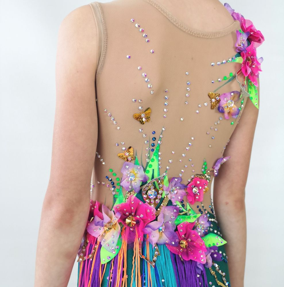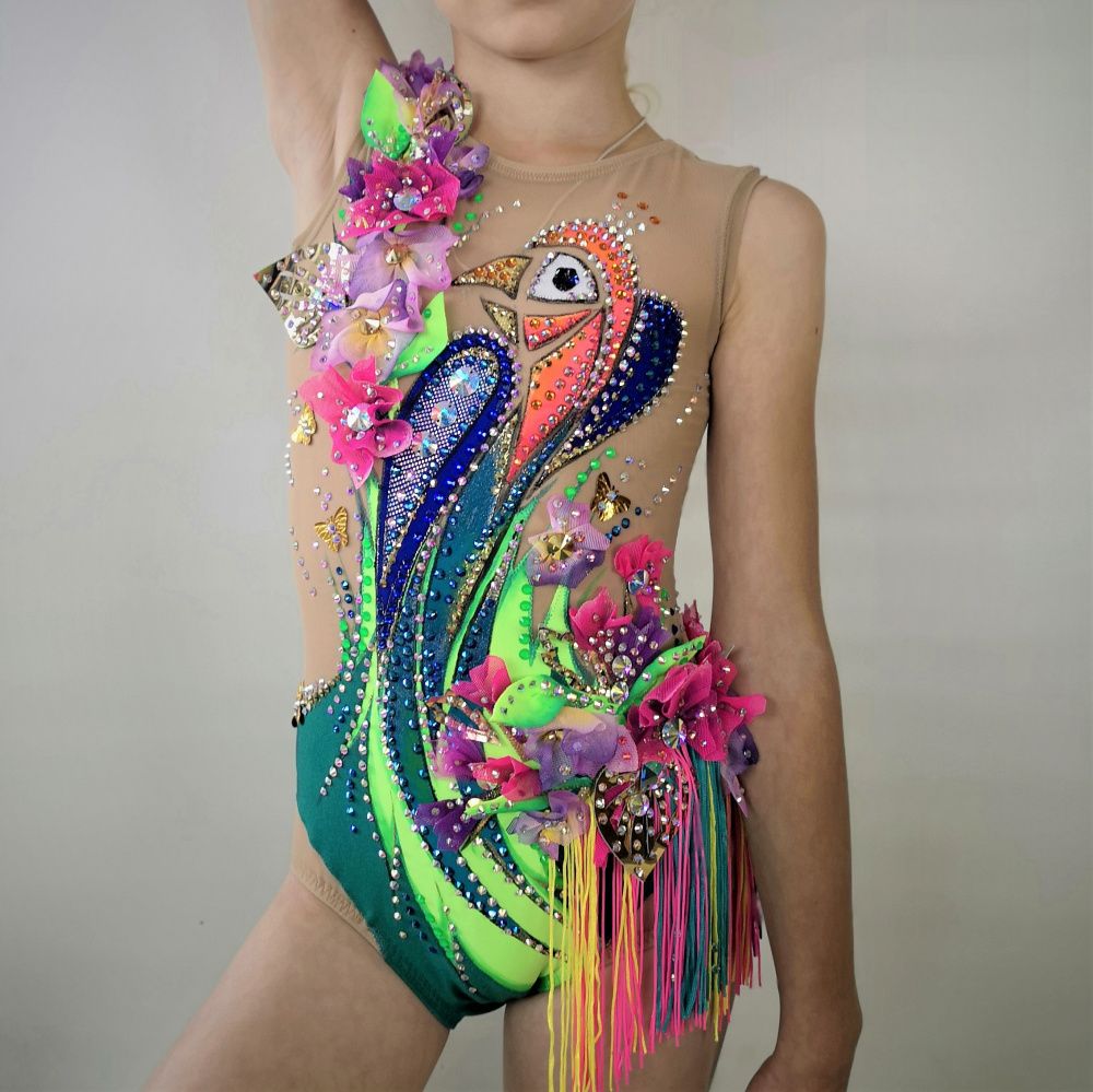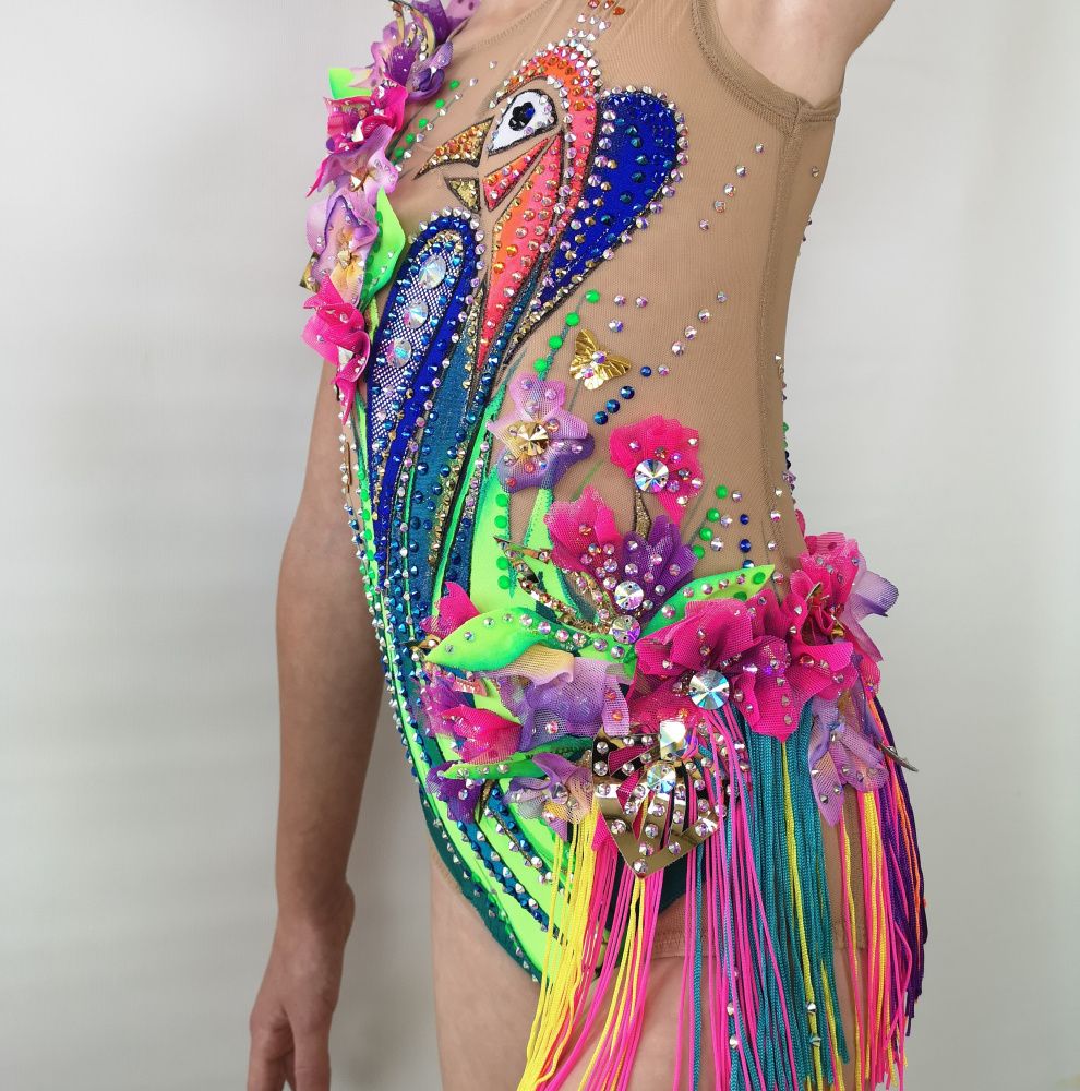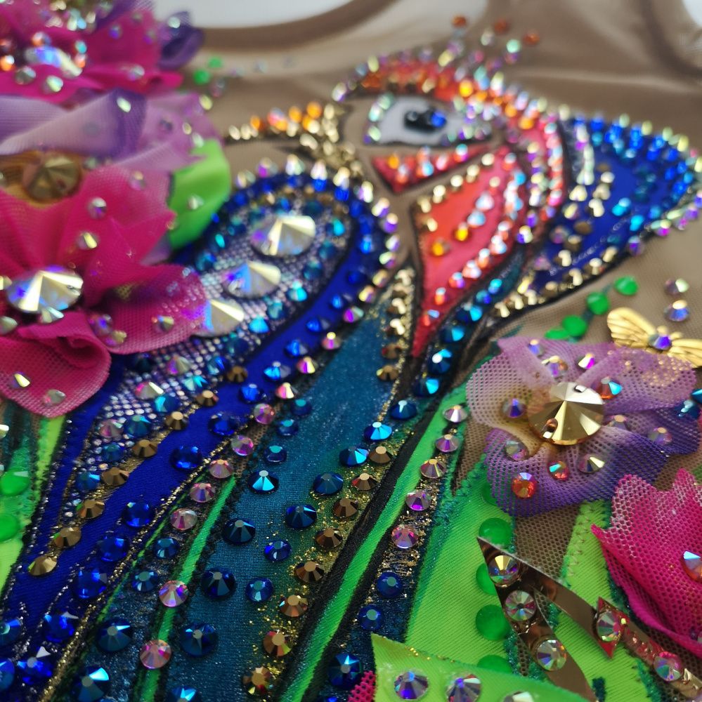 Волшебная птица на купальнике распадается на множество кусочков. Её изображение дробится, как отражение в граненом зеркале. При этом строгие геометрические формы с одной стороны смягчаются растительным декором, а с другой - подчёркиваются сверкающими всеми гранями кристаллами. И в свете софитов купальник засверкает по-новому!