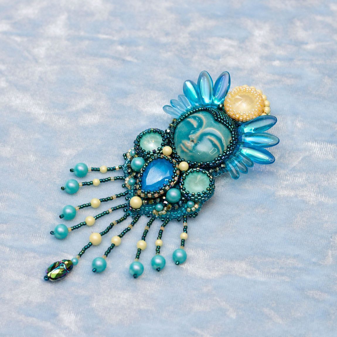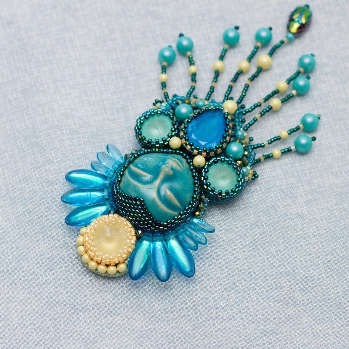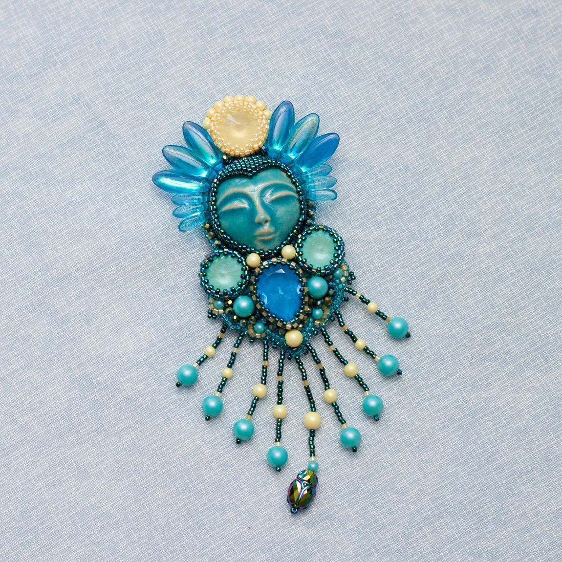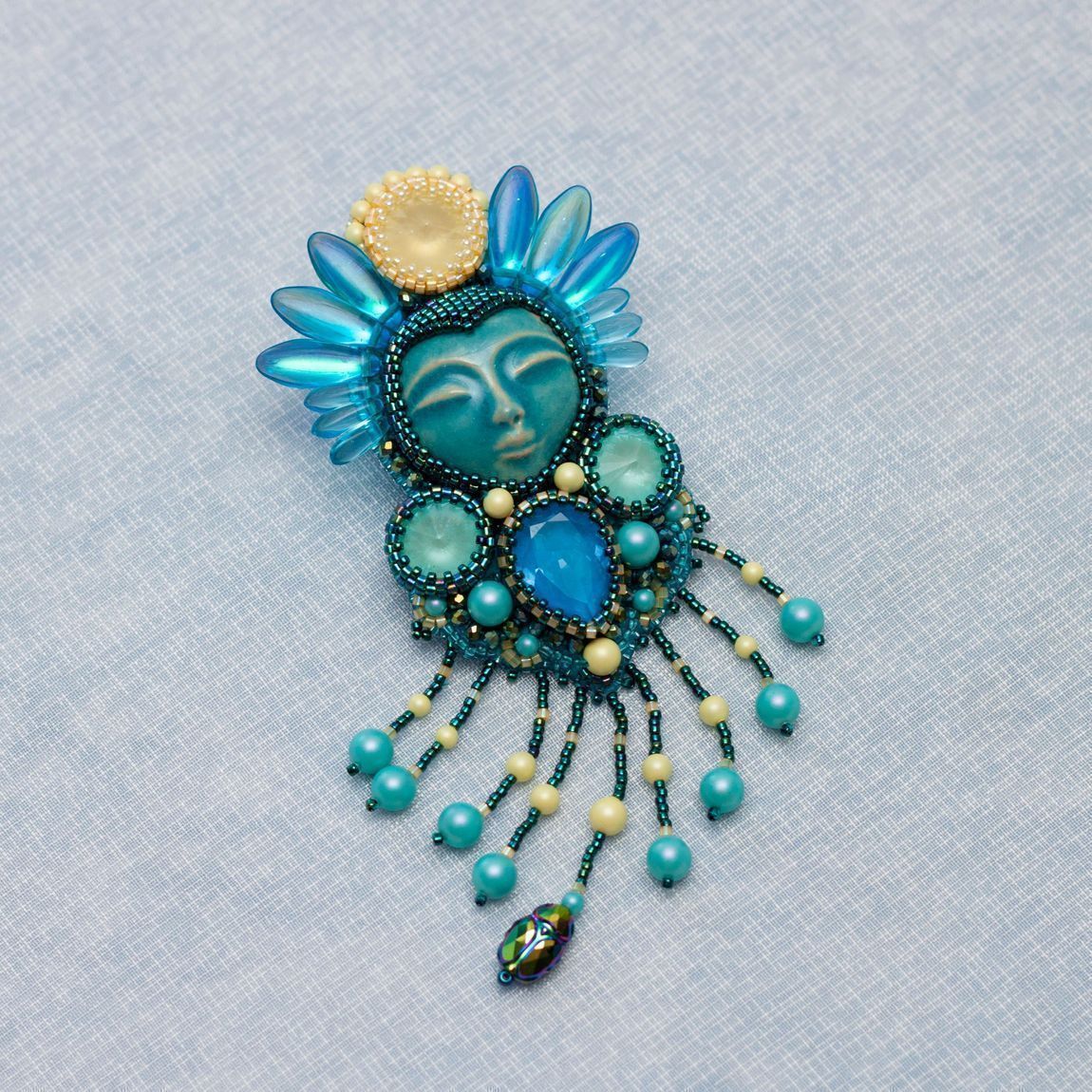 Брошь ХАТХОР - дуэт керамического кабошона и кристалла голубой электрик, который дополнили нежные оттенки желтого, мятного, бирюзового цветов кристаллов и жемчужин.