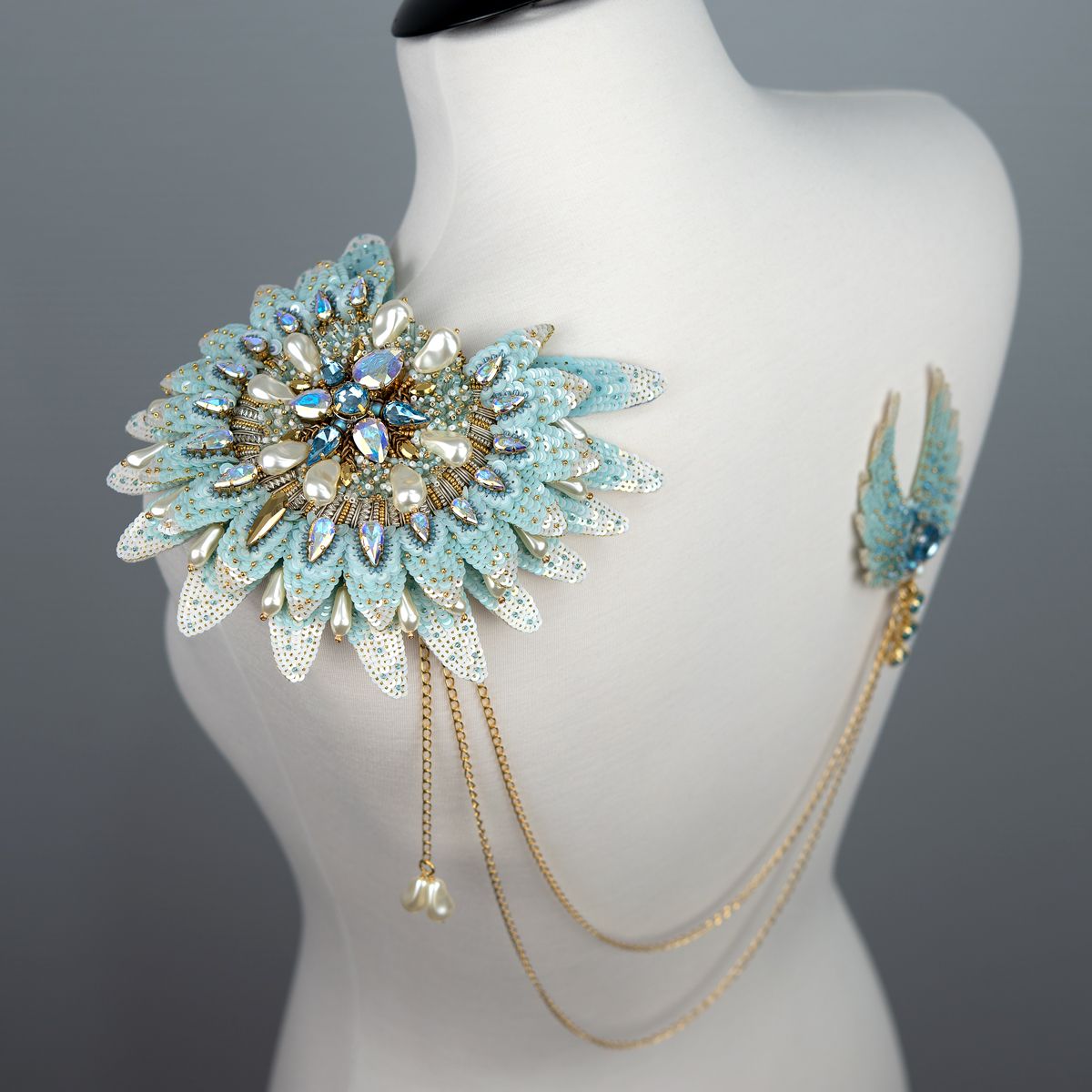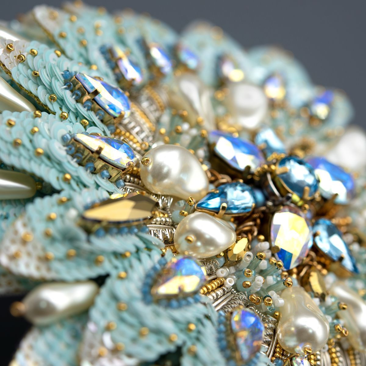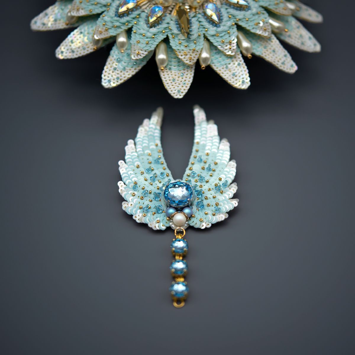 Нежно-голубая цветовая гамма, в сочетании с золотой фурнитурой, создает атмосферу небесной легкости и величия, а каплевидные и круглые кристаллы Swarovski напоминают слезы радости или капли росы, которые переносят нас в миры чудес и загадок. В своей работе я постаралась  изящно переплести  реальное ( фактуру, цвет)с фантастическим ( форма и содержание), выявляя тонкую грань между нашей природой и мистическими тайнами зазеркалья.