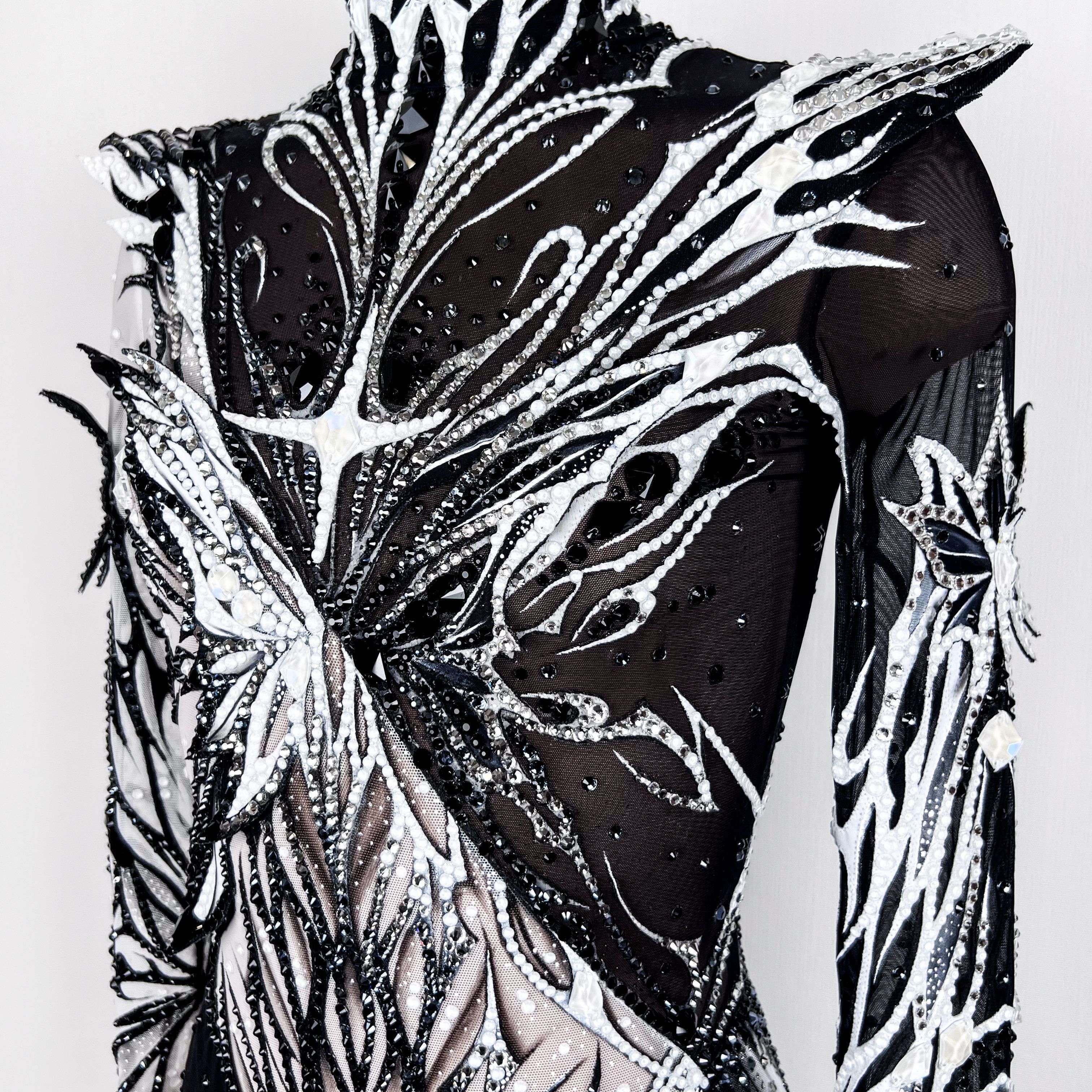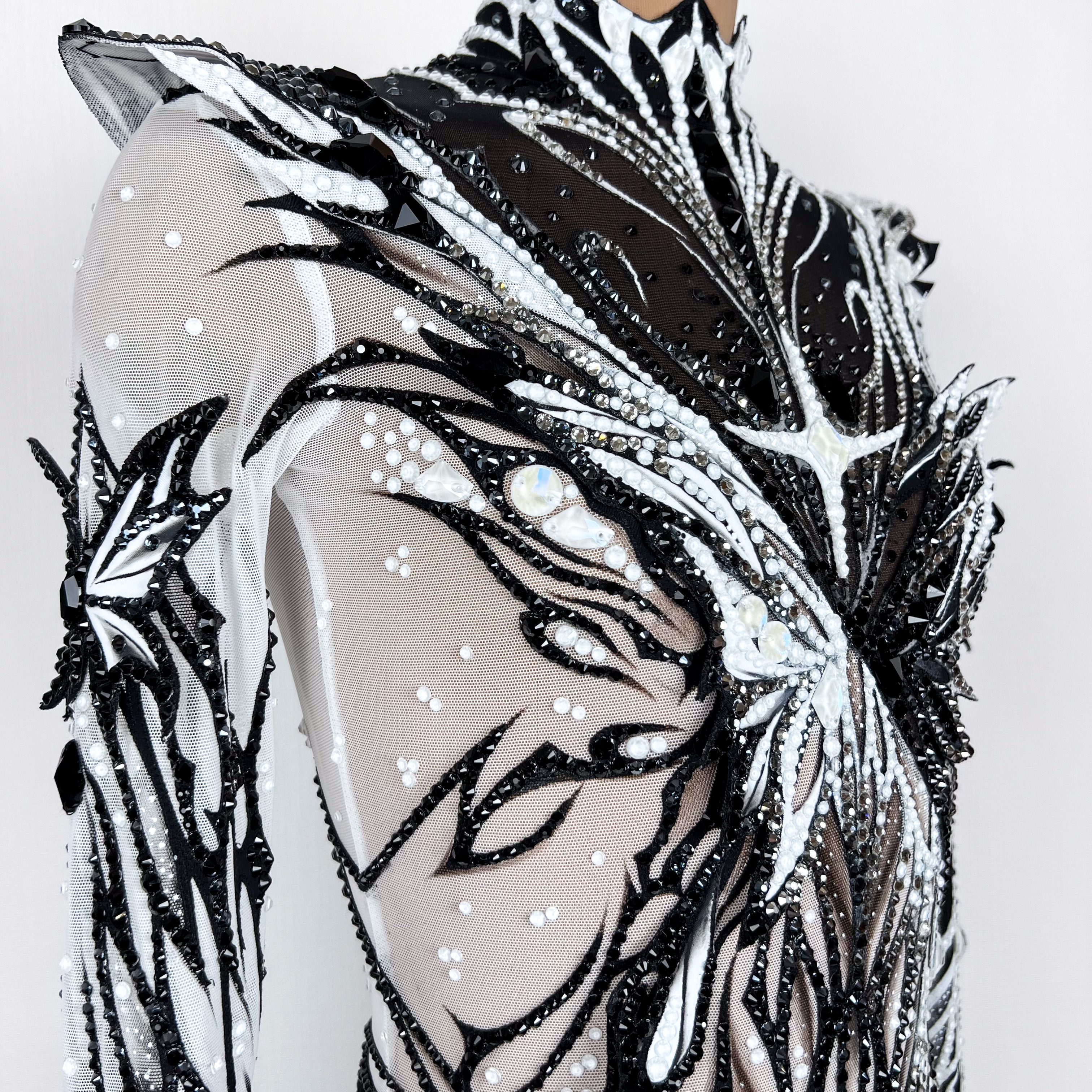 Бабочки - отражение природы зазеркалья - на костюме непривычно статичны, будто выставлены в галерее, как удивительные представители параллельного мира, не естественные для нас. А зритель подобно исследователю может рассмотреть этих чудесных существ в разной плоскости, под разными гранями.