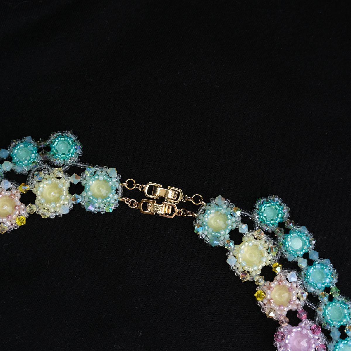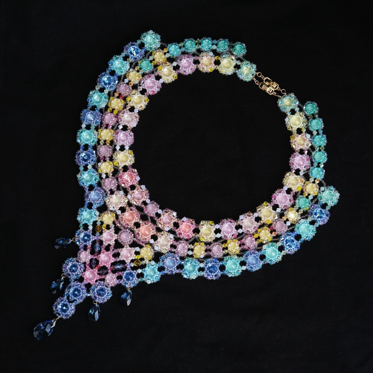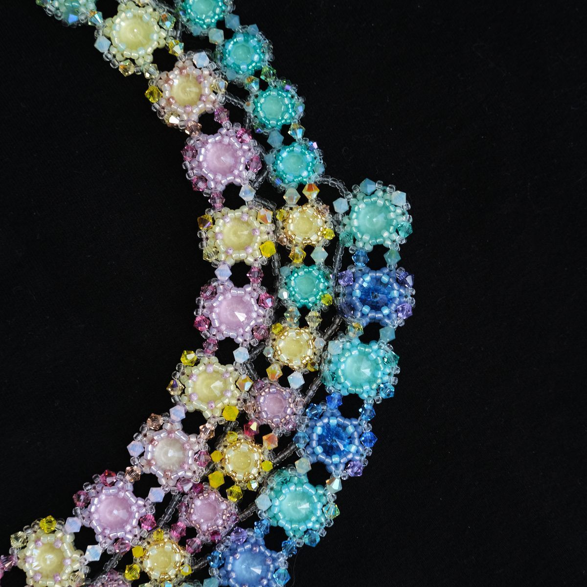 В конкурсной работе применено множество маленьких кристаллов и бусин нежнейших цветов, что позволило отразить красочные переливы утренней Авроры.