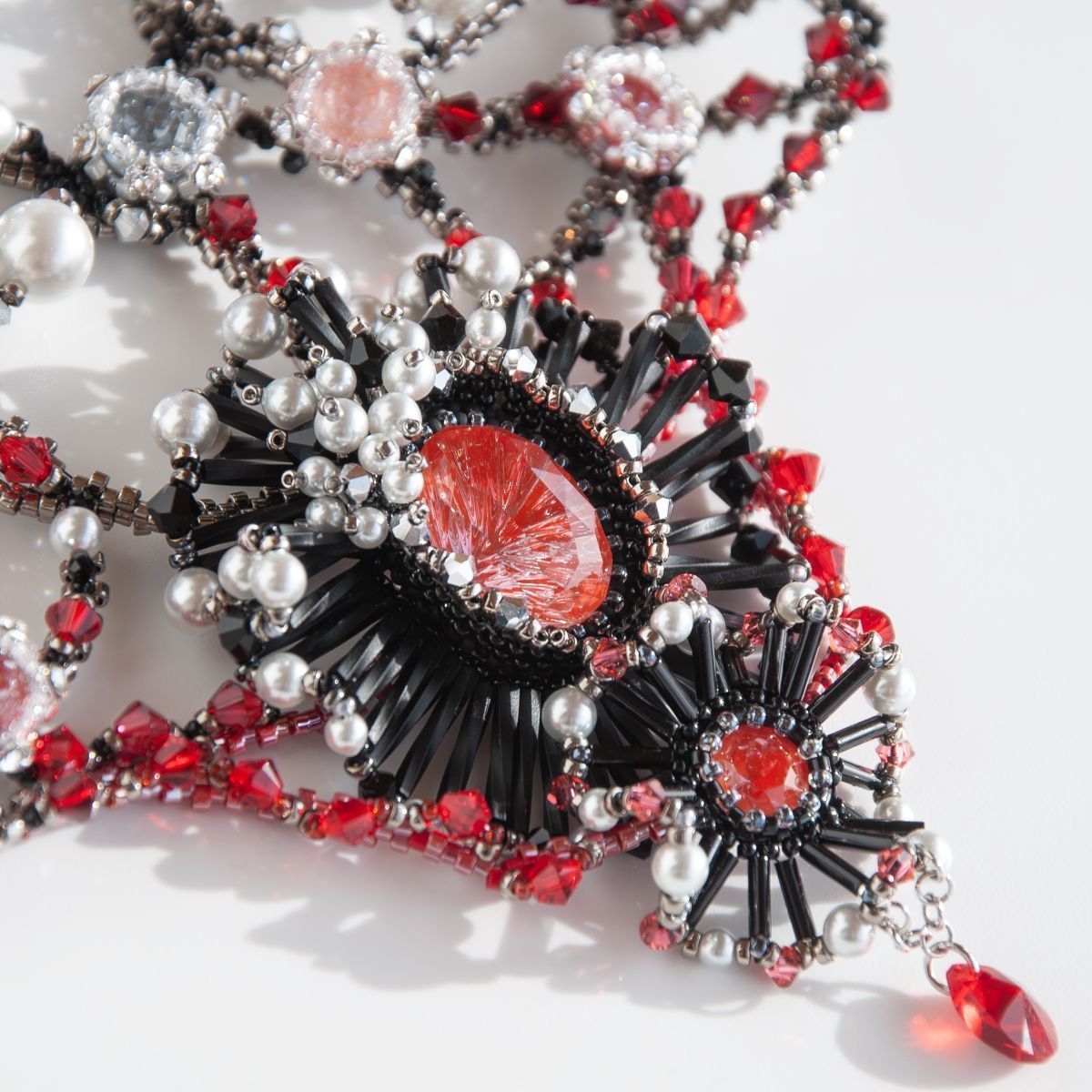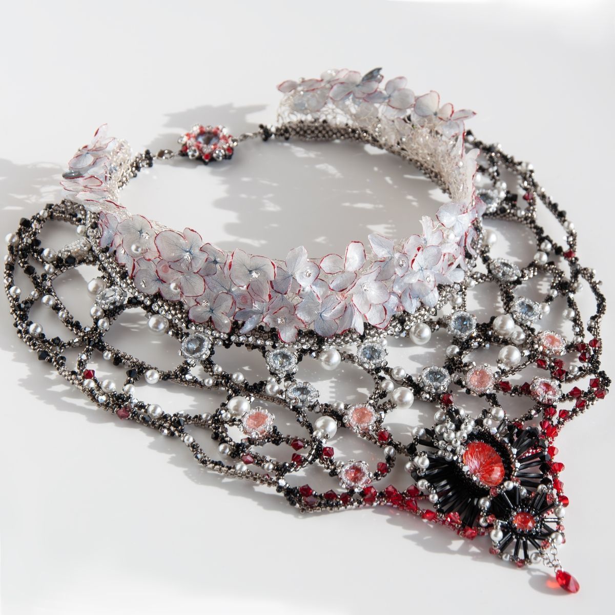 Колье «Фата-Моргана» воплощает таинственную игру притяжения и обмана. Невесомые цветы в верхней части украшения, отражают хрупкость и притягательность фантастических образов. Пройдя границу невозврата, сознание, окутываемое темной кристальной материей, погружается в глубины неведомого. В центре композиции — сущность, манящая своим холодным блеском, алчно впитывающая эссенцию жизни.
