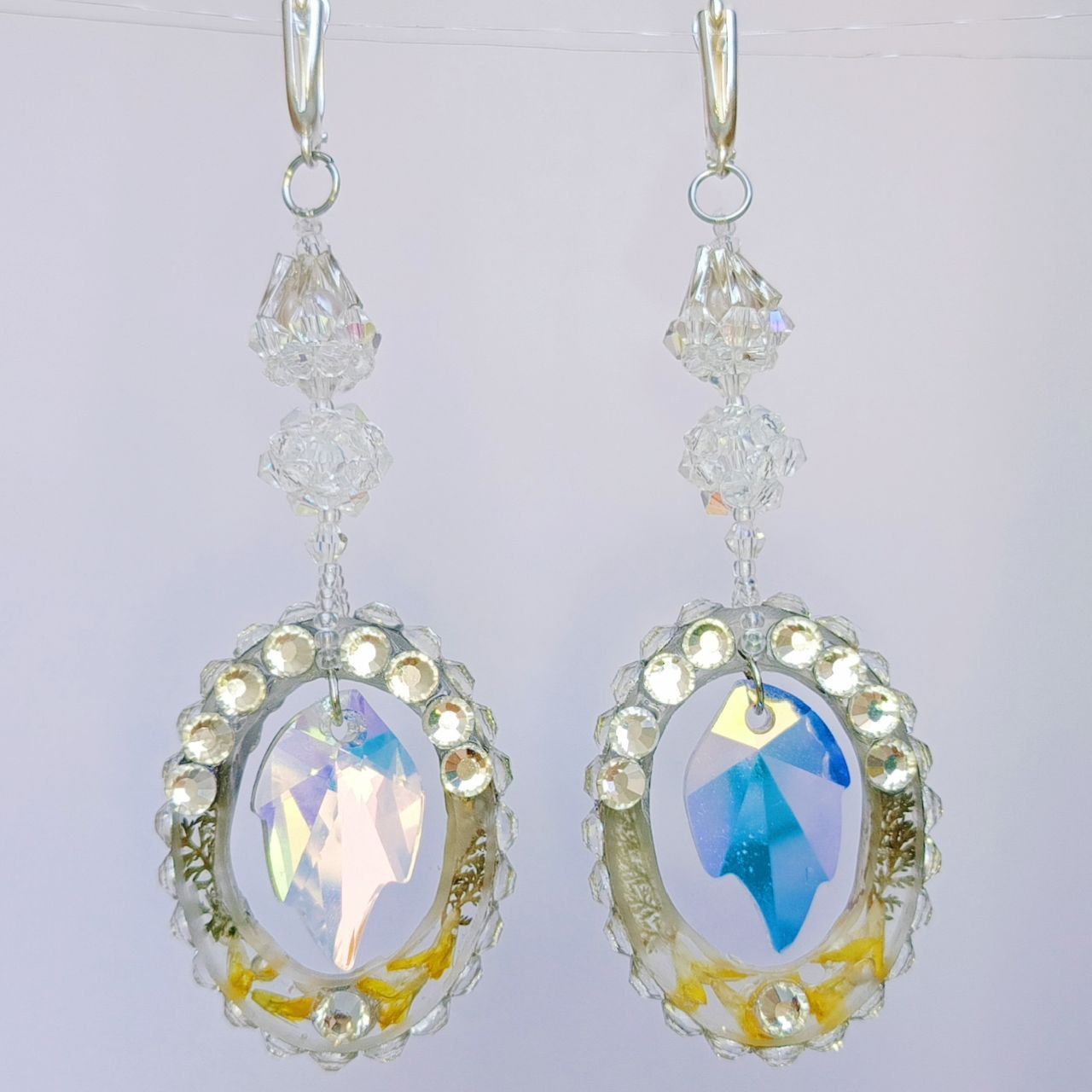 В моей работе использованы живые цветы в эпоксидной смоле, в форме овала внутри которого находится кристалл в форме листочка, также использованы  биконусы, бисер и клеевые стразы кристальных оттенков, а хрусталь, эпоксидная смола и конечно цветы относятся к тайным чудесам природы.