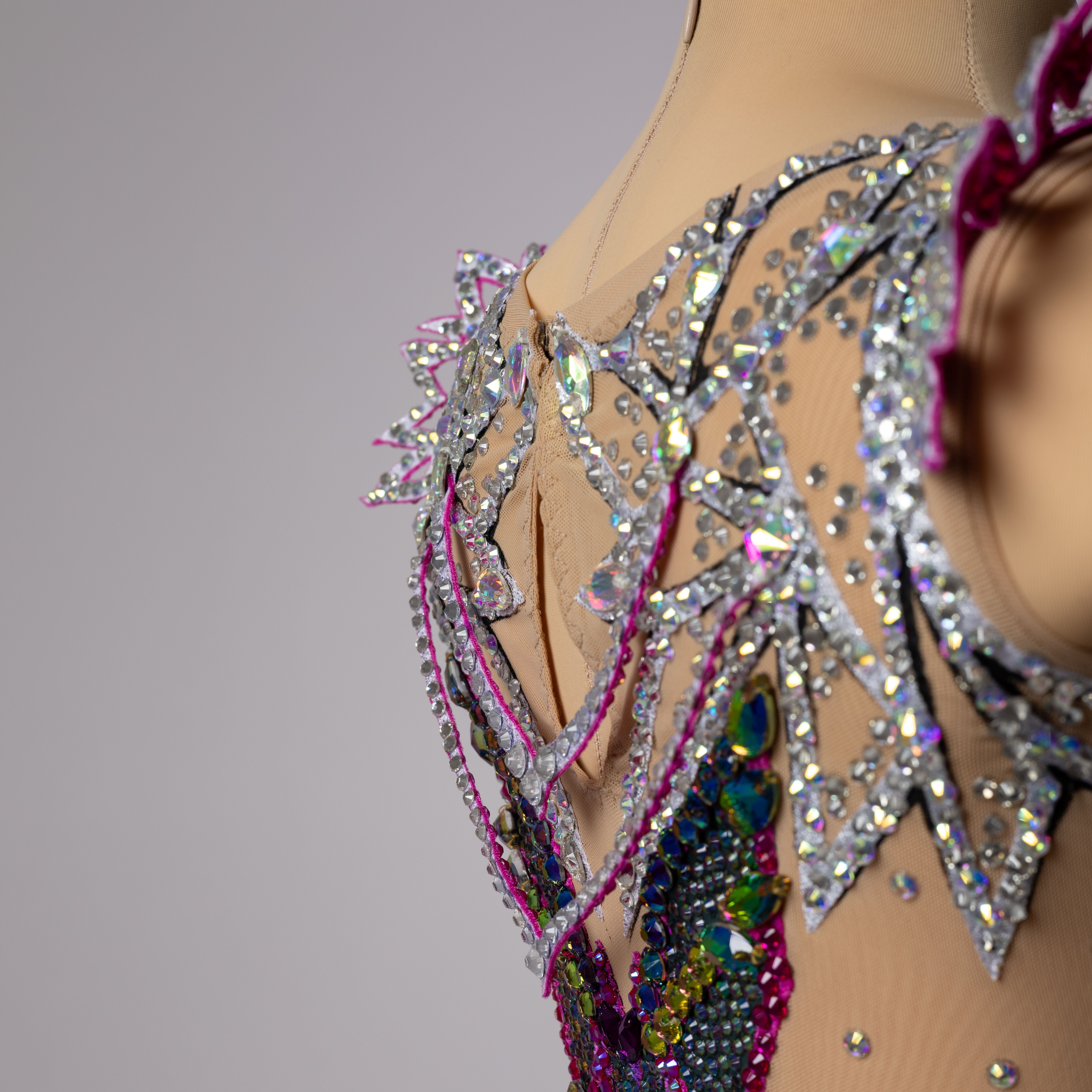 В работе я использовала именно эти сочетания ,чтобы в деталях моего купальника отразилось и зеркальное серебро сказочных озёр, и таинственная темнота зачарованного леса, и сверкание  фантастических существ, его населяющих.