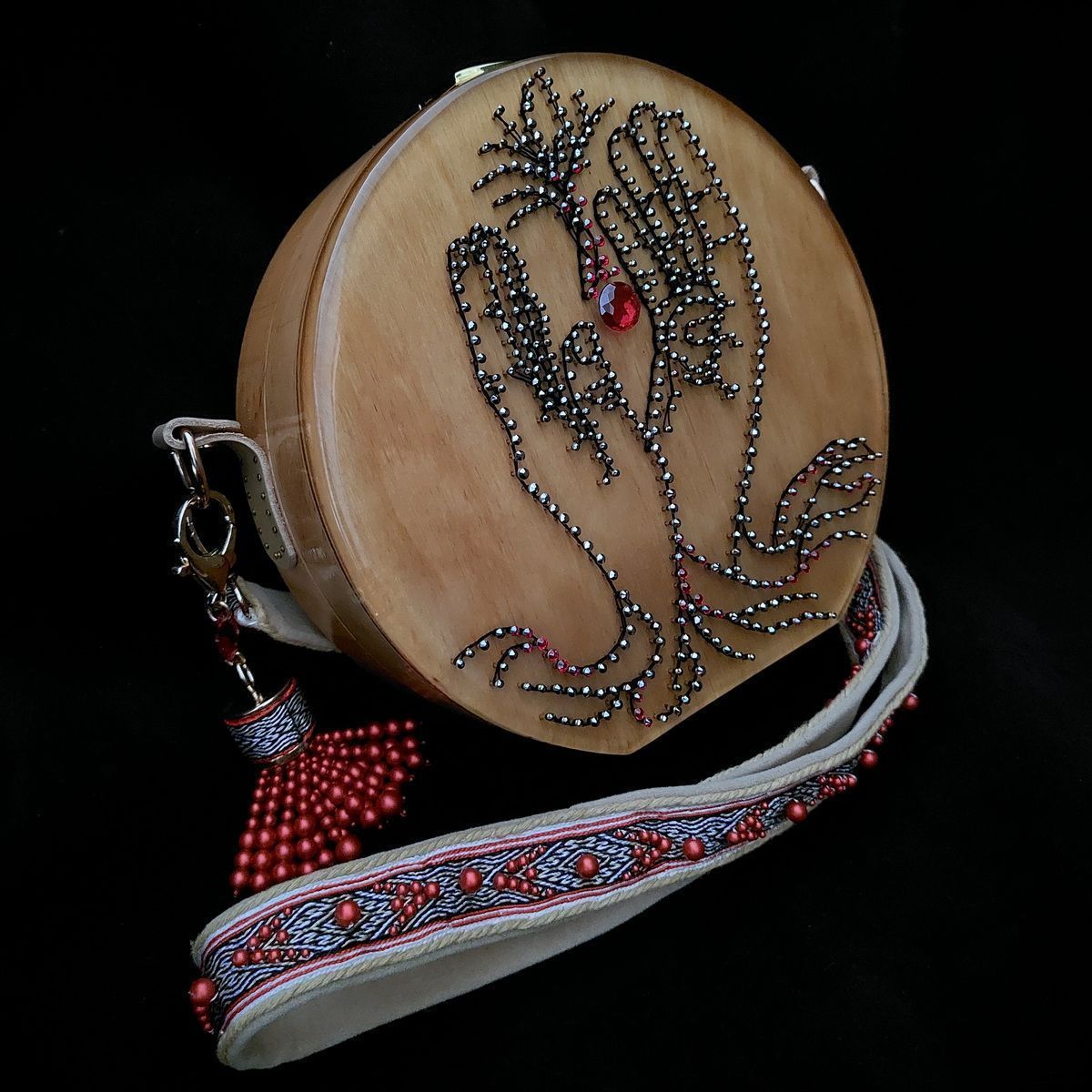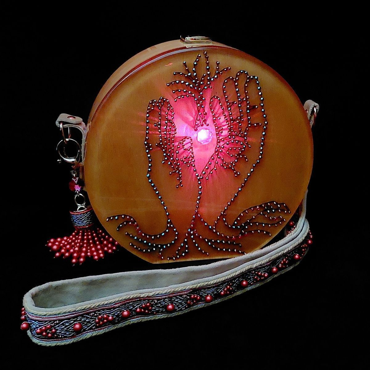 Рисунок для лицевой стороны выполнен в технике стринг-арт и создавался с помощью современных технологий: из фотографии рук при помощи графического редактора я создала чертеж, по которому набила гвозди, а по гвоздям натянула нити. Шляпки гвоздиков украшены кристаллами. Заливка эпоксидной смолой придала рисунку дополнительный визуальный объём. Под центральным кристаллом спрятан светодиод, придающий ему свечение.