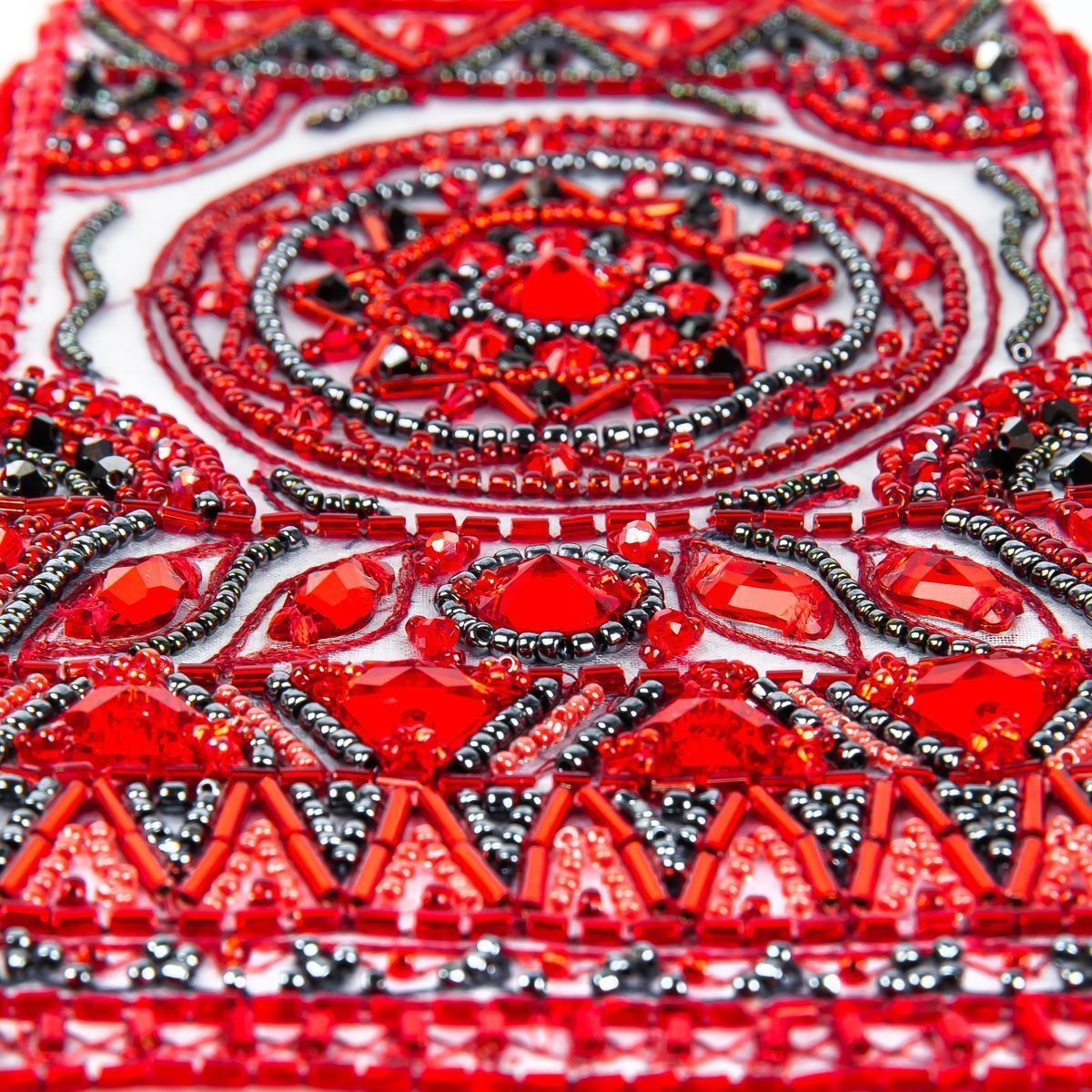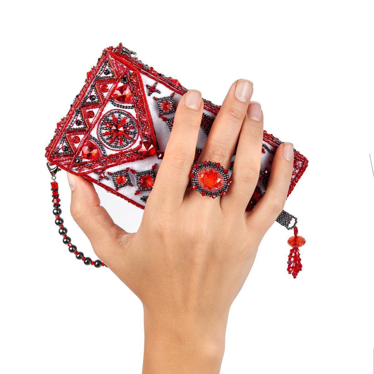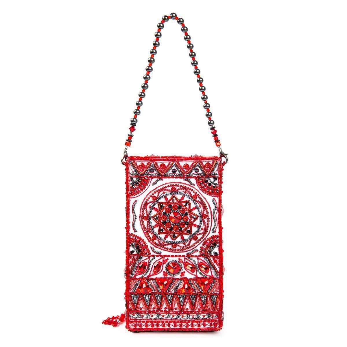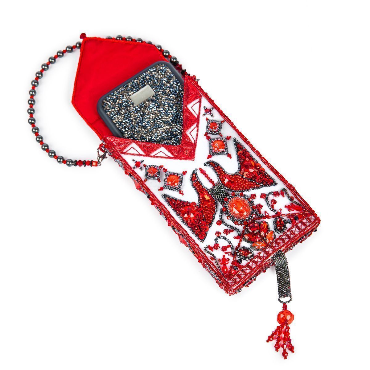 Таким вдохновляющим орнаментальным декором в стиле мезенской росписи я решила украсить небольшую сумочку для мобильного телефона. Для большей оригинальности основной кристалл подвижен на сплетённом из бисера узком пояске и таким образом на вашей руке образуется сверкающий перстень, а сумочка полностью помещается в ладони, при этом небольшую ручку можно убрать при помощи карабинов.