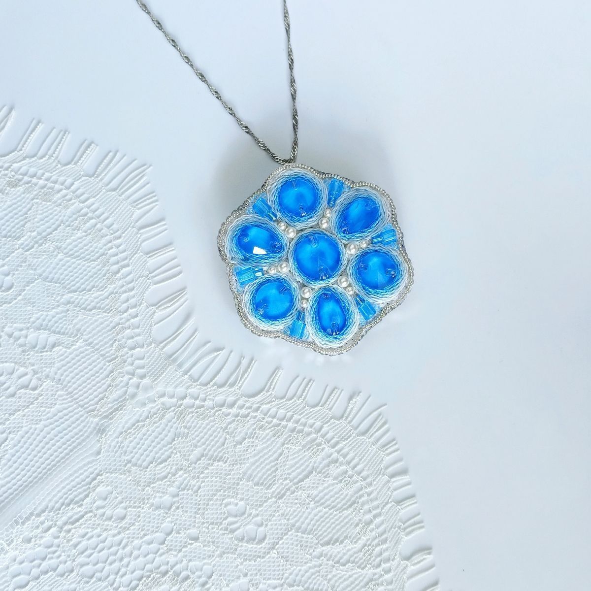 Также при изготовлении броши использованы металлизированные нитки мулине, жемчуг Swarovski двух размеров, цилиндрические бусины и бисер голубого цвета, жёсткая канитель. Изнанка у броши из белой натуральной кожи. На обратной стороне есть небольшое колечко, поэтому изделие можно использовать и в качестве кулона.