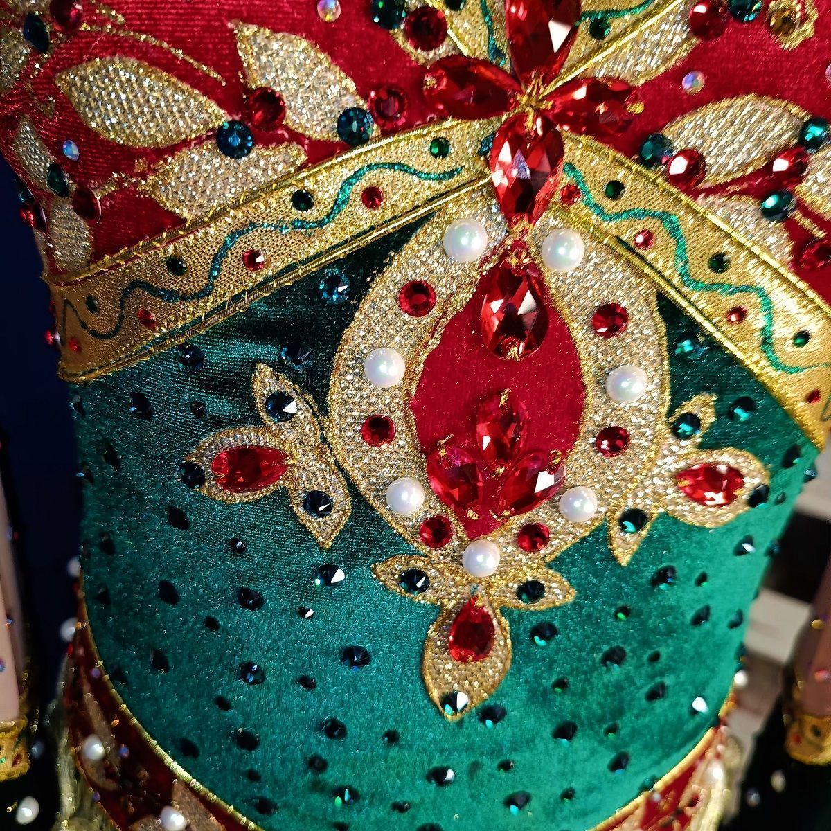 Тема традиций очевидно прослеживается в моей работе. Красно-зелено-золотая цветовая палитра и флористические элементы – яркие символы русского орнаментального стиля. Золотая бахрома, бархат, сияние камней и жемчуга придают образу имперский шик, отражающий роскошь царского убранства.