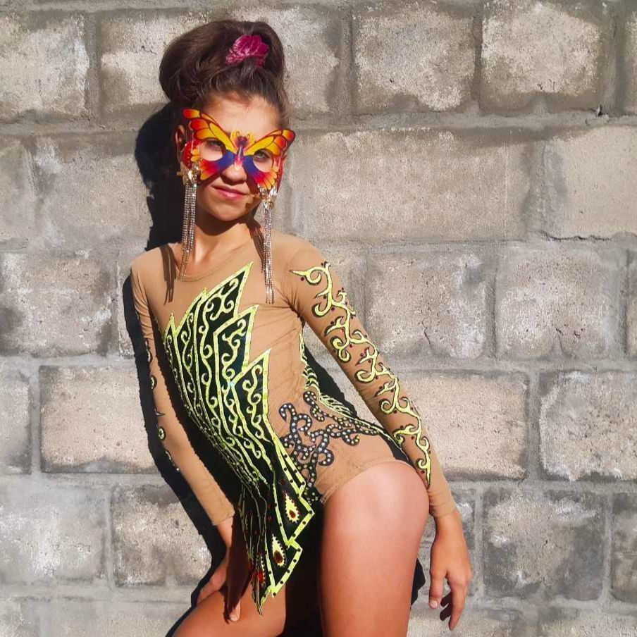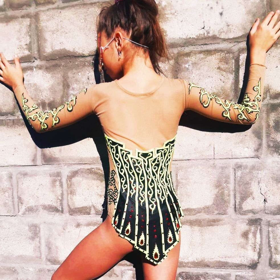 В моей работе в основе лежат узоры. Я не стала склоняться к какому либо национальному колориту, так как узоры есть во всех национальных традициях, часто очень похожих друг на друга, но отличающихся по цвету и их изображению, поэтому мои узоры имеют цвет лайм на черном бифлексе с имитацией кожи. Узоры на купальнике спереди и на спинке заключены в геометрической основе, а по бокам и на рукавах говорят о том, что можно и нужно выходить за рамки своего ограничения. Стразы расположены только по узорам, чтобы их и только их подчеркнуть.