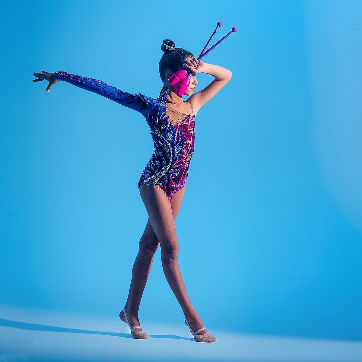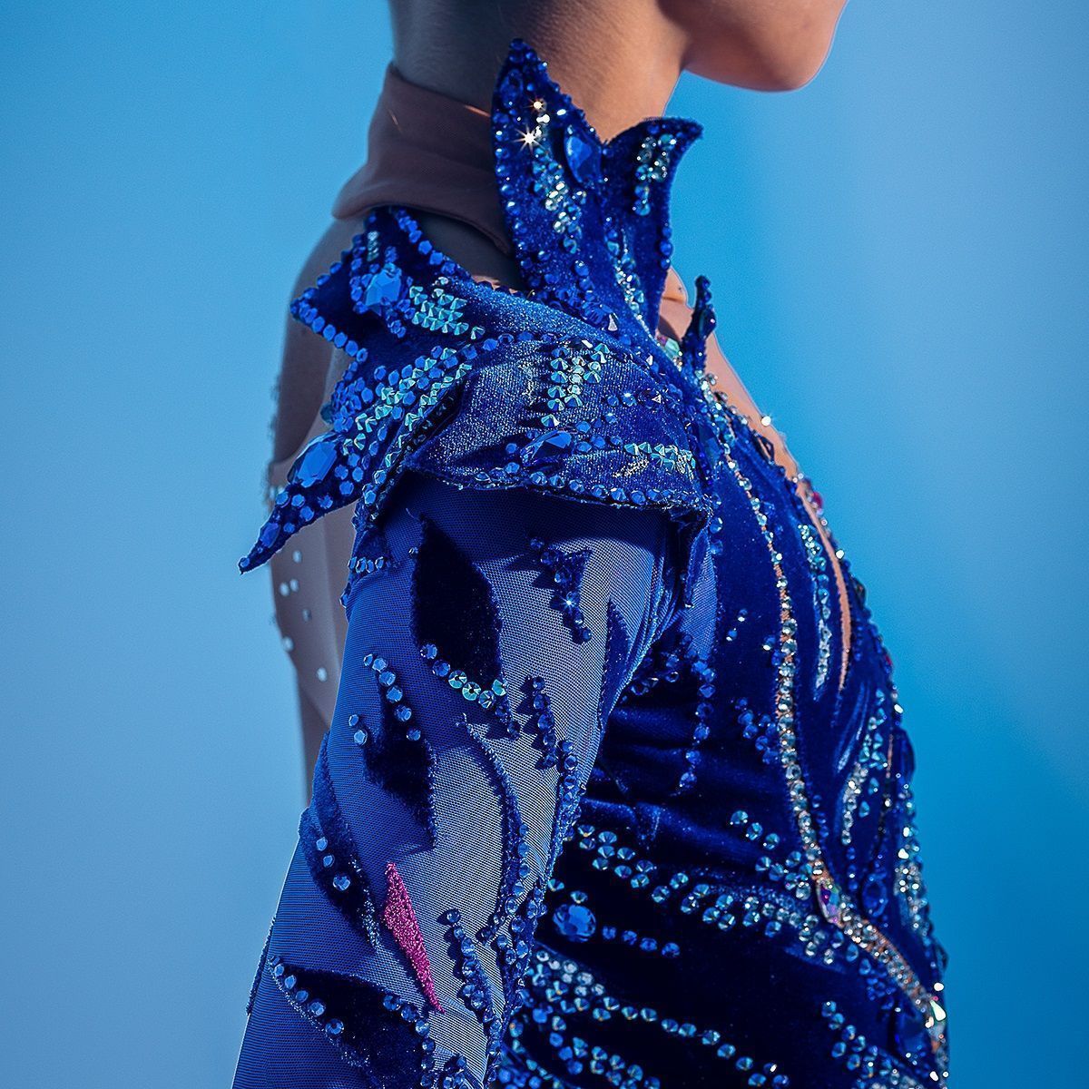 Источником вдохновения для создания данной изделия послужило переплетение образов райской птицы «Сирин», и образа древнего хрустального стеклодувного промысла- стеклоделия. В хрупкости и нестабильности нашего времени, даже при невесомом касании пера может разбиться душа на множество осколков. Но в непредугаданном будущем, через калейдоскоп «острого кружева» родится новая, светлая, чистая душа. Цветовое сочетание изделия выполнено исходя из исконных оттенков образа птицы «Сирин»-(синего и бордового), с учетом модных тенденций в цвете. А также, были учтены такие критерии, как: образ спортсмена, возраст и актуальность атмосфере зала для соревнований.