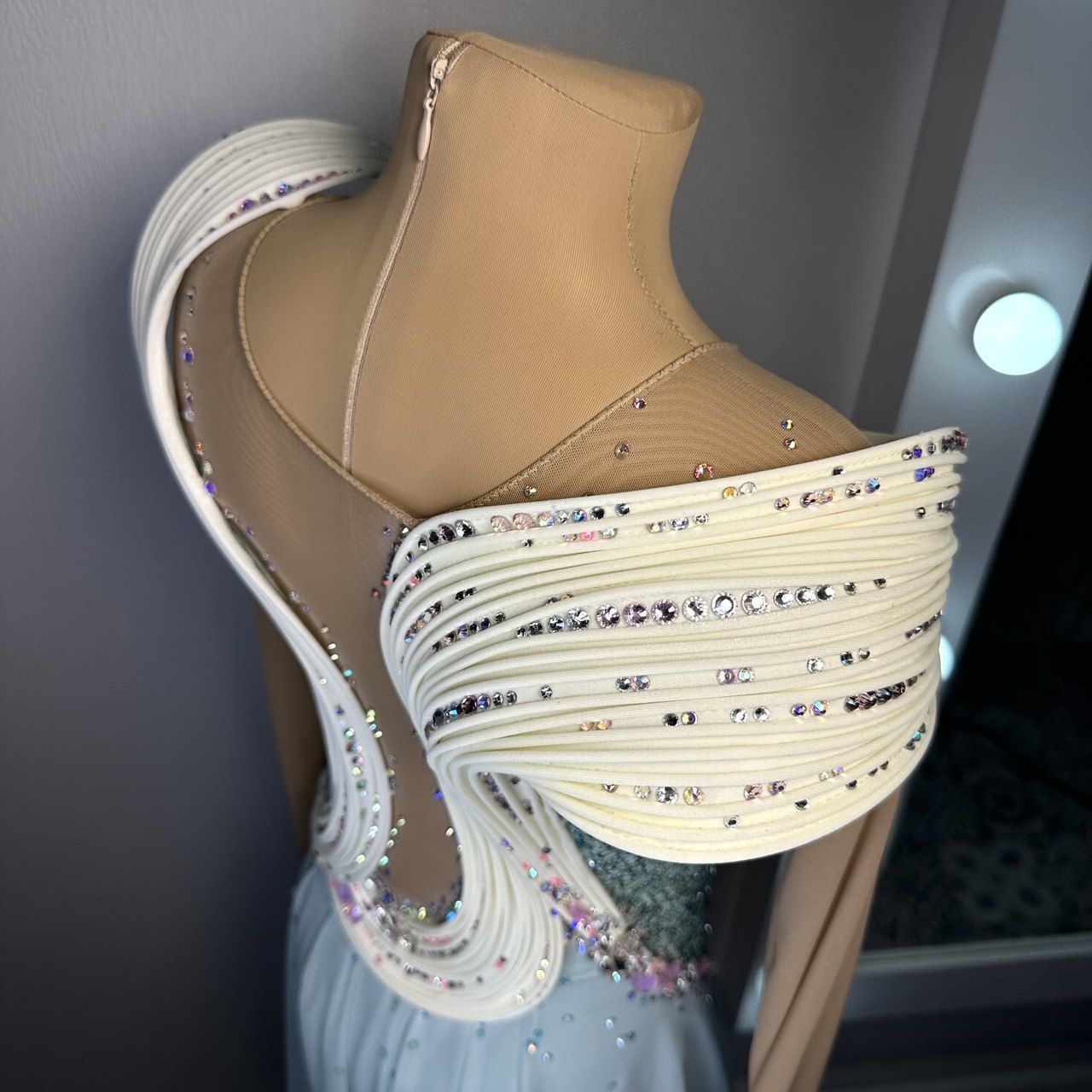 Мы хотели воплотить тонкий образ, сотканный из лёгкости и чистоты. Платье пастельных оттенков словно создано для парения в вальсе. Декоративные элементы подчёркивают хрупкость и изящество. Мы сочиняли оду Юности, перед которой открываются все двери, при взгляде на которую замирает дыхание...