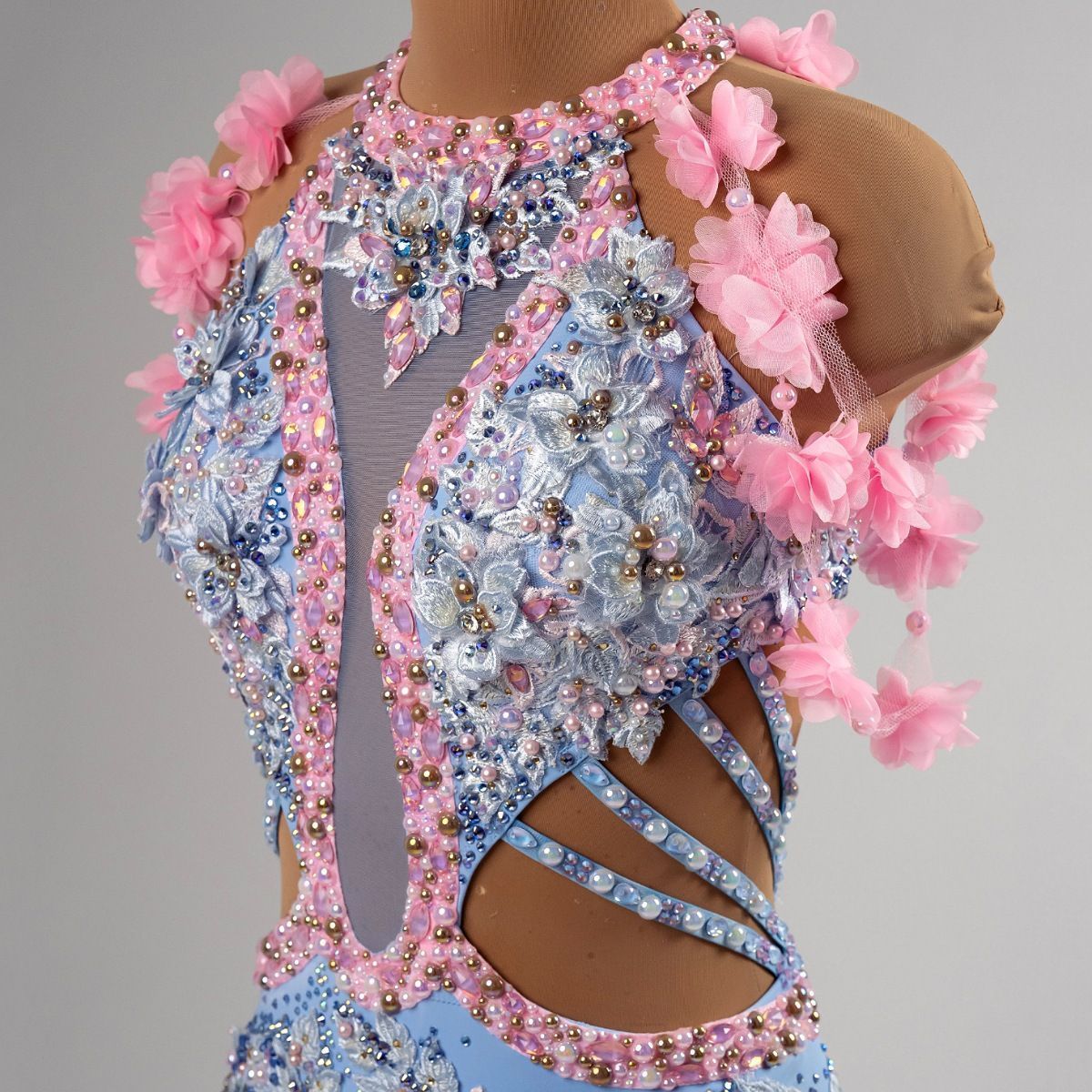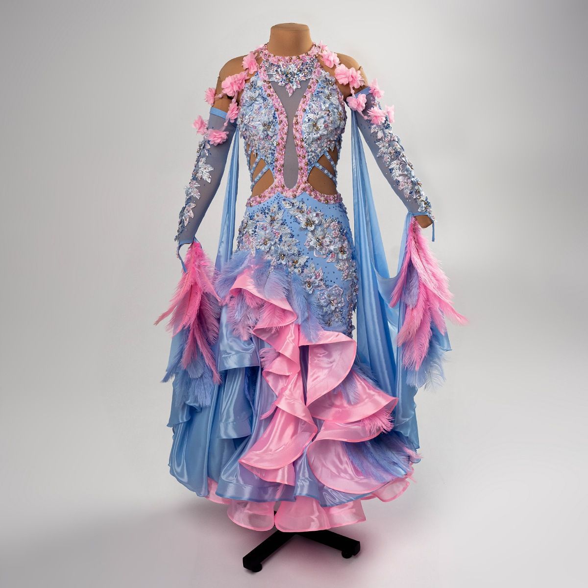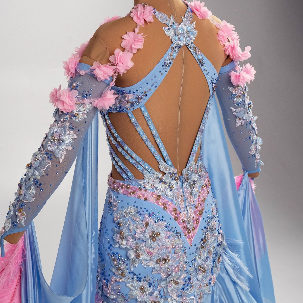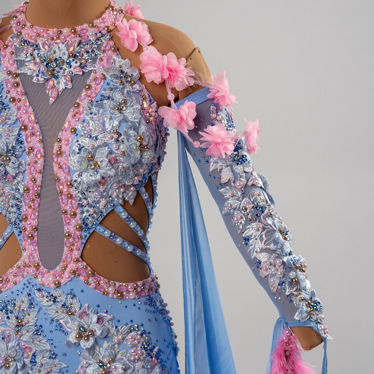 Это платье раскрывает тему конкурса, являясь гармоничным союзом классики и современности, отражая вечное искусство танца, где движения плавны, а образы — нежны и элегантны. Голубой цвет выражает спокойствие и благородство, а розовый — теплоту чувств и романтику. Кружево добавляет изысканной утонченности, создавая эффект лёгкости и воздушности, необходимой для красивого исполнения европейской программы.