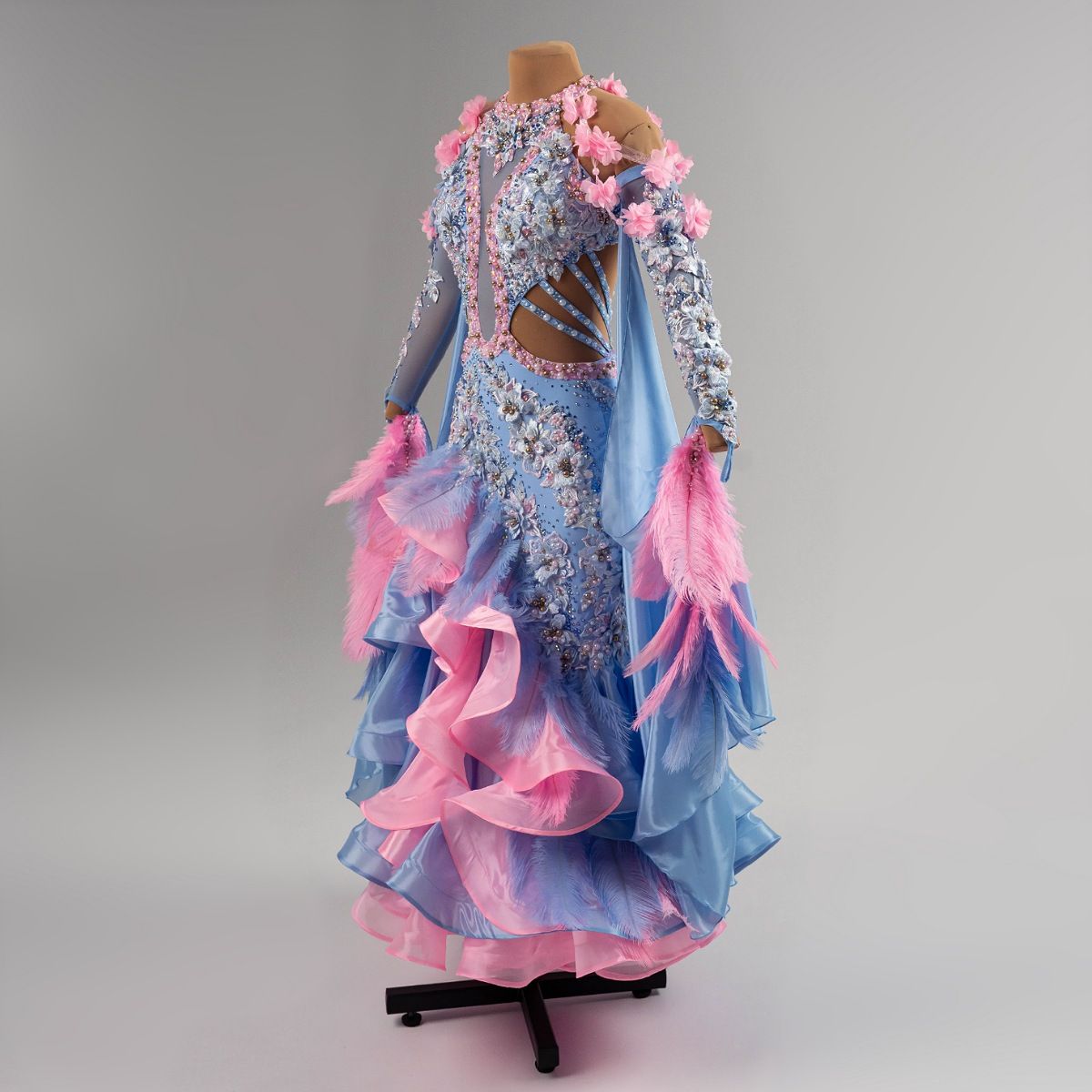 Платье «Нежность в танце» воплощает дух венского бала через сочетание голубого и розового — цветов, которые символизируют романтику, свет и грацию. Использование кружевных деталей подчеркивает изящность и традиции европейской бальной моды, добавляя изделию лёгкость и воздушность.