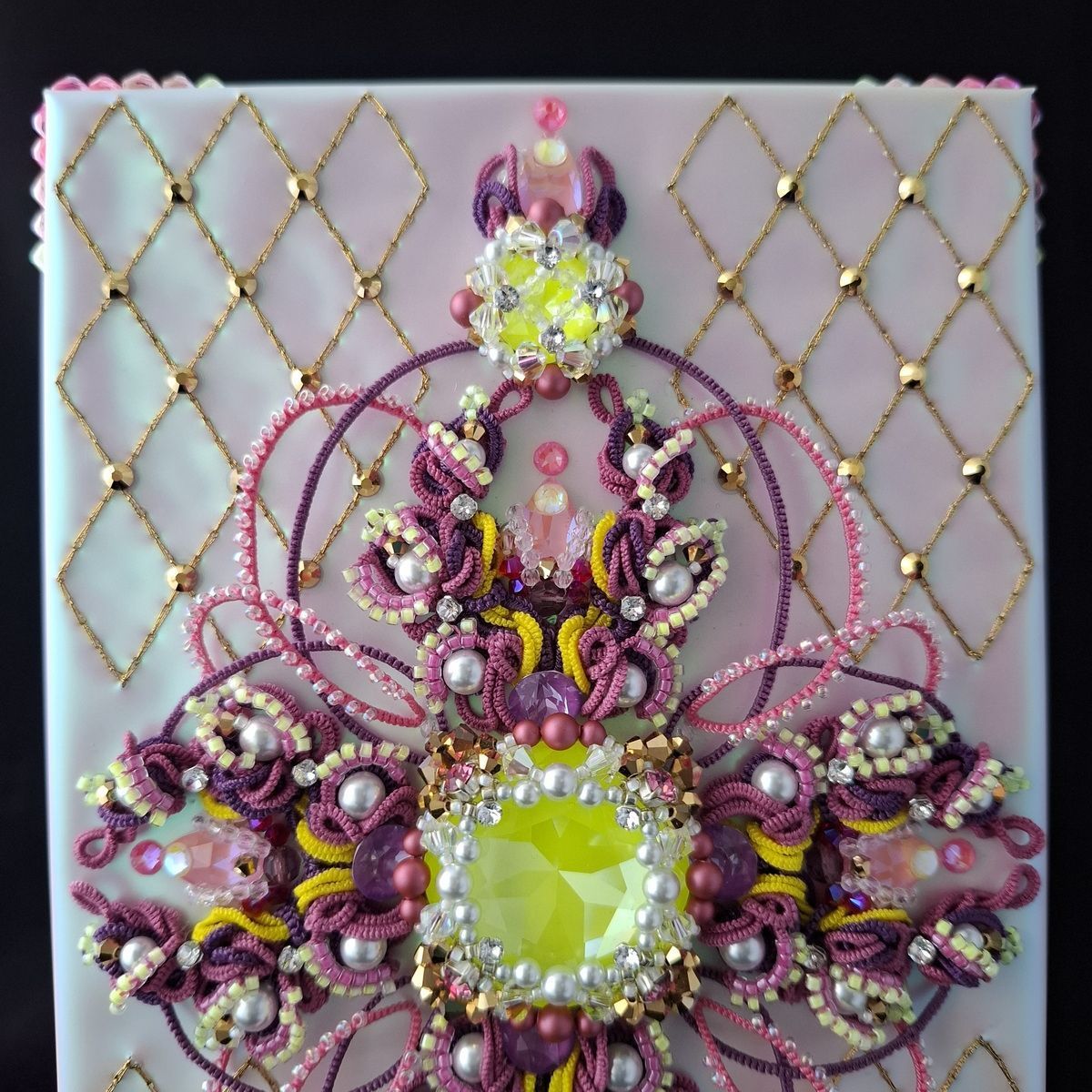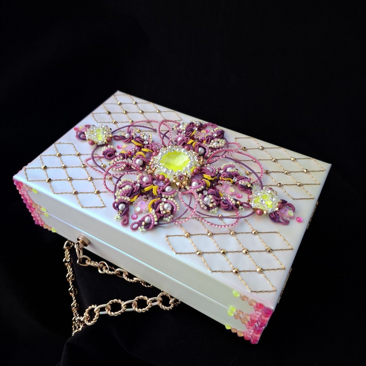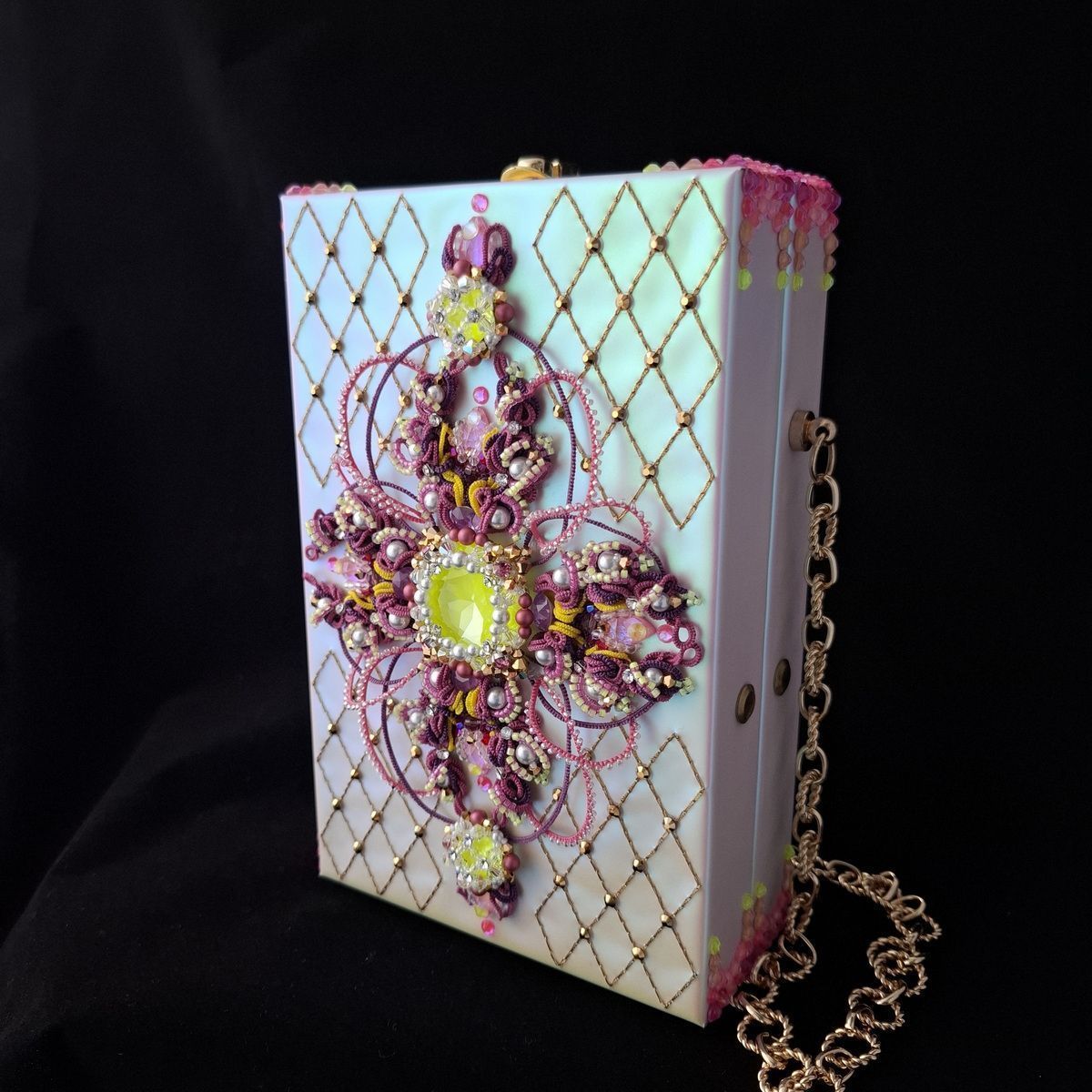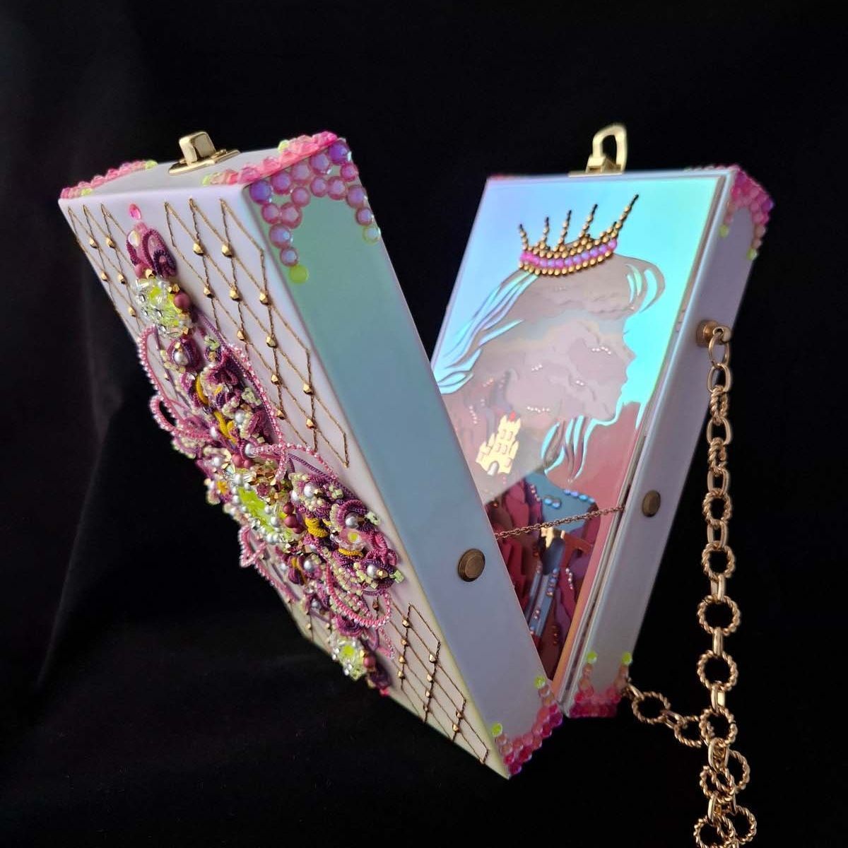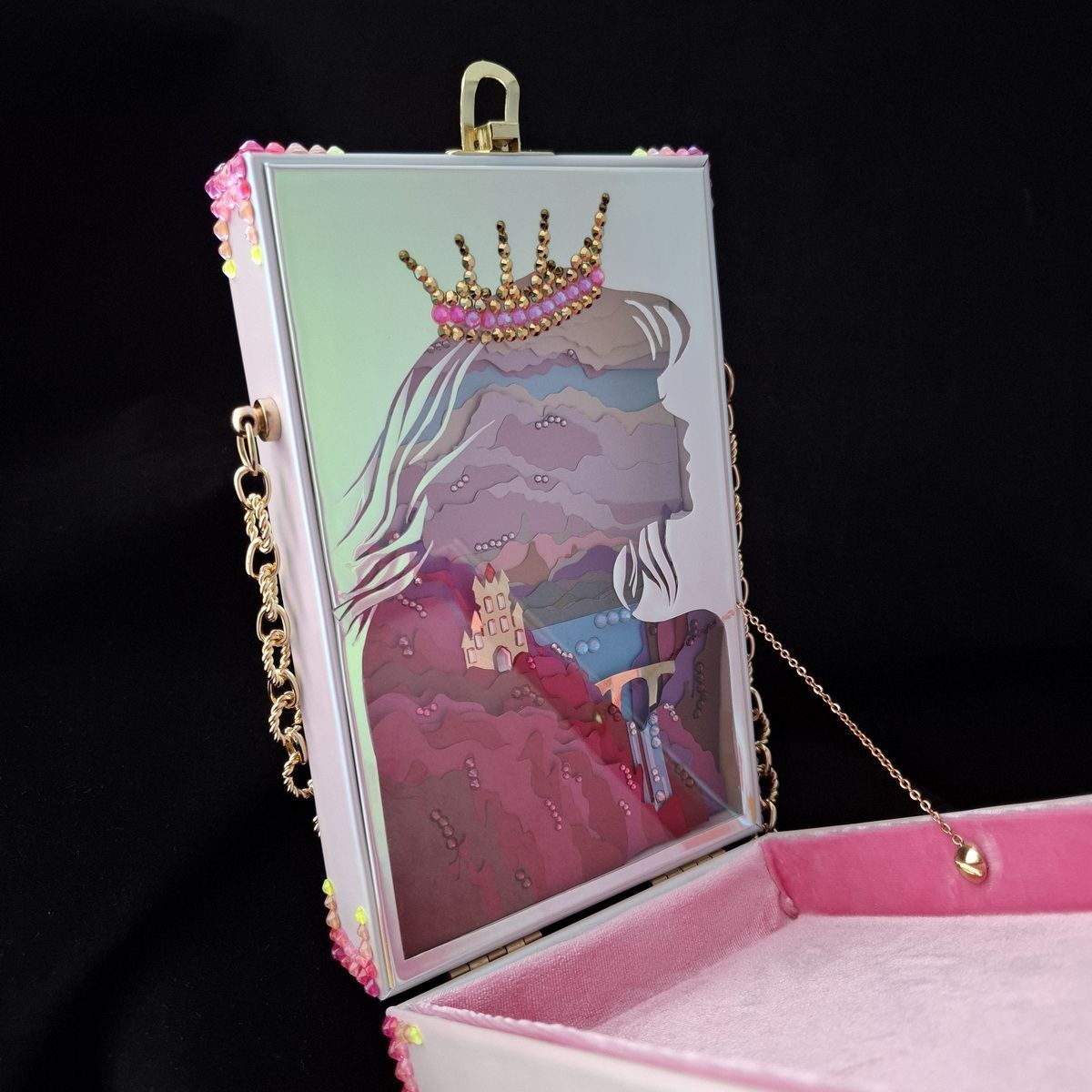 Клатчбокс украшен объемным кружевом фриволите и кристаллами. Внутри спрятан пейзаж с замком, выполненный в стиле объемных иллюстраций из книги сказок, и музыкальный механизм, превращающий клатчбокс в музыкальную шкатулку.