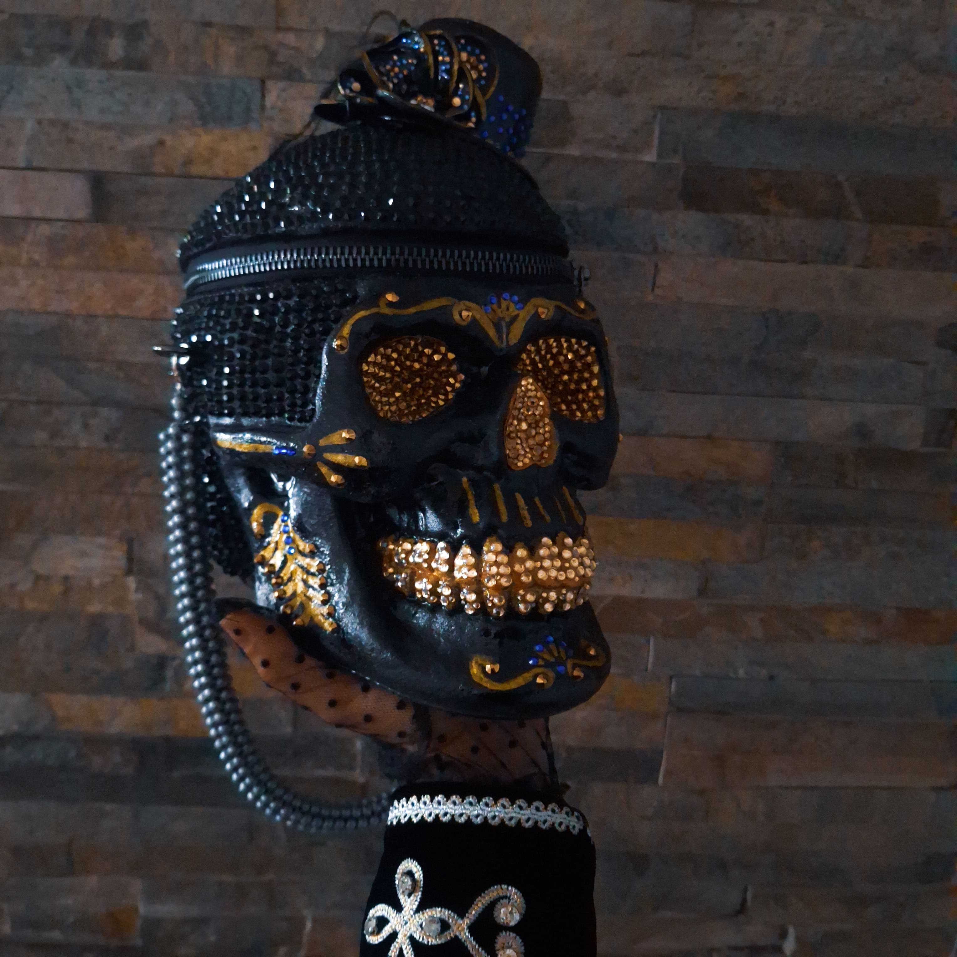 Череп, украшенный камнями и орнаментами, сияет словно бальный зал, отражая блеск свечей и роскошь веков. Но на его обратной стороне бисером вышита надпись memento mori — напоминание о том, что красота и жизнь мимолётны.