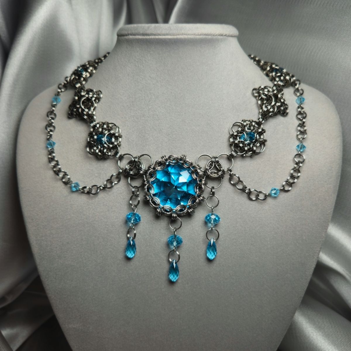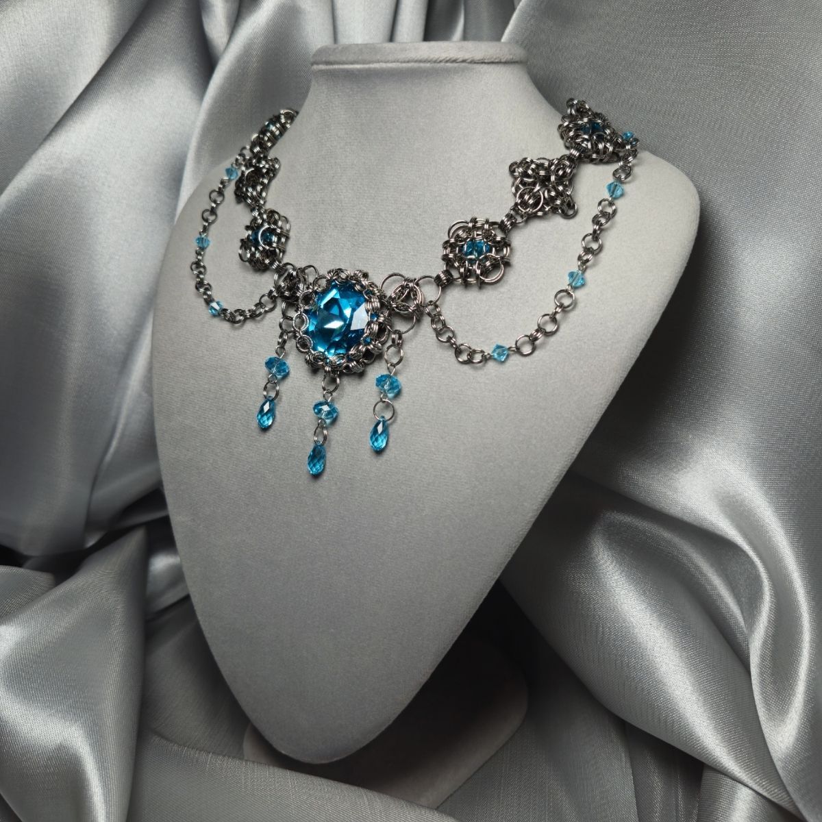 В моём колье большое количество кристаллов Сваровски такого же голубого цвета, как глаза Ундины. Они олицетворяют родную стихию девы и её слезы от разбитого сердца. Сталь в украшении передаёт смелый, стойкий характер и внутреннюю силу героини, которая позволила ей не только простить мужа, но и убить его, даруя освобождение.